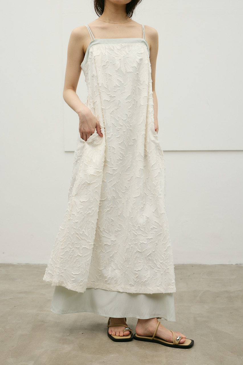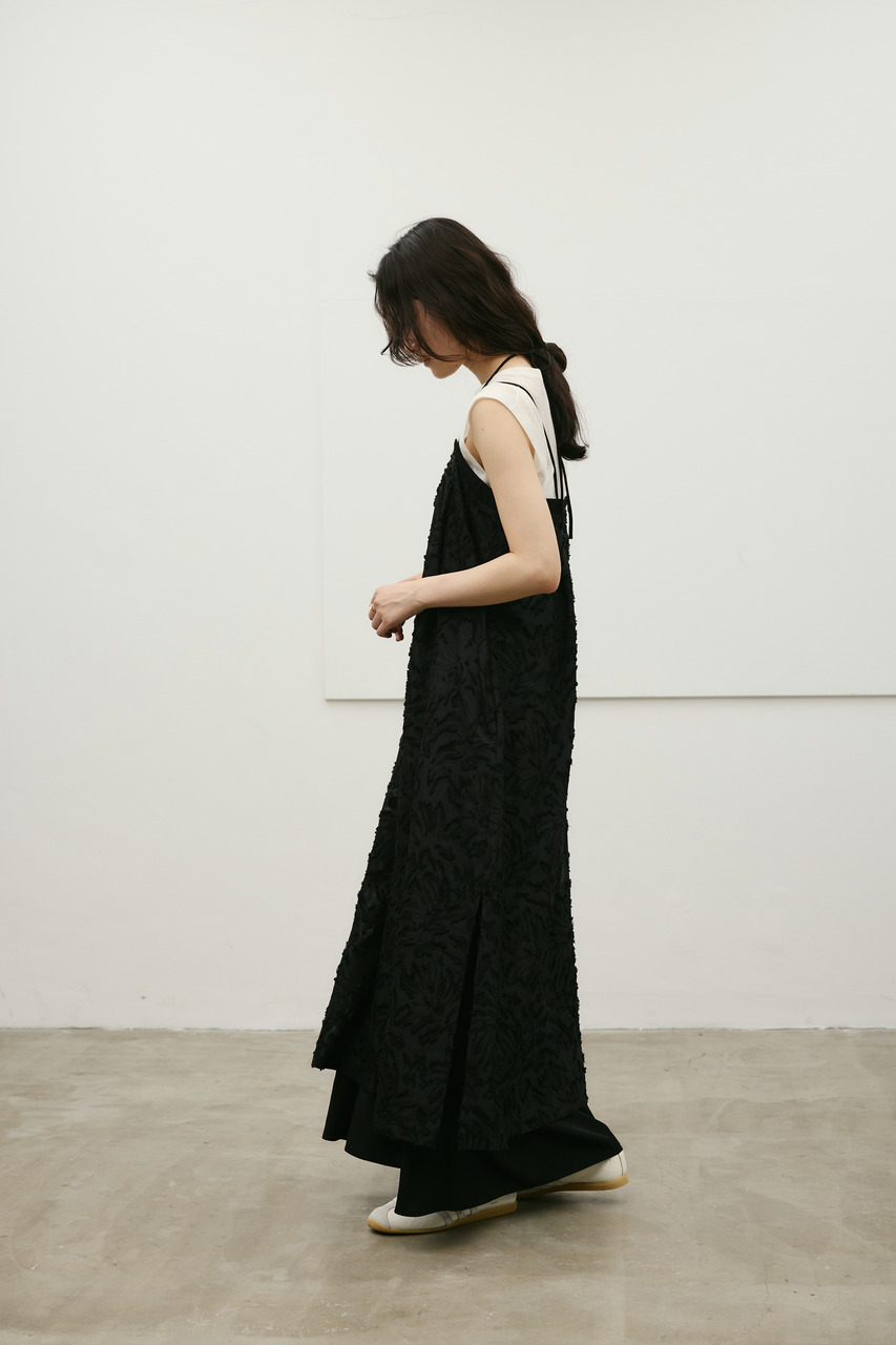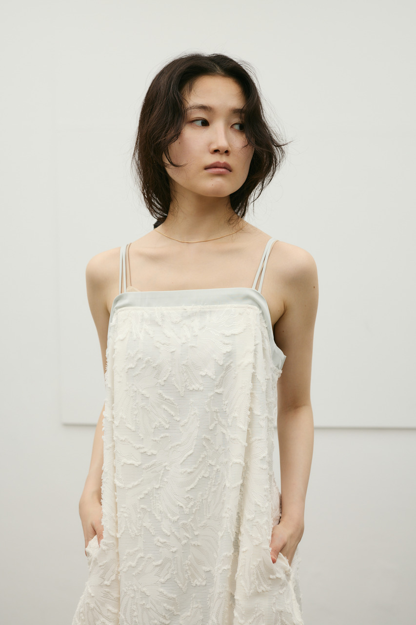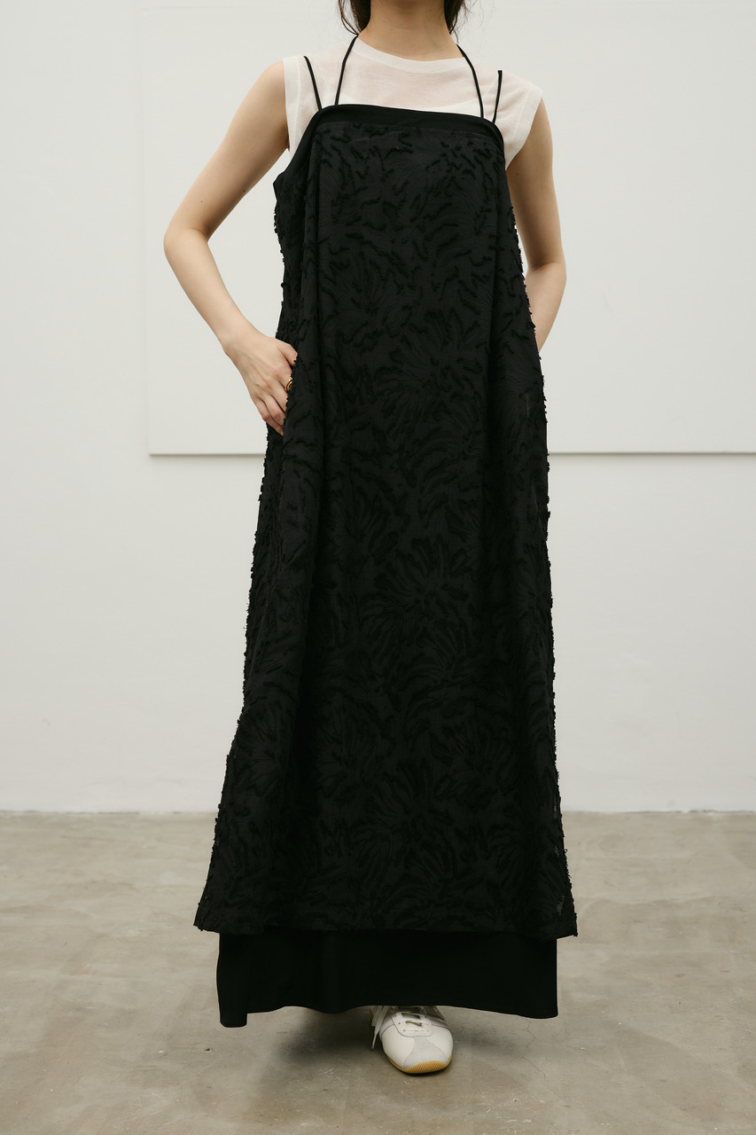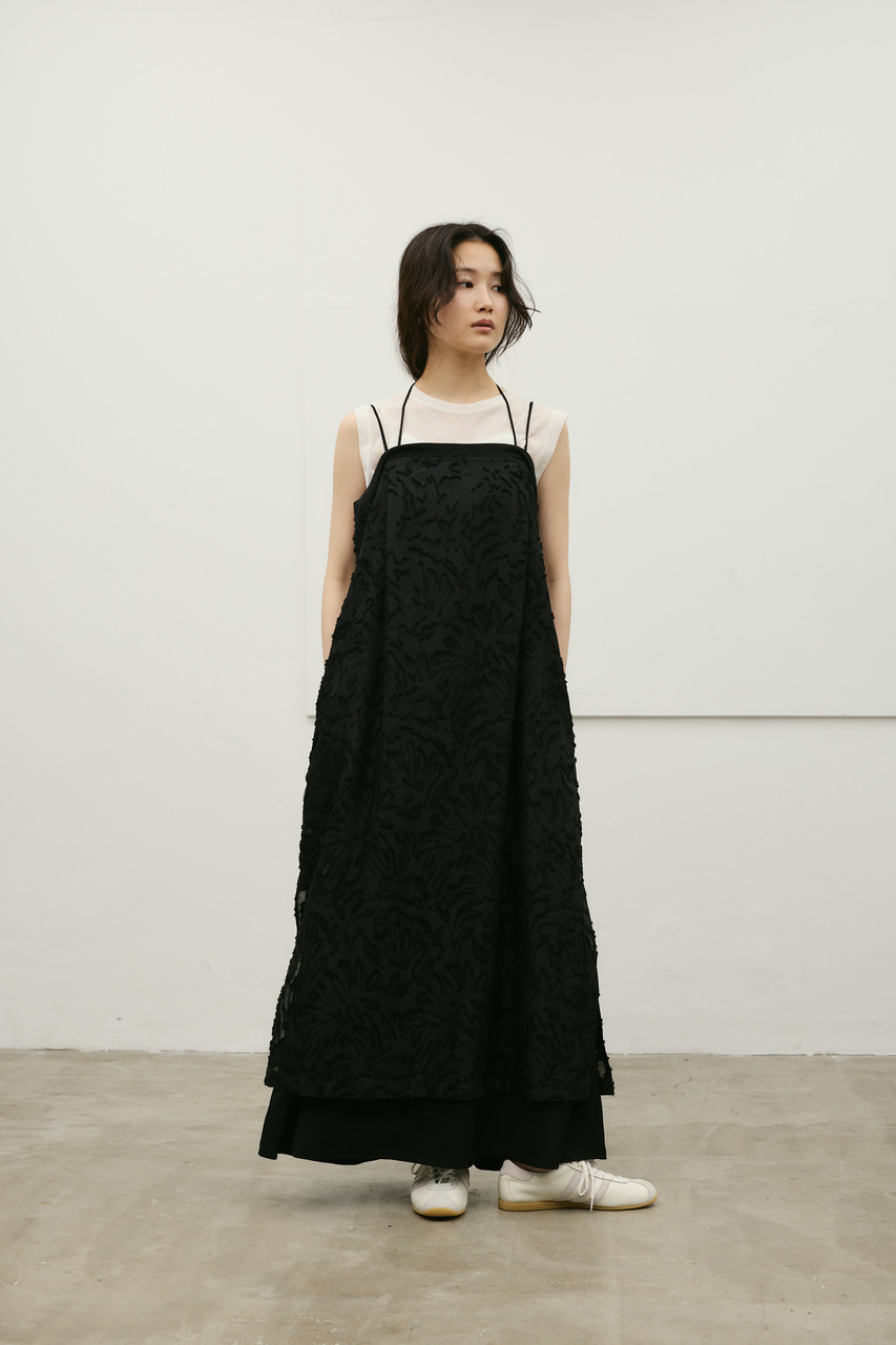 華やかで奥行きのある花柄ジャガードレースを主役にしたキャミソールワンピース。存在感のある素材に、軽やかな別布をレイヤードすることで、歩くたびに内側の生地がさりげなく現れ、スタイリングに動きと奥行きを与えます。胸元にはタックを施し、ミニマルな中に立体的なニュアンスをプラス。裾にかけて広がるボリュームシルエットが、静かな存在感と女性らしさを引き立てます。肩紐調節可能。透け感なし、ストレッチなし。