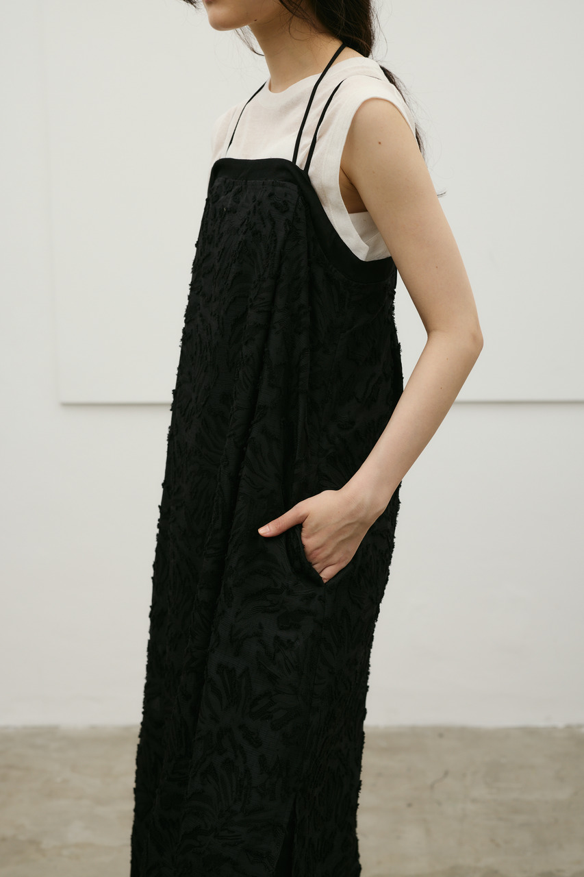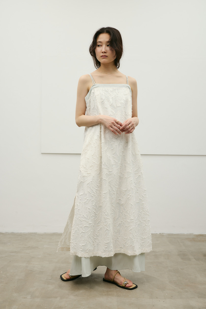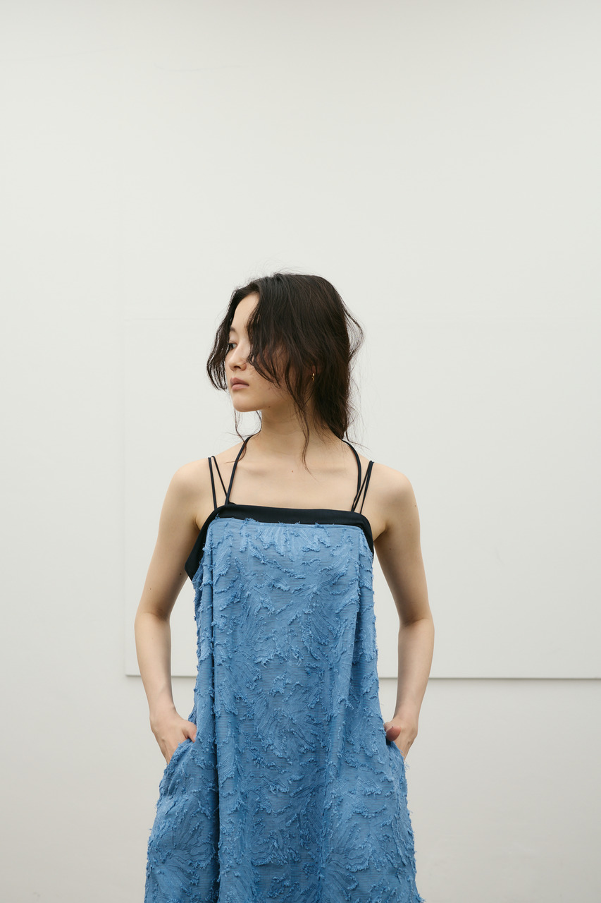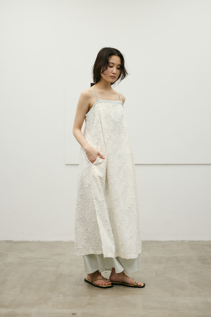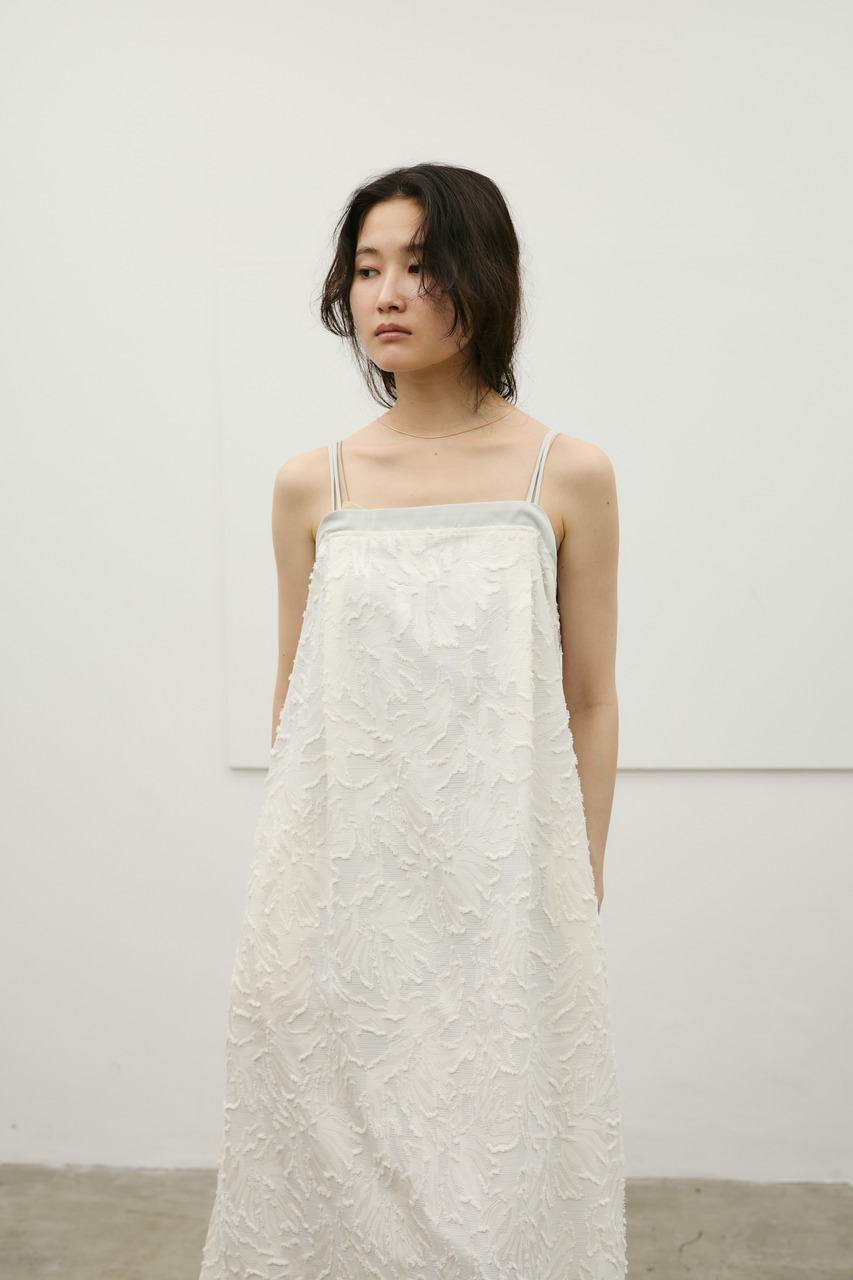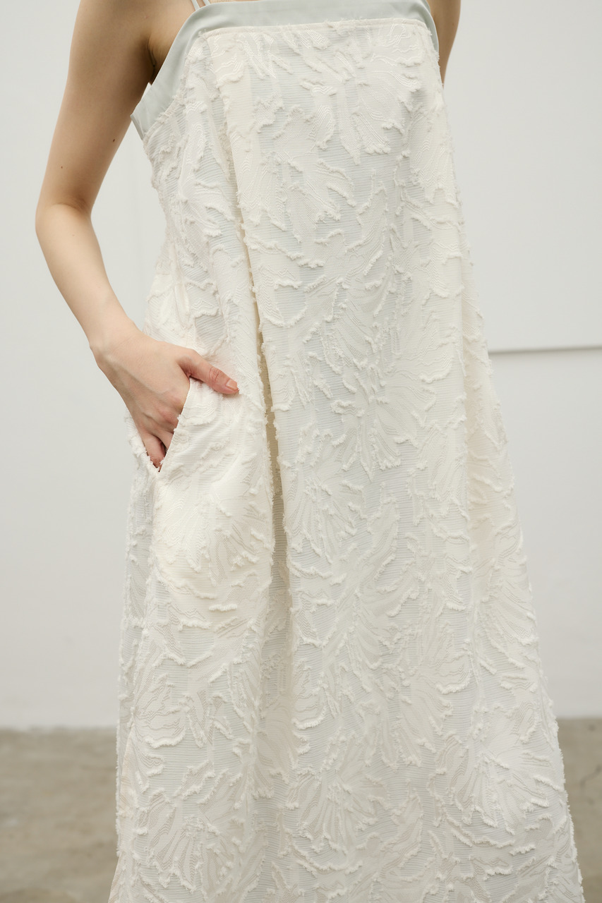 華やかで奥行きのある花柄ジャガードレースを主役にしたキャミソールワンピース。存在感のある素材に、軽やかな別布をレイヤードすることで、歩くたびに内側の生地がさりげなく現れ、スタイリングに動きと奥行きを与えます。胸元にはタックを施し、ミニマルな中に立体的なニュアンスをプラス。裾にかけて広がるボリュームシルエットが、静かな存在感と女性らしさを引き立てます。肩紐調節可能。透け感なし、ストレッチなし。