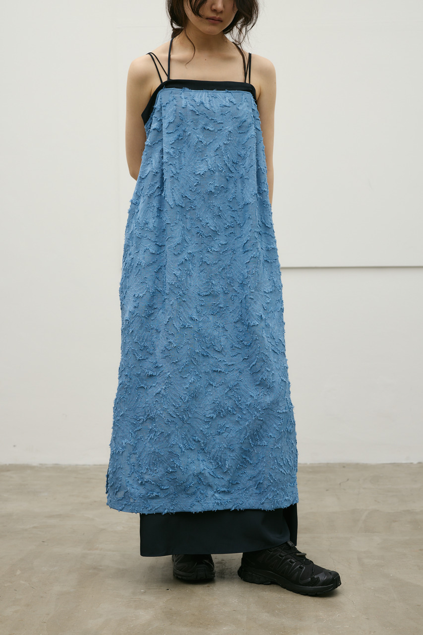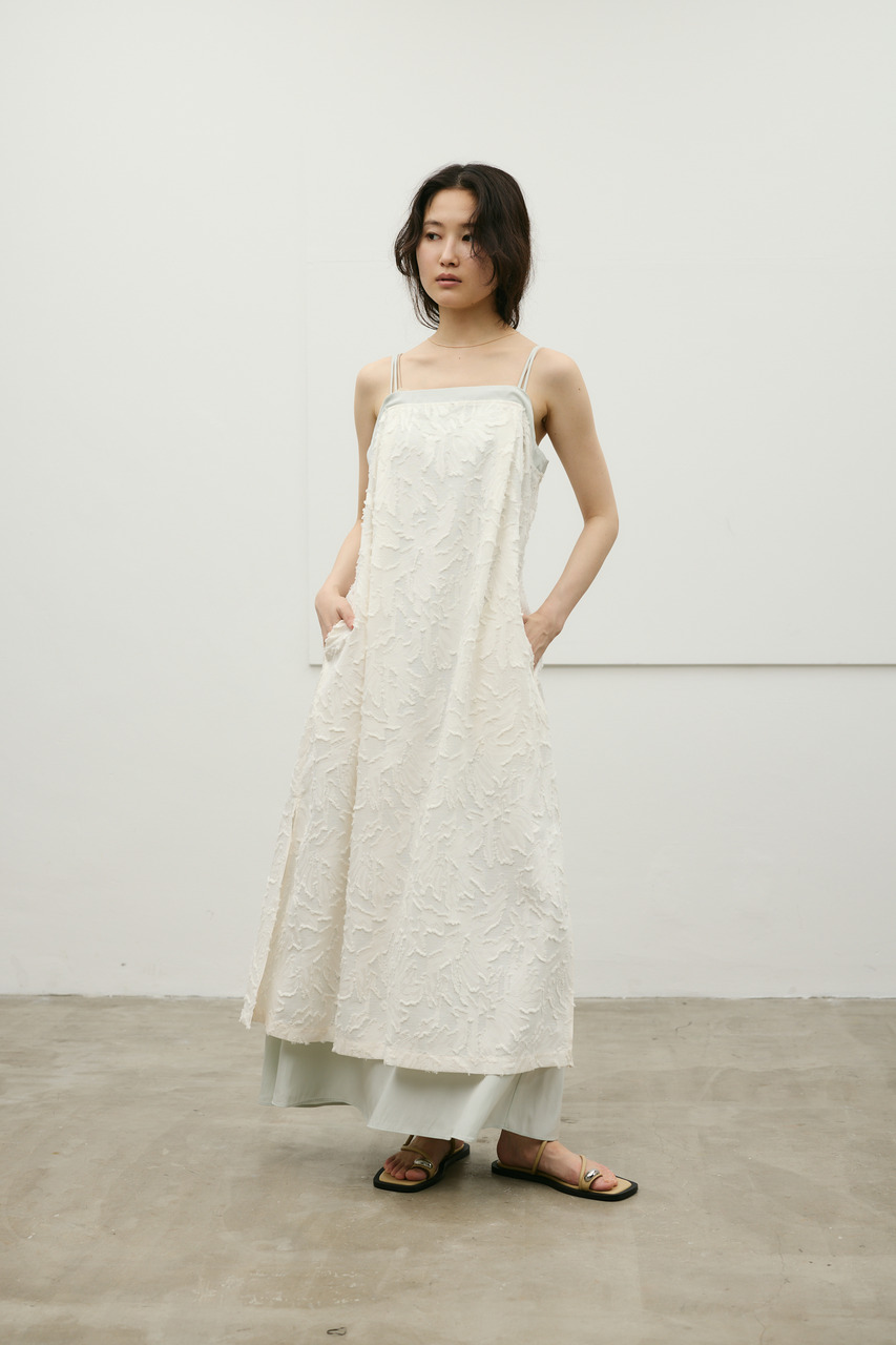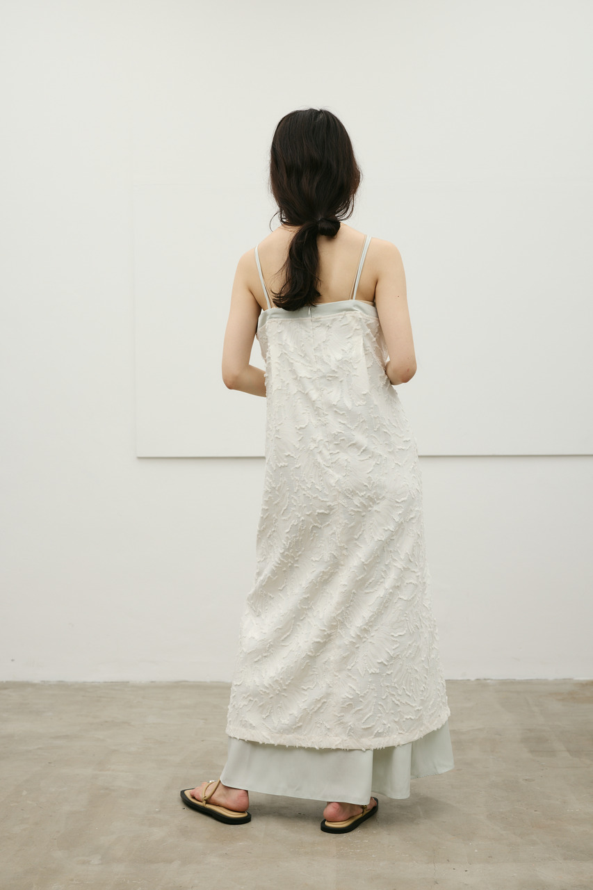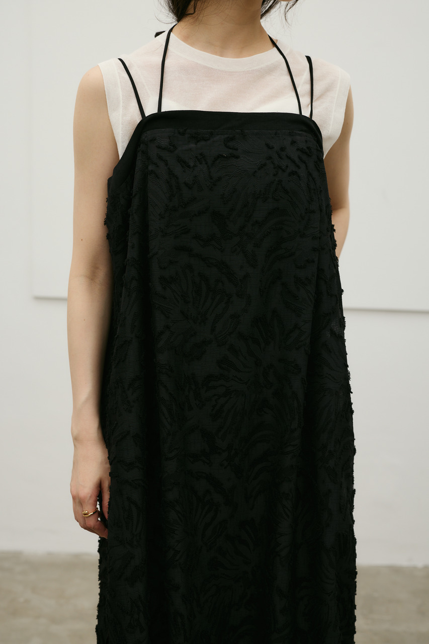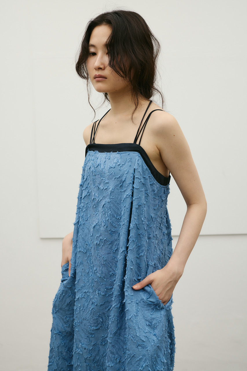 華やかで奥行きのある花柄ジャガードレースを主役にしたキャミソールワンピース。存在感のある素材に、軽やかな別布をレイヤードすることで、歩くたびに内側の生地がさりげなく現れ、スタイリングに動きと奥行きを与えます。胸元にはタックを施し、ミニマルな中に立体的なニュアンスをプラス。裾にかけて広がるボリュームシルエットが、静かな存在感と女性らしさを引き立てます。肩紐調節可能。透け感なし、ストレッチなし。