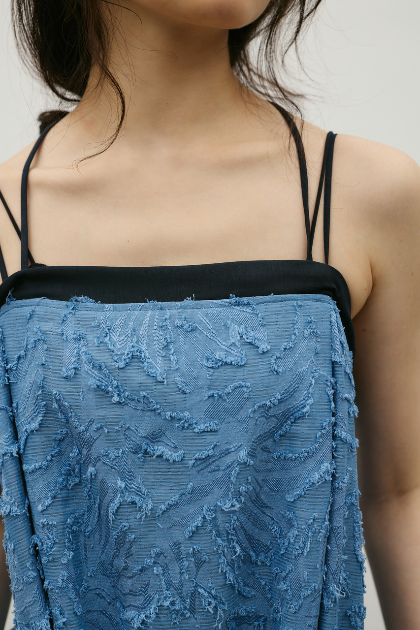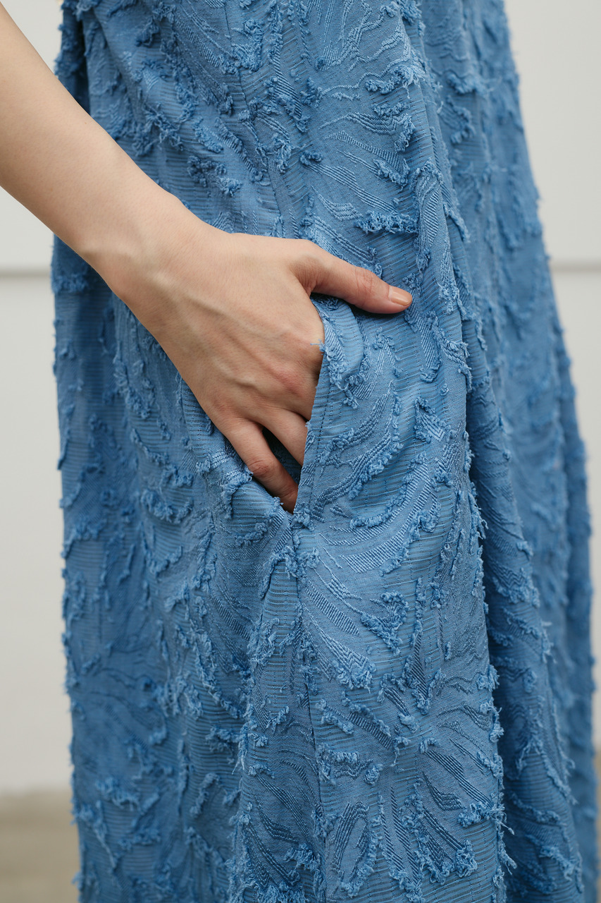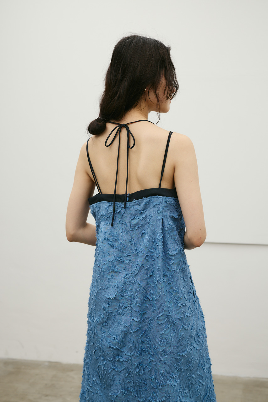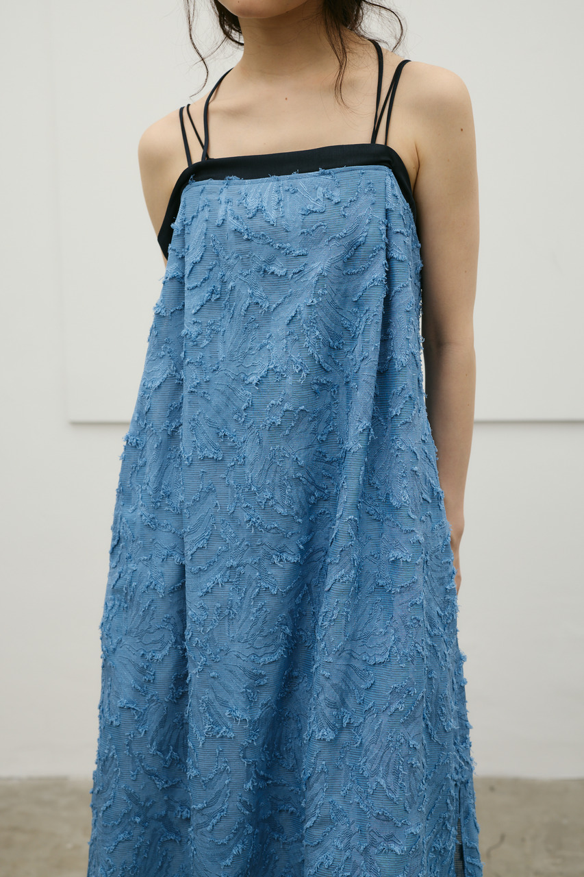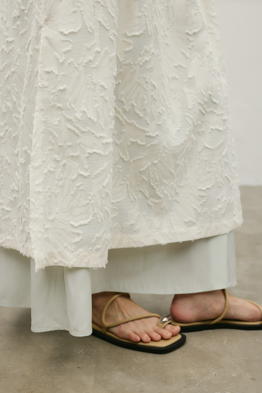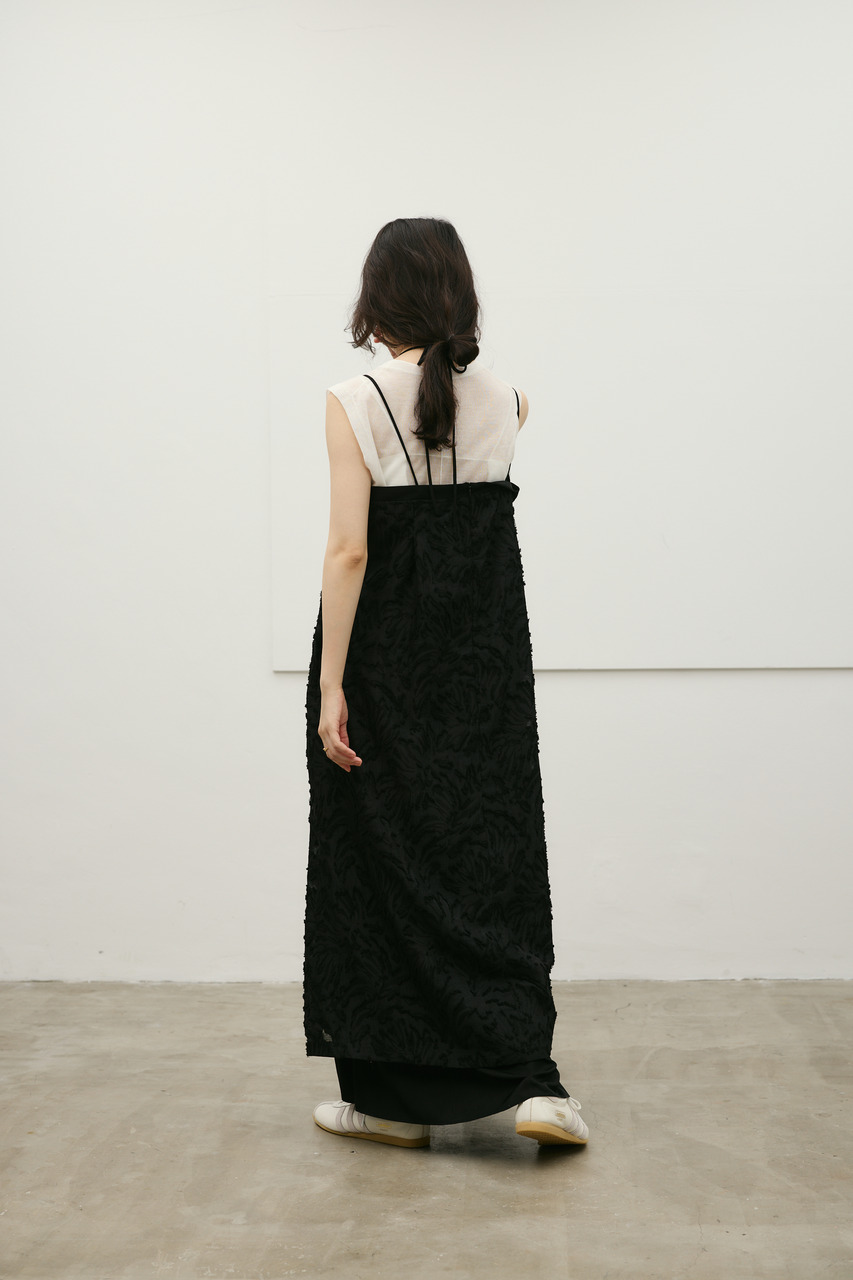 華やかで奥行きのある花柄ジャガードレースを主役にしたキャミソールワンピース。存在感のある素材に、軽やかな別布をレイヤードすることで、歩くたびに内側の生地がさりげなく現れ、スタイリングに動きと奥行きを与えます。胸元にはタックを施し、ミニマルな中に立体的なニュアンスをプラス。裾にかけて広がるボリュームシルエットが、静かな存在感と女性らしさを引き立てます。肩紐調節可能。透け感なし、ストレッチなし。