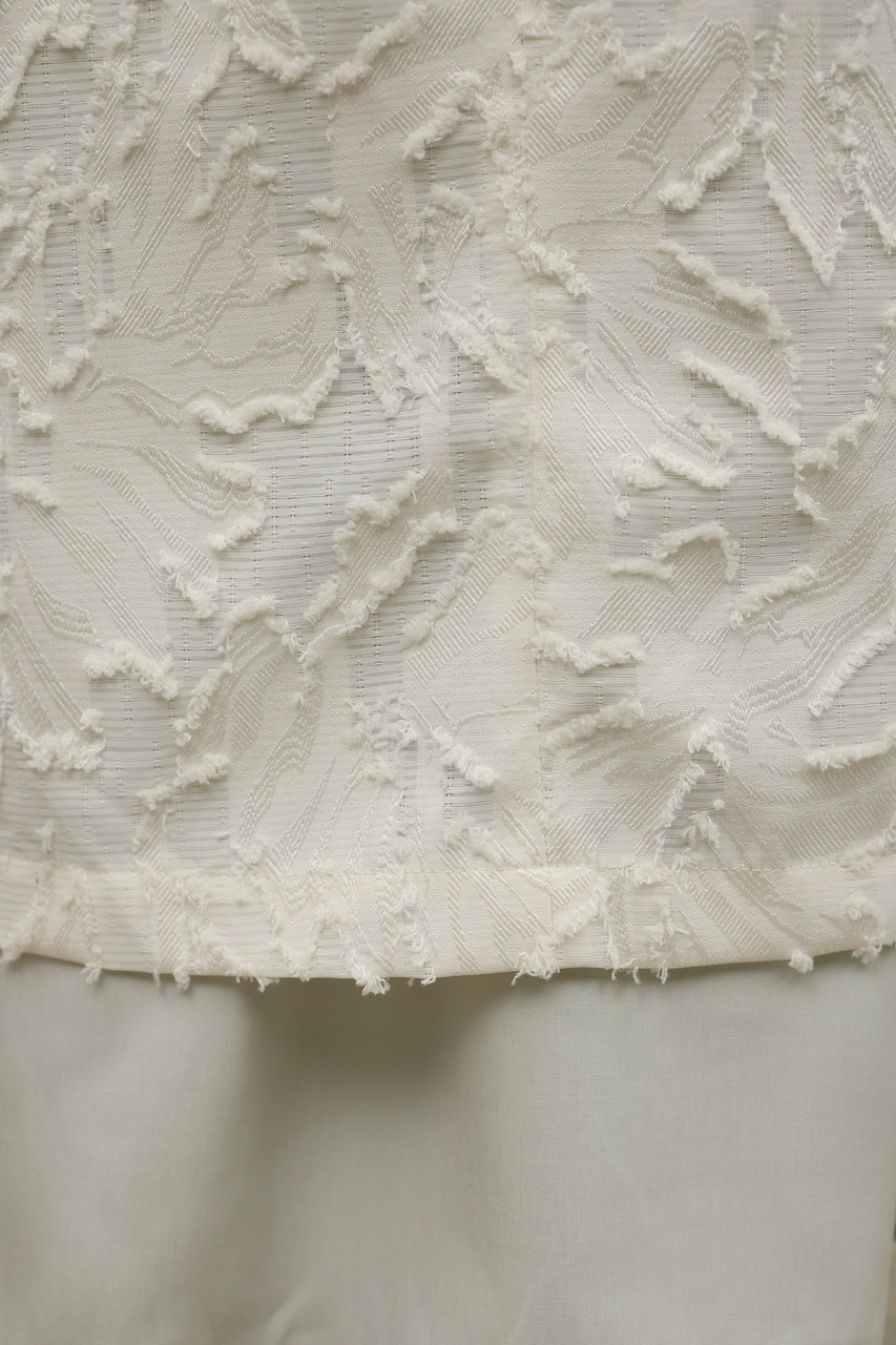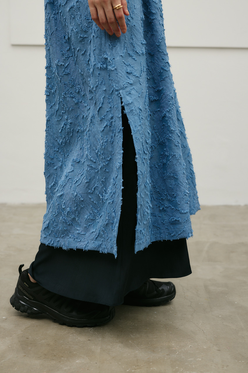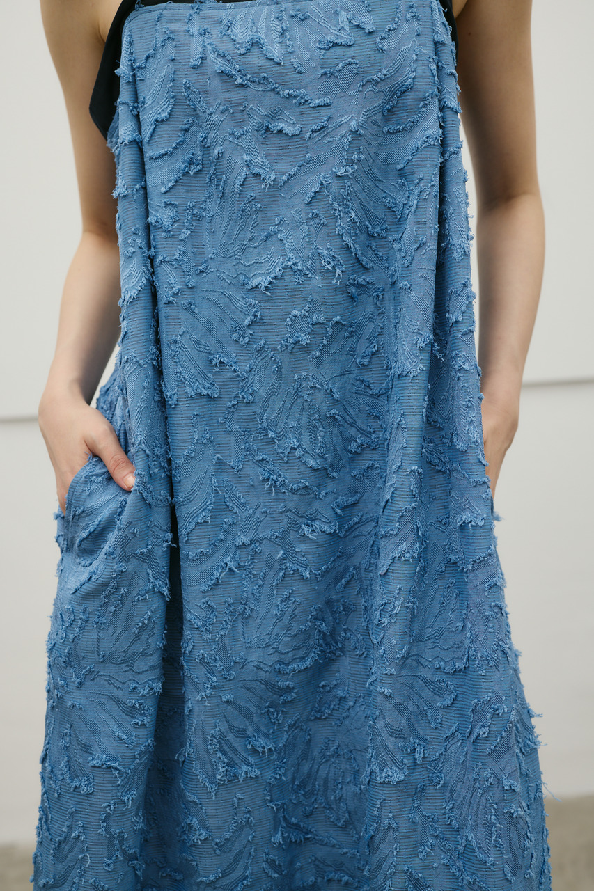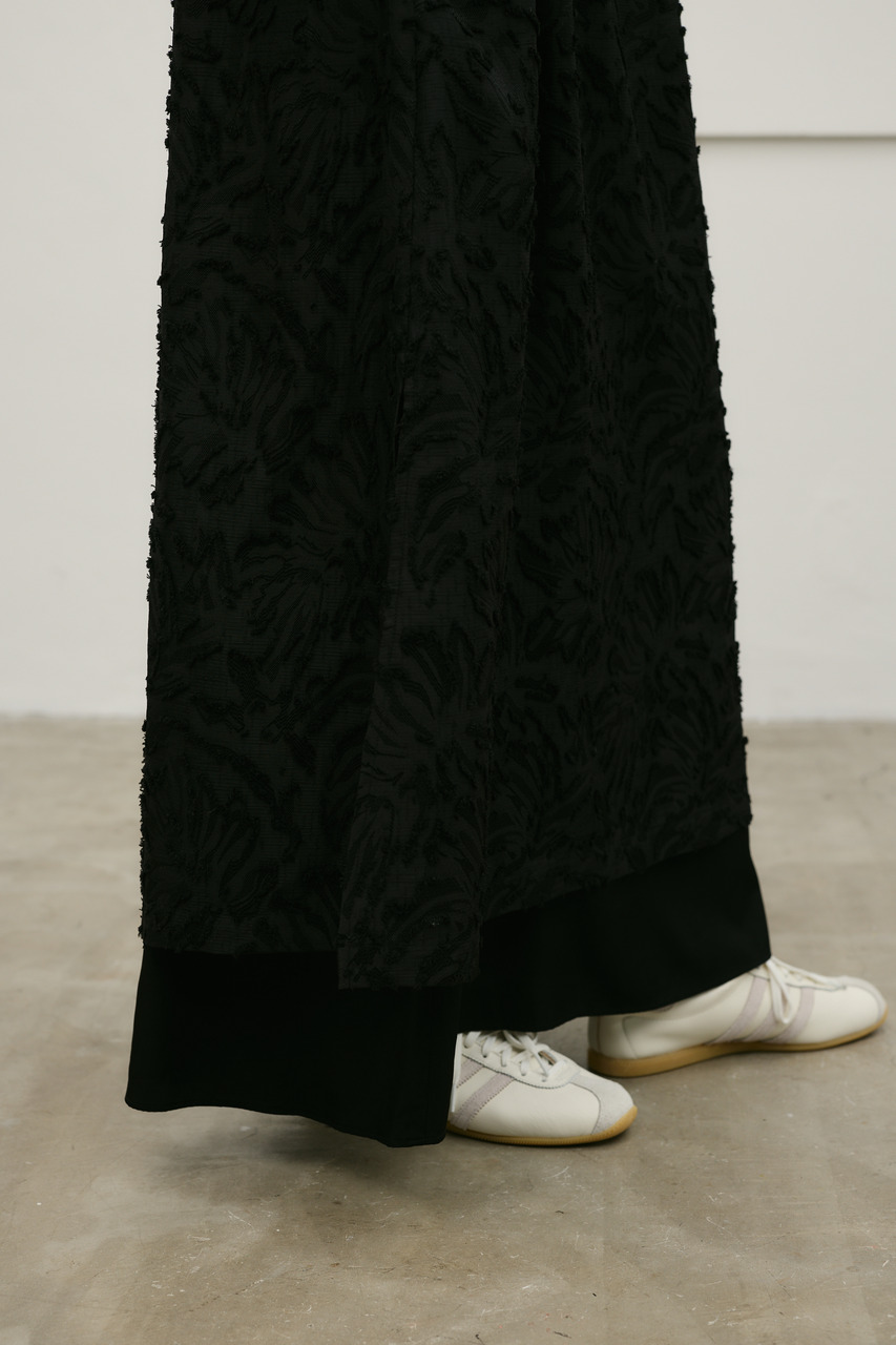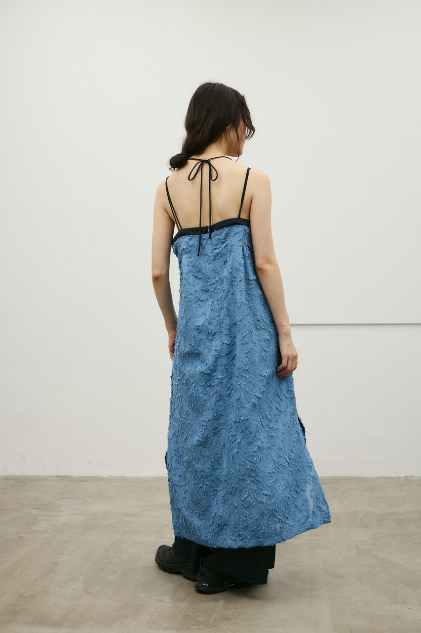 華やかで奥行きのある花柄ジャガードレースを主役にしたキャミソールワンピース。存在感のある素材に、軽やかな別布をレイヤードすることで、歩くたびに内側の生地がさりげなく現れ、スタイリングに動きと奥行きを与えます。胸元にはタックを施し、ミニマルな中に立体的なニュアンスをプラス。裾にかけて広がるボリュームシルエットが、静かな存在感と女性らしさを引き立てます。肩紐調節可能。透け感なし、ストレッチなし。