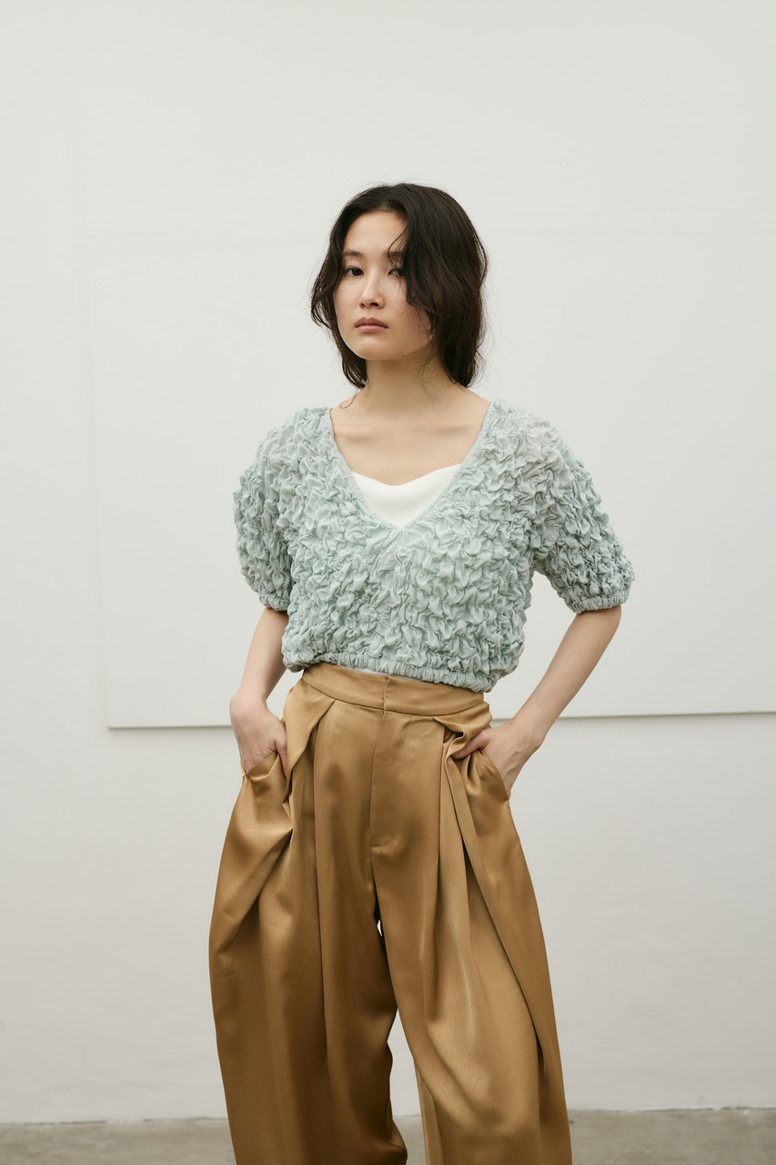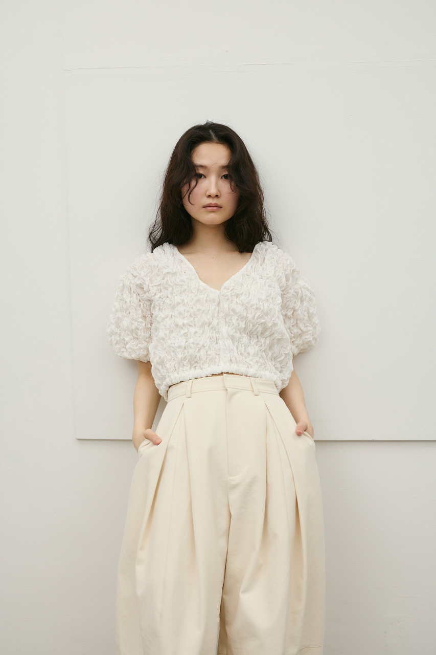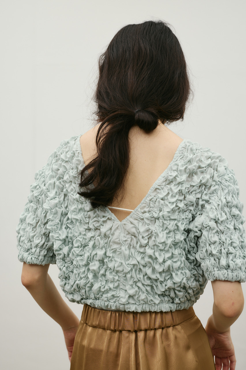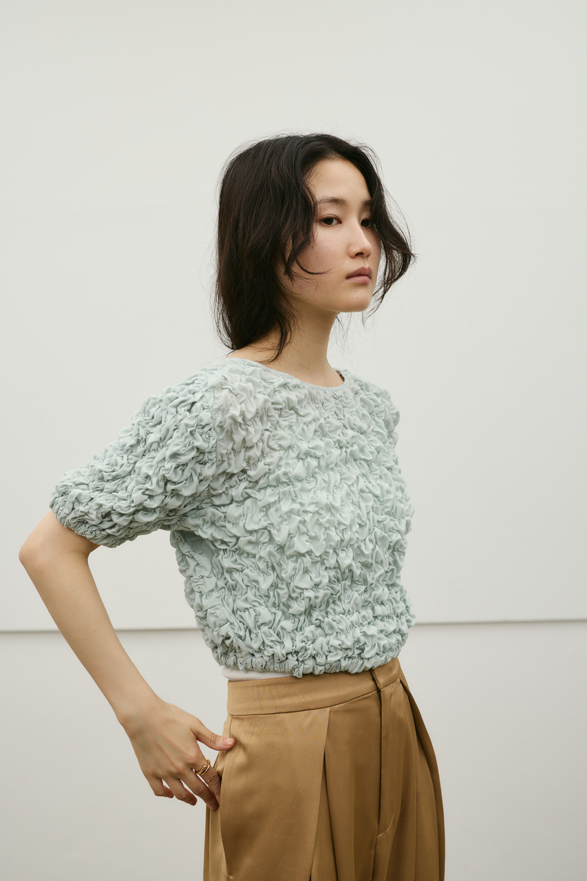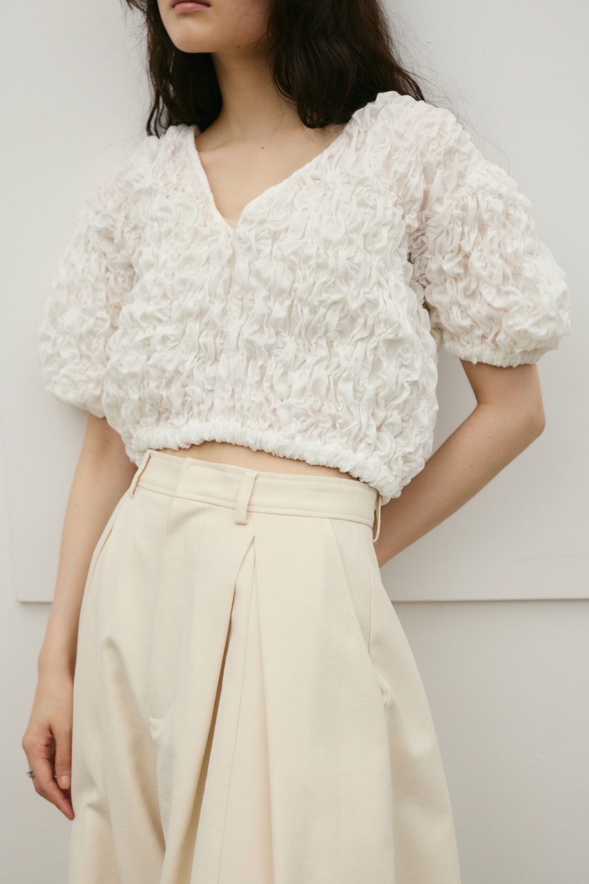 全体に施したシャーリングディテールがポイントのショートトップス。立体感がシンプルなデザインに奥行きを与え、バックは深いVネックデザインで女性らしいニュアンスを引き立てます。スカート合わせでフェミニンに、パンツ合わせでモードにと、幅広いスタイリングが楽しめる一枚です。ストレッチあり(スモッキング部分)、透け感なし。