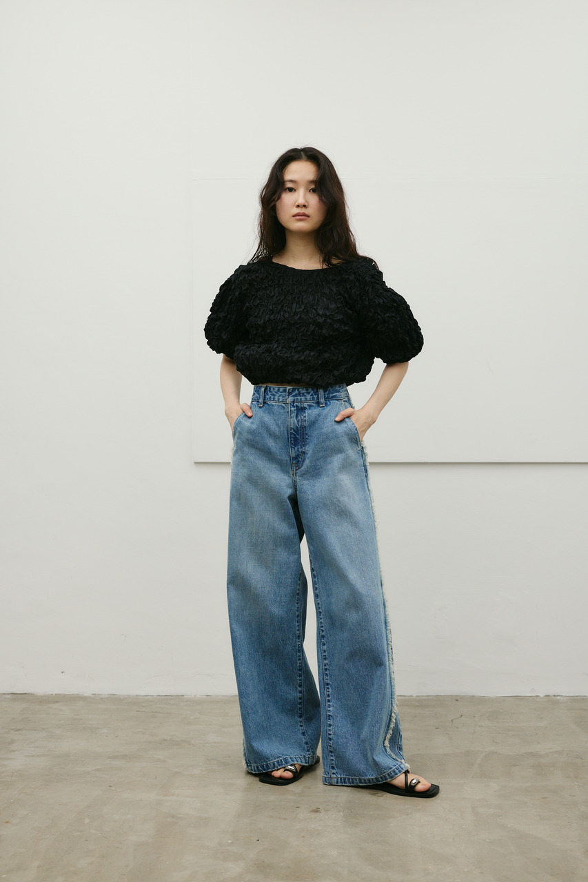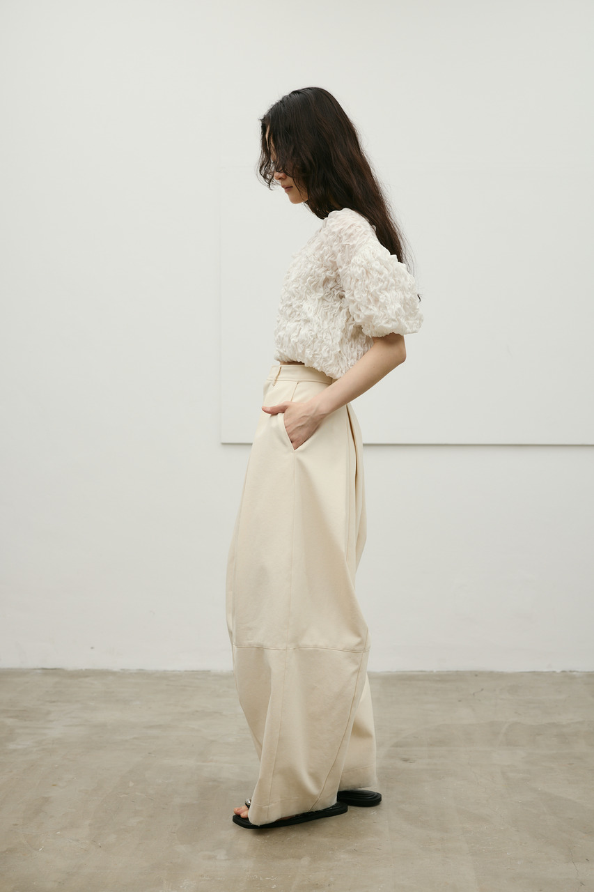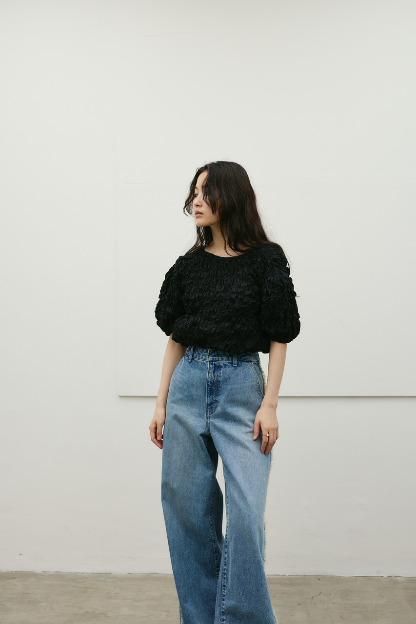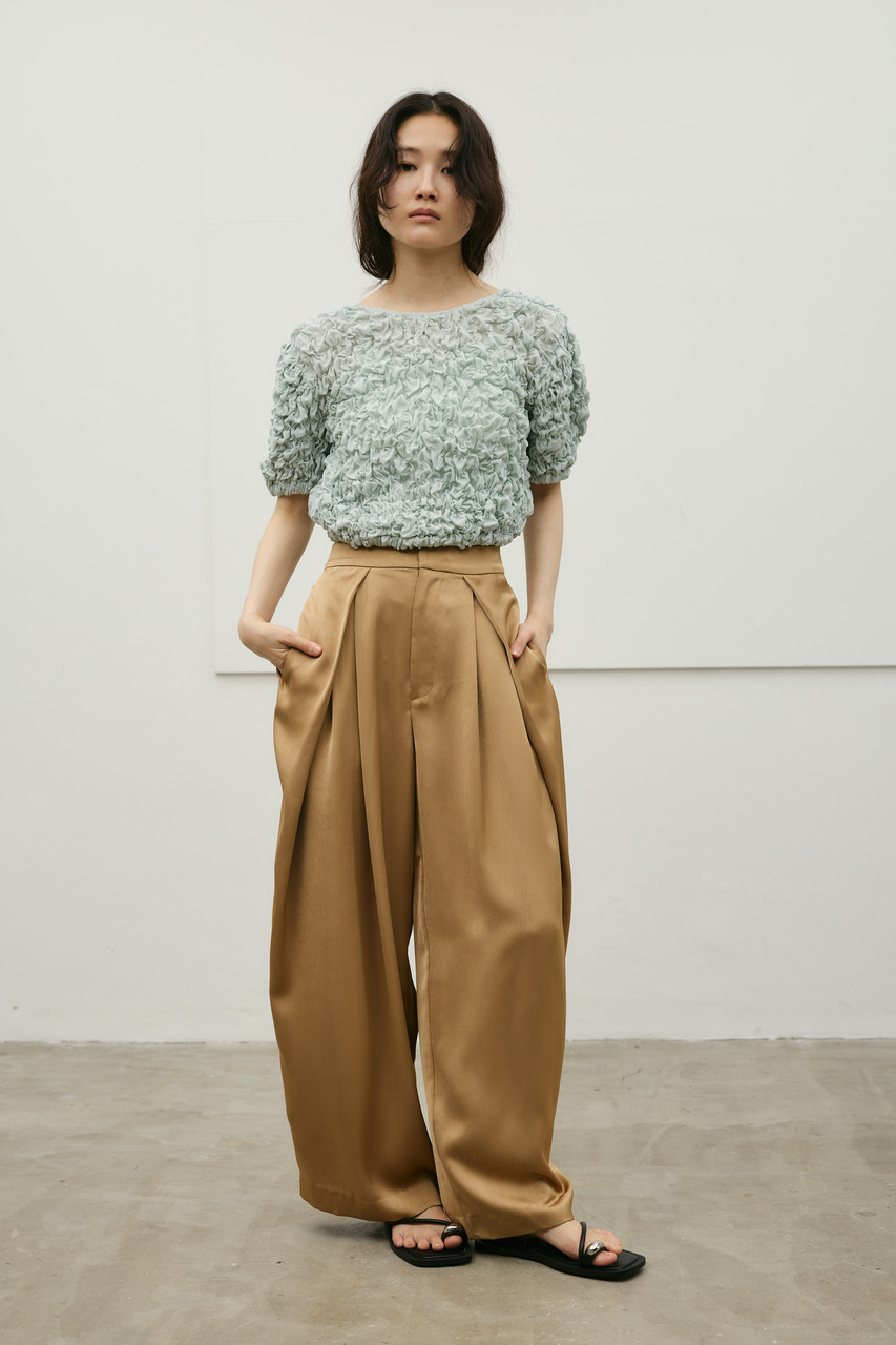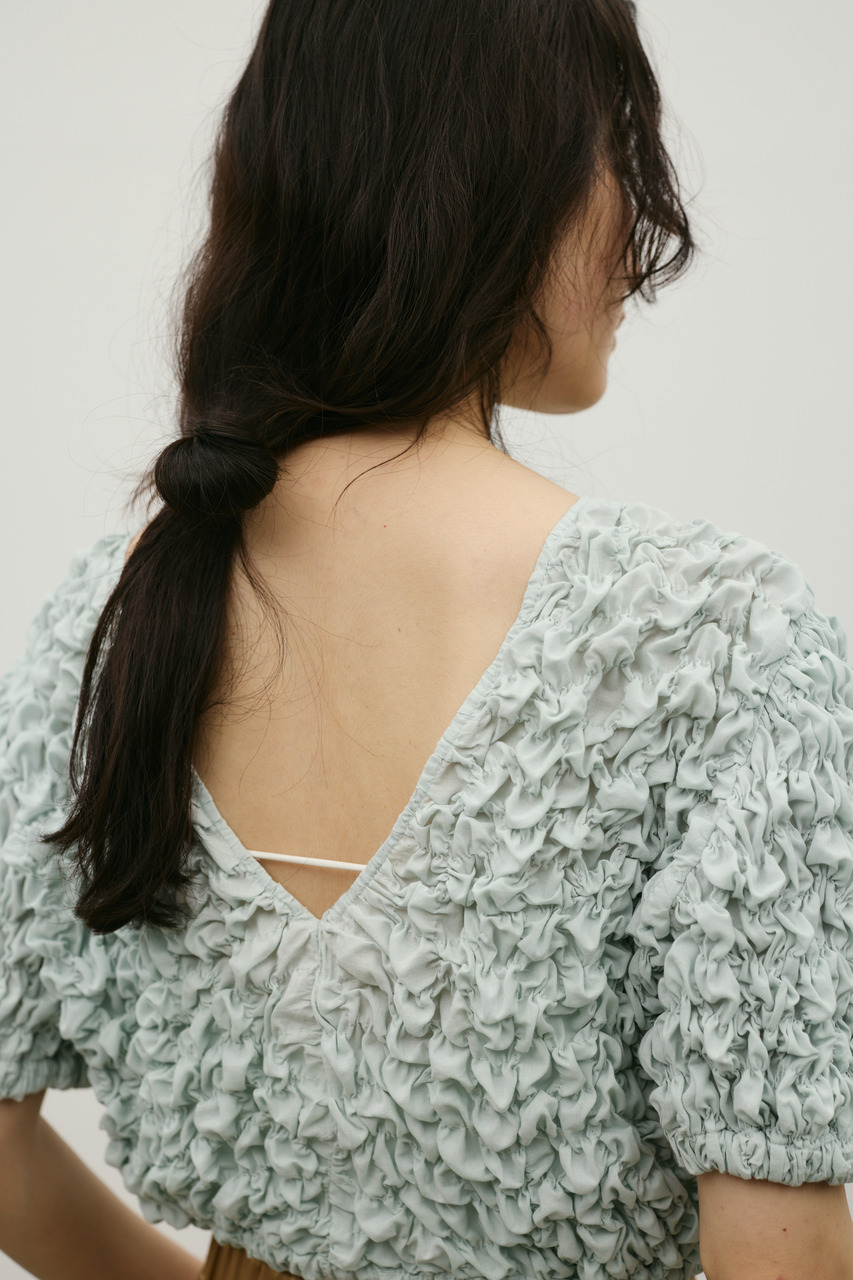 全体に施したシャーリングディテールがポイントのショートトップス。立体感がシンプルなデザインに奥行きを与え、バックは深いVネックデザインで女性らしいニュアンスを引き立てます。スカート合わせでフェミニンに、パンツ合わせでモードにと、幅広いスタイリングが楽しめる一枚です。ストレッチあり(スモッキング部分)、透け感なし。
