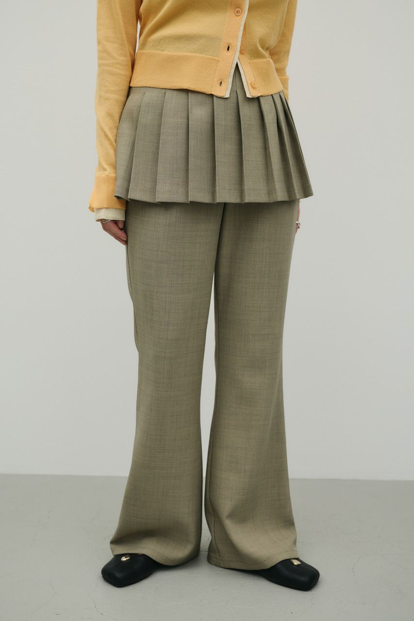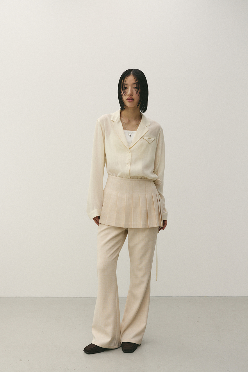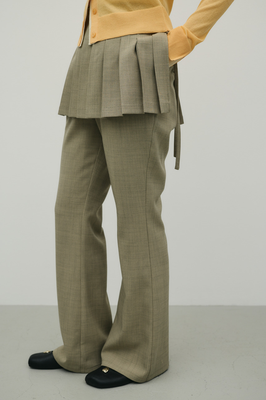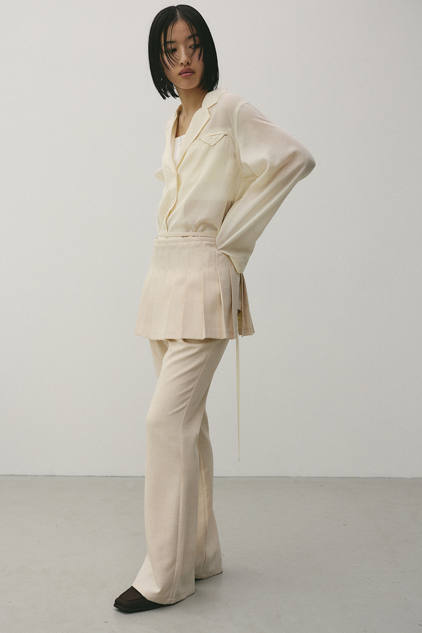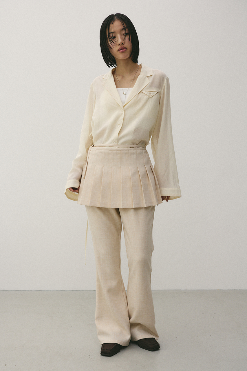 単品使いも可能なラッププリーツスカートとフレアパンツがセットになった2ピースアイテム。膝から裾にかけて広がるフレアシルエットのパンツが、脚のラインをすっきりと美しく見せます。プリーツスカートは気分やスタイリングに合わせて紐を一重巻き・二重巻きとアレンジが可能。セットでの着用はもちろん、お手持ちのパンツとレイヤードするなど、幅広いコーディネートが楽しめる一枚です。裏地付き。500JSO30-3211(テーラーカラーオープンシャツ)とのスタイリングがおすすめです。ストレッチややあり、透け感なし。