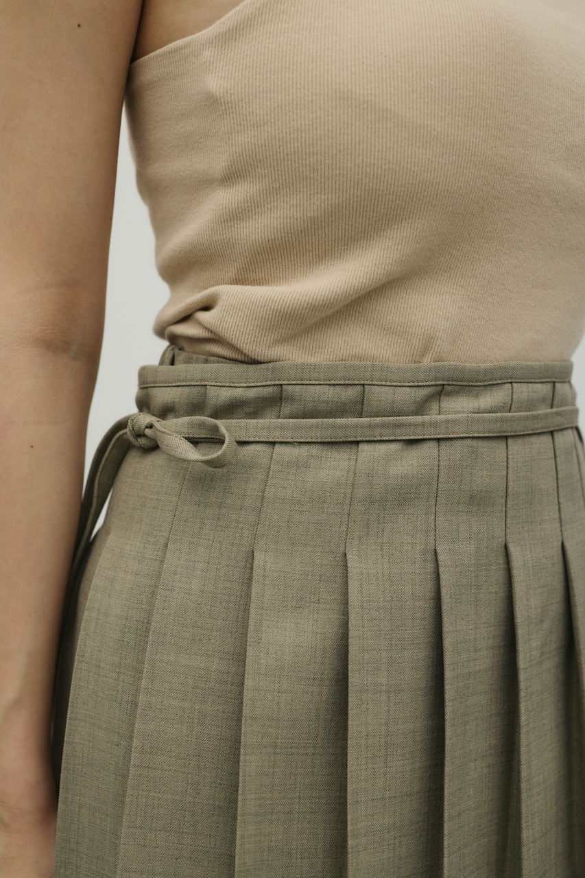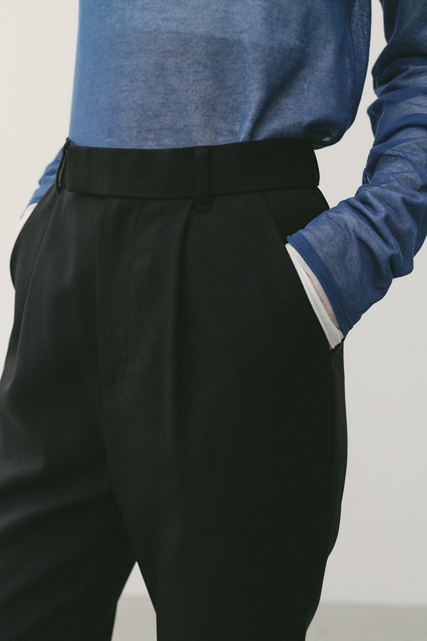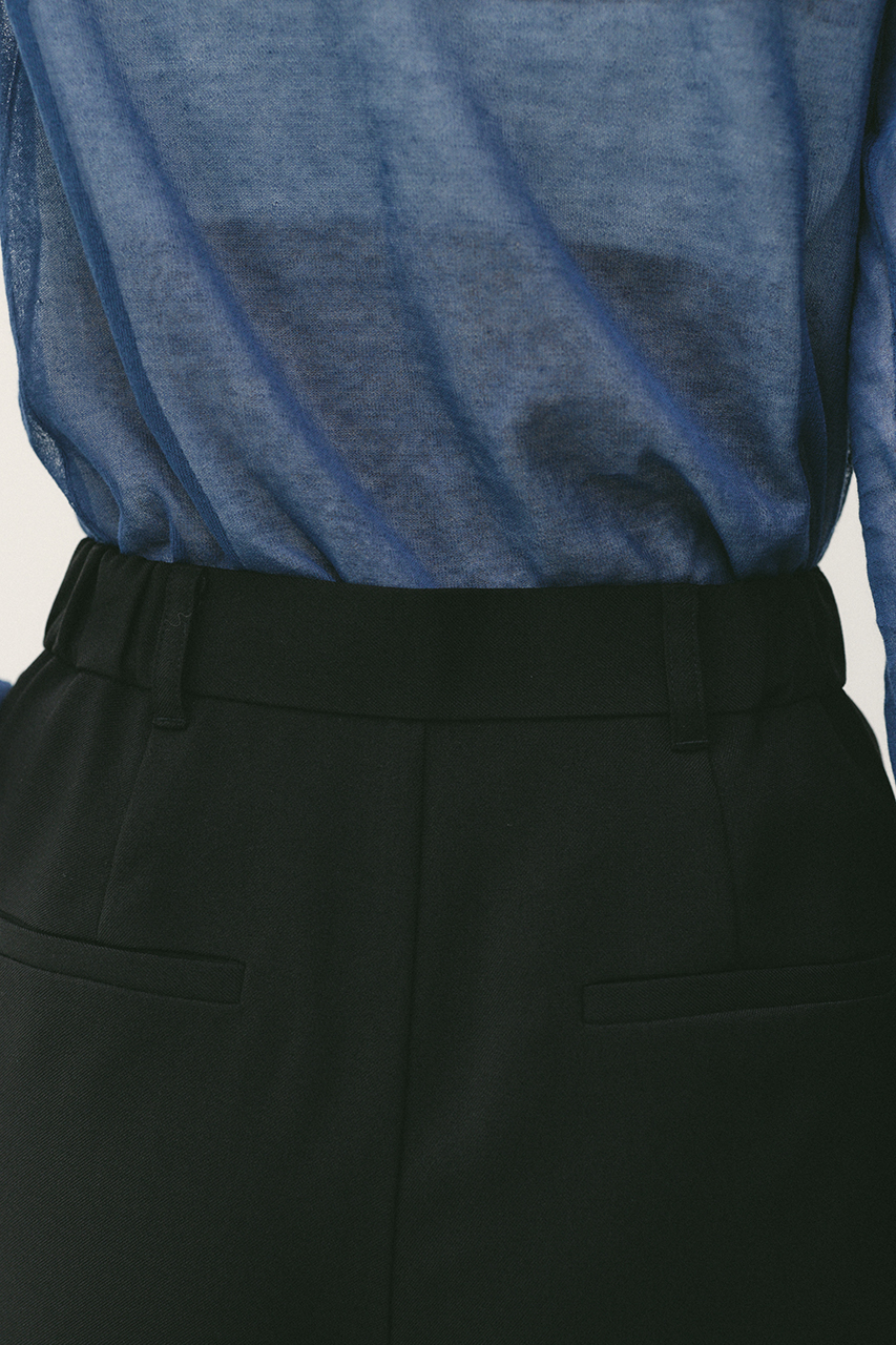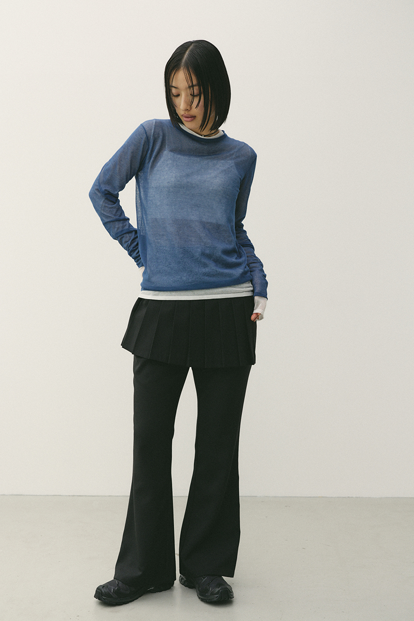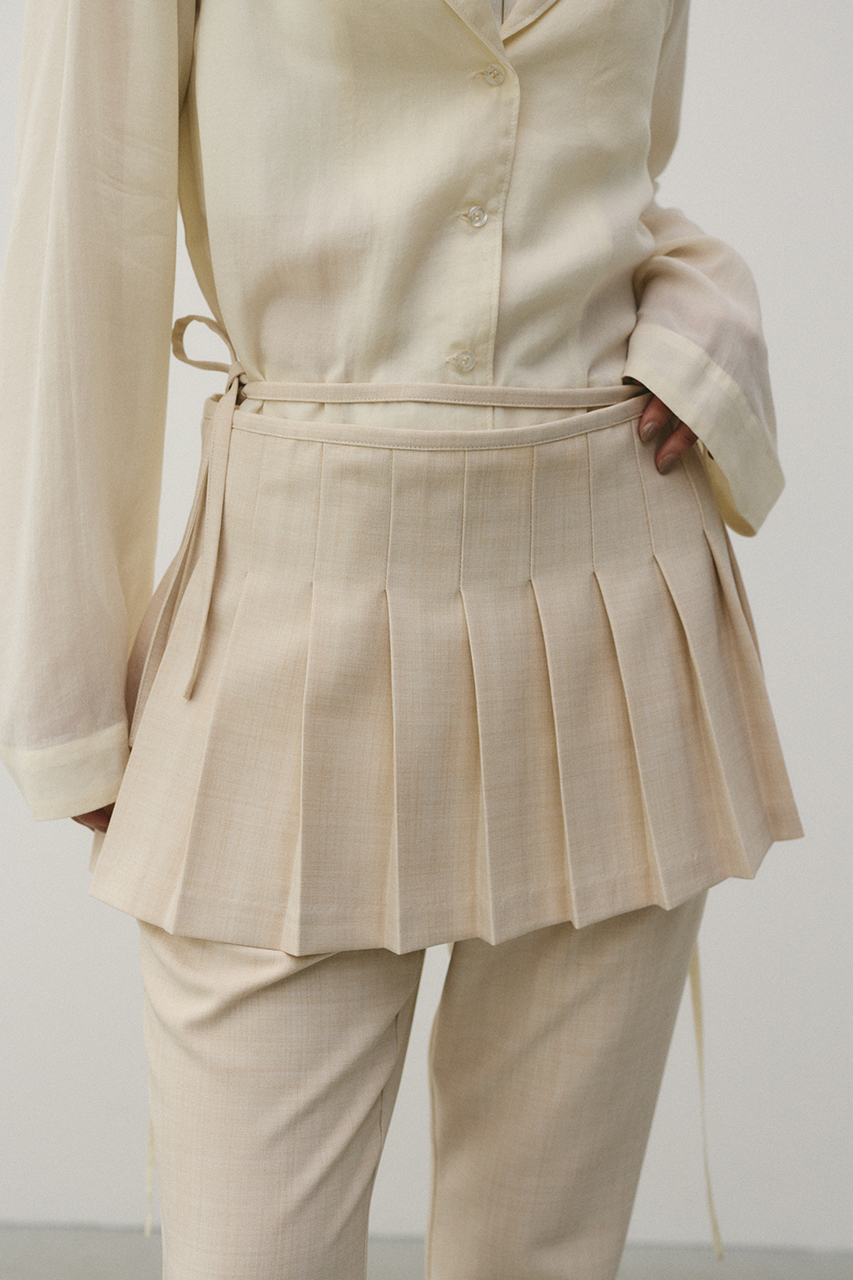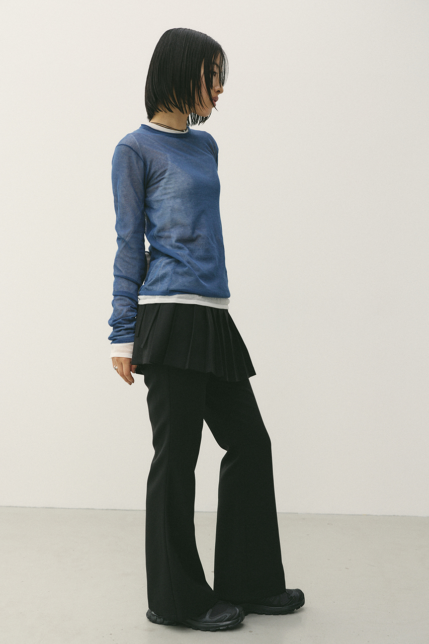 単品使いも可能なラッププリーツスカートとフレアパンツがセットになった2ピースアイテム。膝から裾にかけて広がるフレアシルエットのパンツが、脚のラインをすっきりと美しく見せます。プリーツスカートは気分やスタイリングに合わせて紐を一重巻き・二重巻きとアレンジが可能。セットでの着用はもちろん、お手持ちのパンツとレイヤードするなど、幅広いコーディネートが楽しめる一枚です。裏地付き。500JSO30-3211(テーラーカラーオープンシャツ)とのスタイリングがおすすめです。ストレッチややあり、透け感なし。