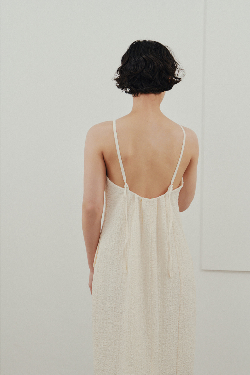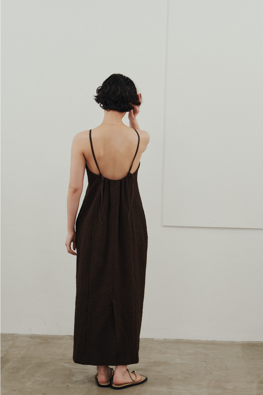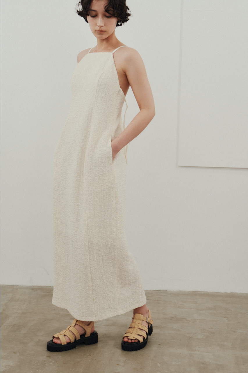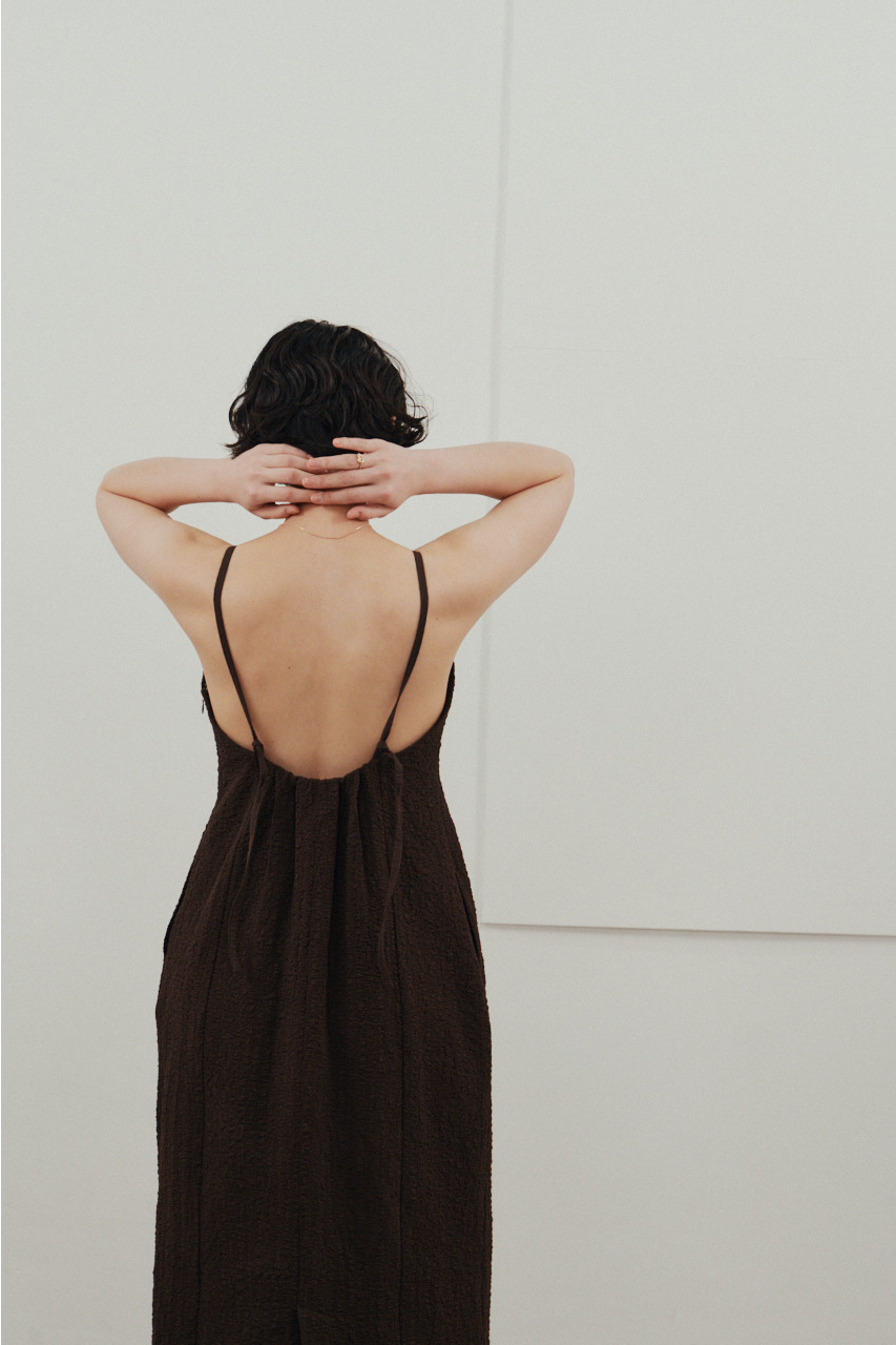背中を大きく開けたバックオープンデザインが印象的なキャミワンピース。シンプルなフロントデザインとのコントラストで、バックスタイルは抜け感と存在感を演出。1枚でドレスライクに着こなすのはもちろん、Tシャツやシアートップスとのレイヤードでカジュアルダウンでの着用もおすすめ。リゾートからタウンユースまで幅広く活躍する、主役級の一枚です。