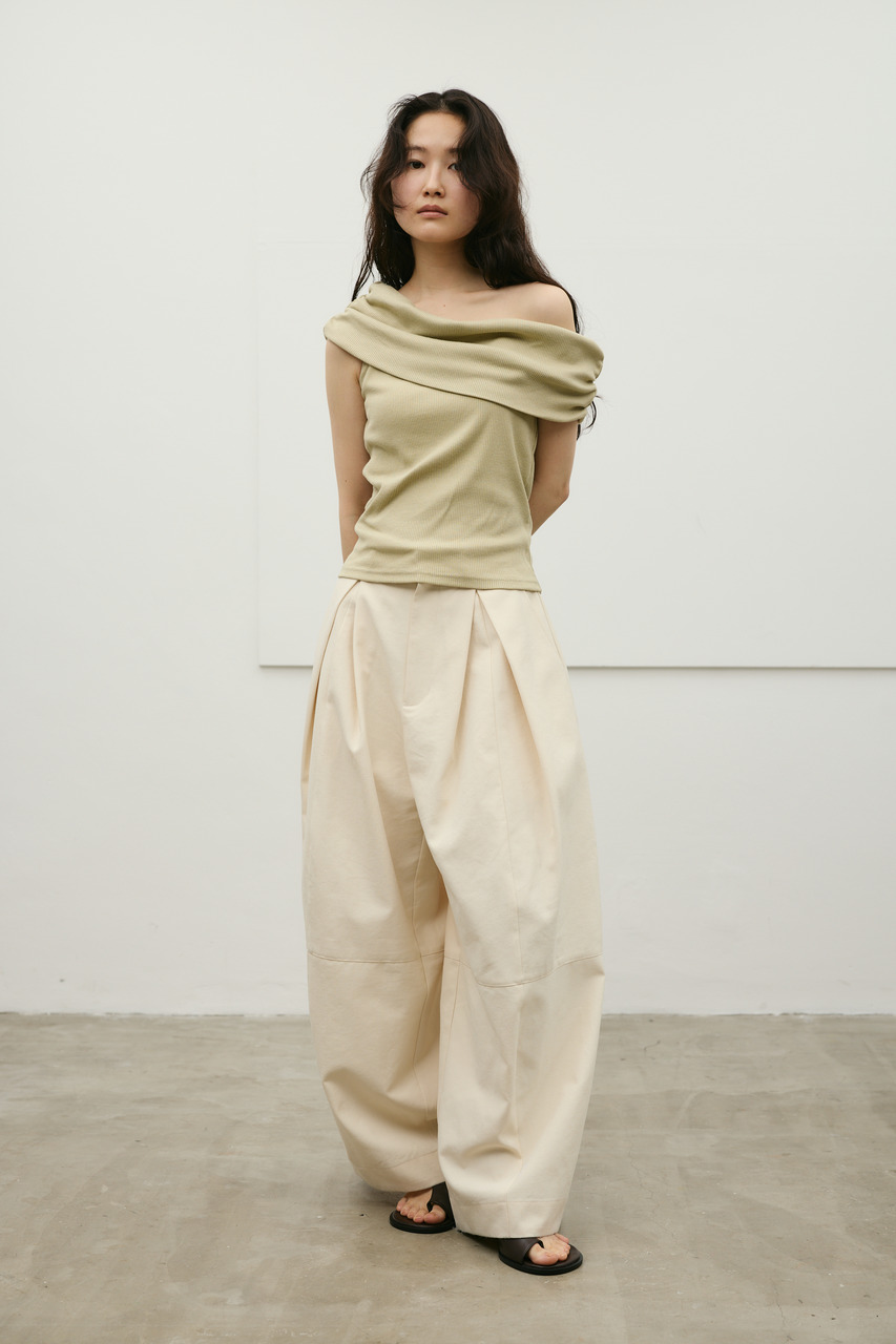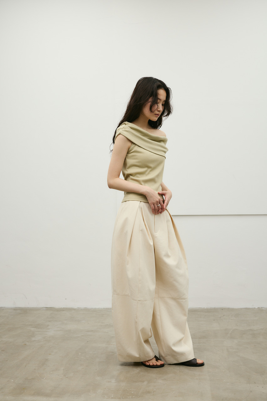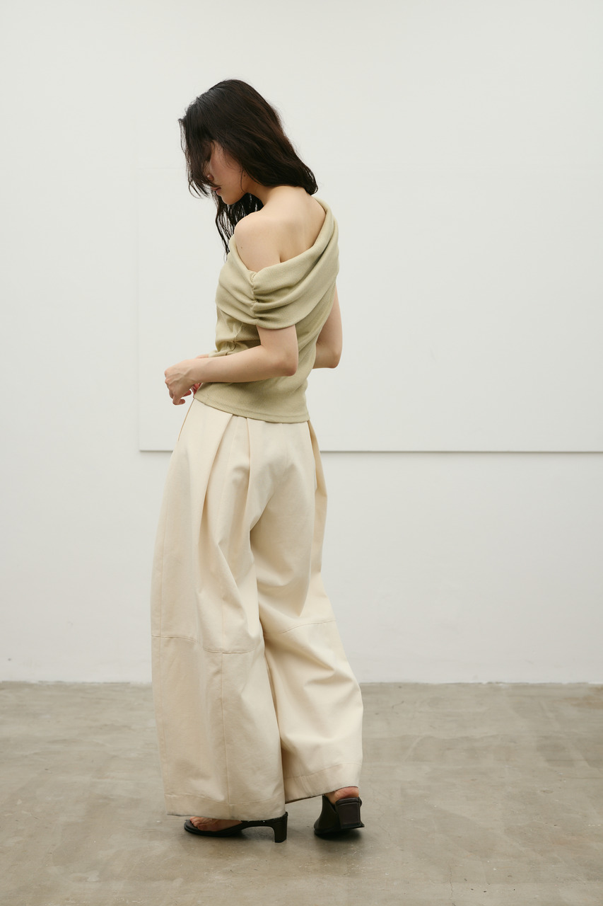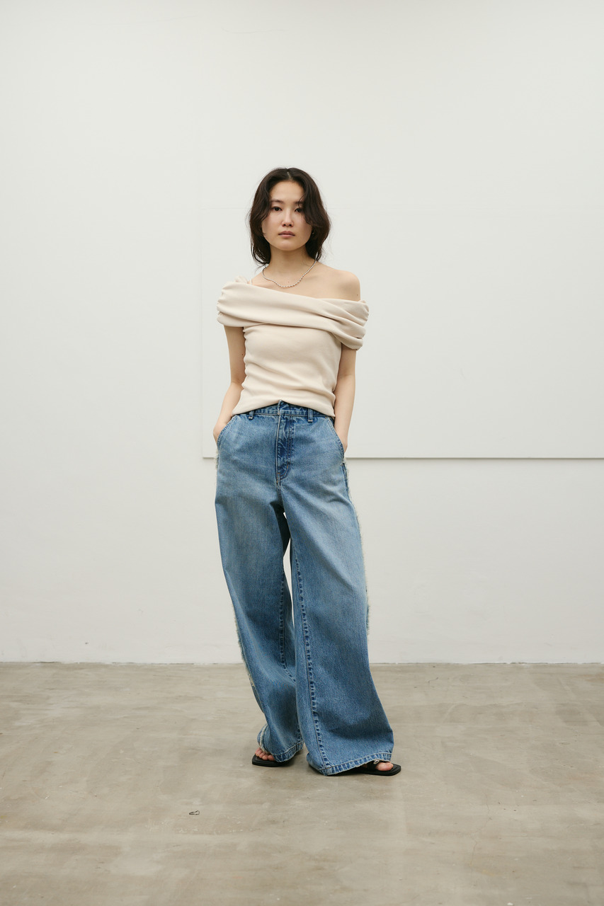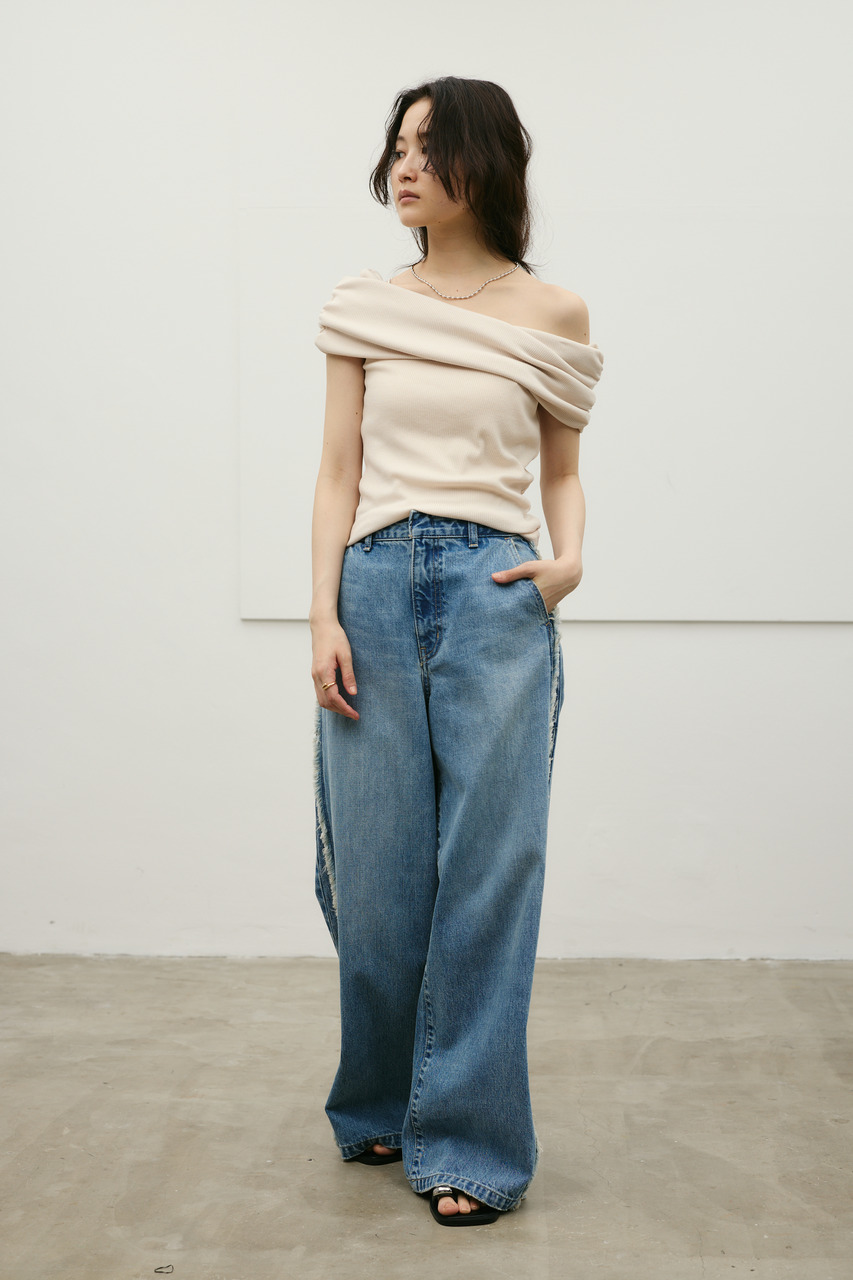 サイドにたっぷりと入れたギャザーが華やかな印象を与えるオフショルトップ。肩を落として女性らしく着こなすのはもちろん、少し引き上げてネックラインを調整することでヘルシーな雰囲気にもアレンジできます。ふんわりとしたシルエットが身体のラインをさりげなくカバーしつつ、スタイリングに抜け感をプラス。デニムでカジュアルに、スカートでフェミニンにと、幅広いシーンで活躍するアイテムです。ストレッチなし、透け感なし。