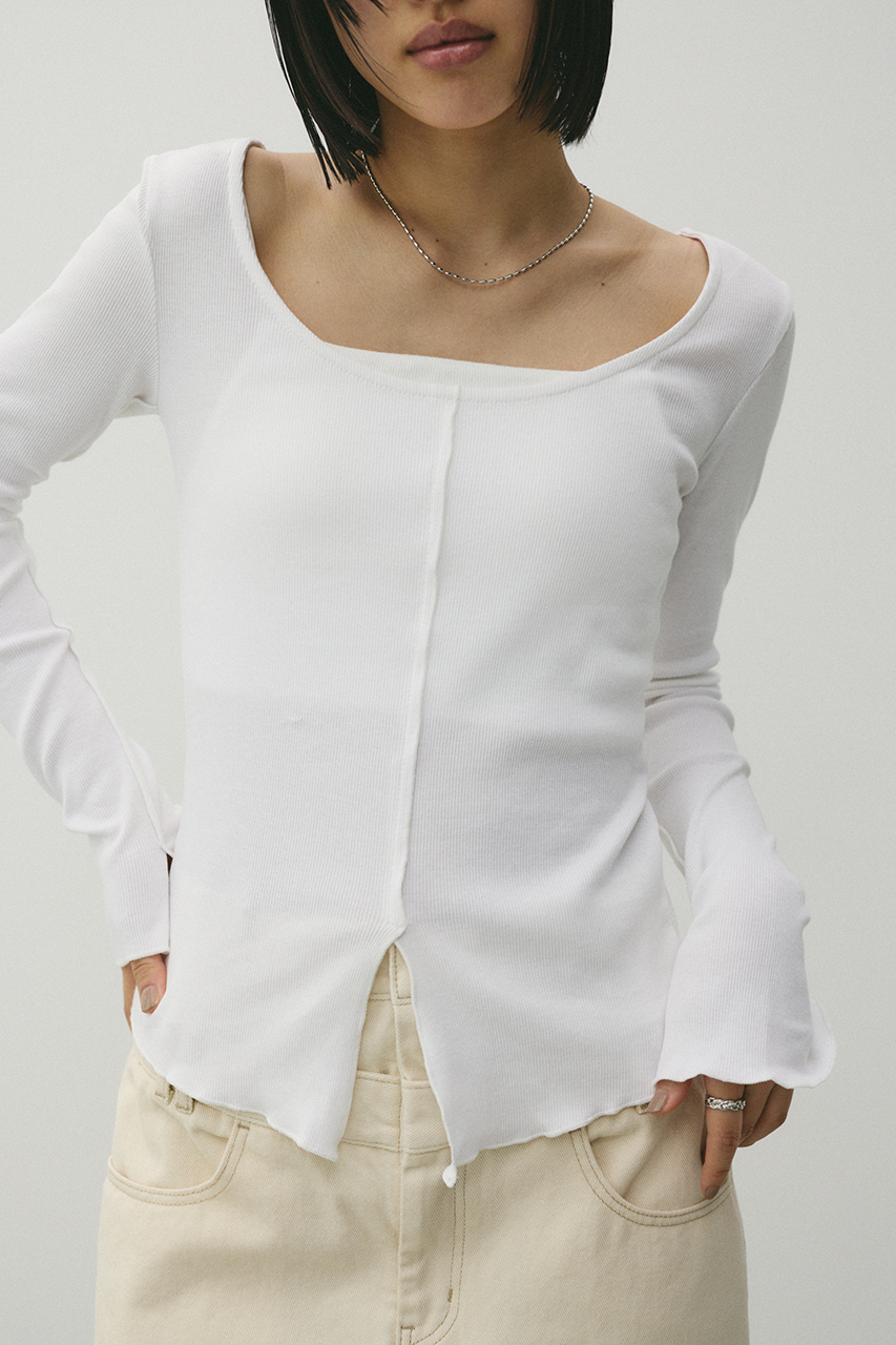 前後2WAYで着用できるリブカットトップス。コンパクトなシルエットに後ろ襟ぐりを深めに設定、後ろ中心裾にはスリットを施すことで女性らしさをプラス。さらりとした肌触りと程よいフィット感のあるコットンリブ素材を使用。袖口、裾、背中心はメローで仕立てたシンプルながらディテールにこだわった一枚です。透け感あり、ストレッチあり