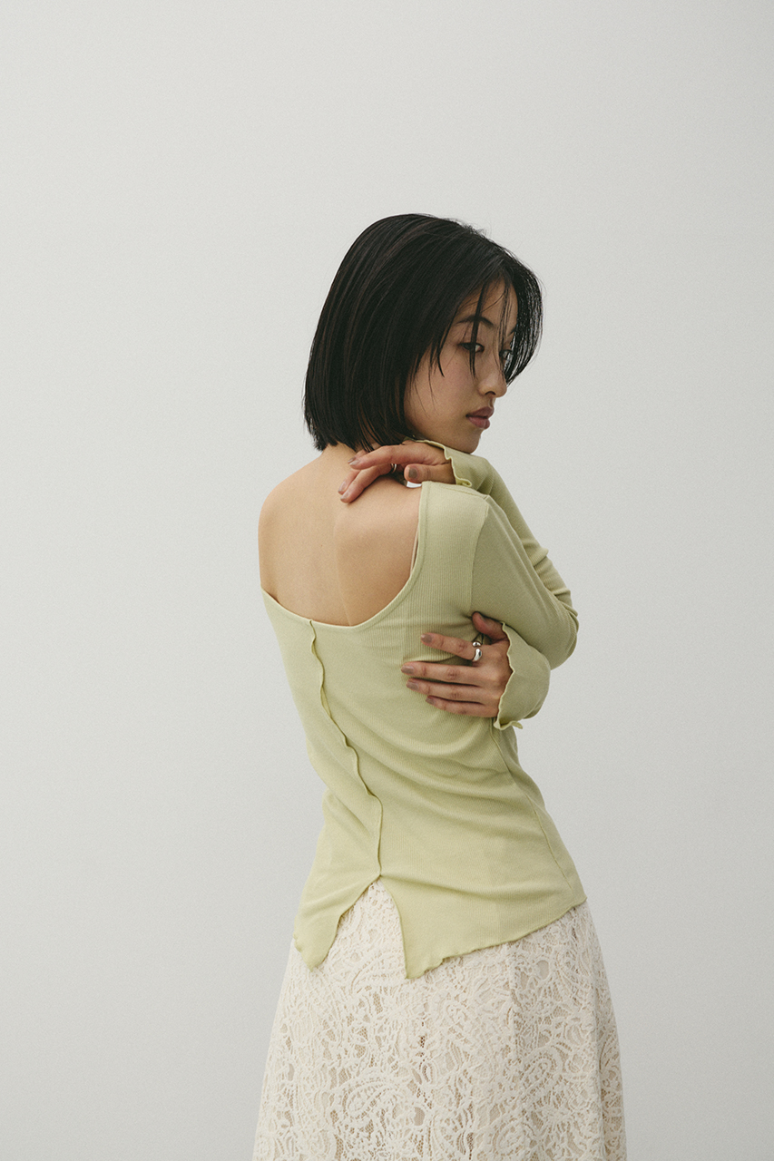 前後2WAYで着用できるリブカットトップス。コンパクトなシルエットに後ろ襟ぐりを深めに設定、後ろ中心裾にはスリットを施すことで女性らしさをプラス。さらりとした肌触りと程よいフィット感のあるコットンリブ素材を使用。袖口、裾、背中心はメローで仕立てたシンプルながらディテールにこだわった一枚です。透け感あり、ストレッチあり