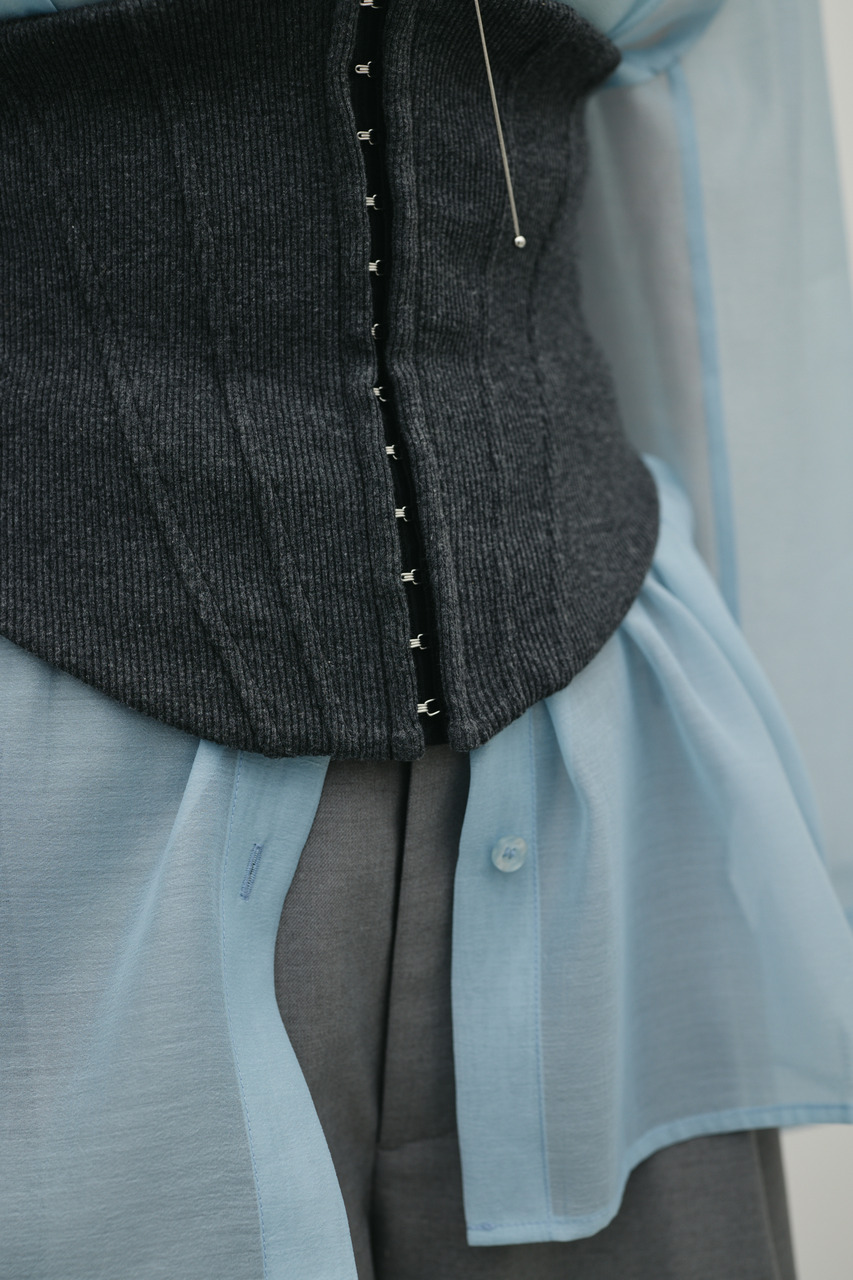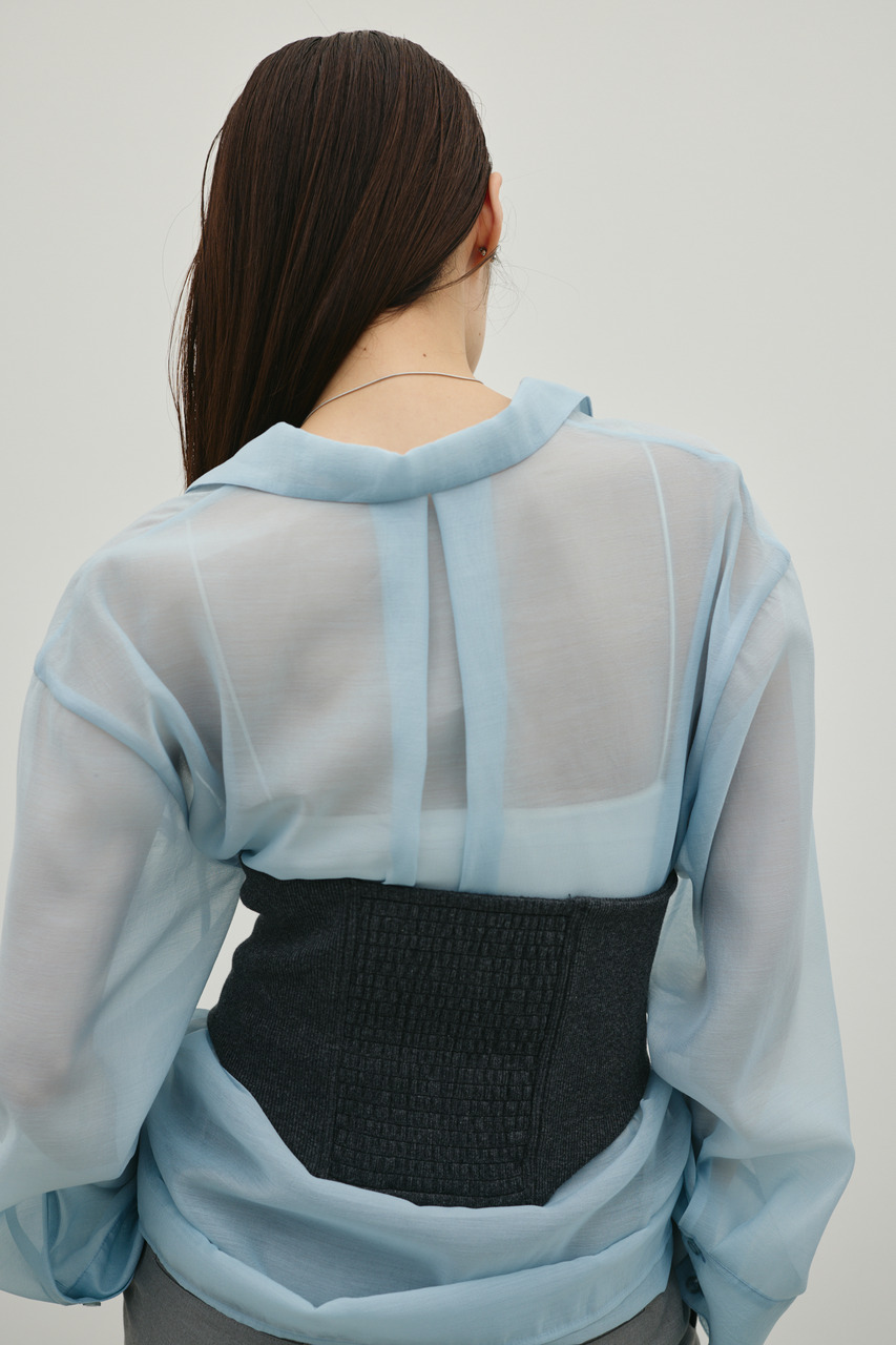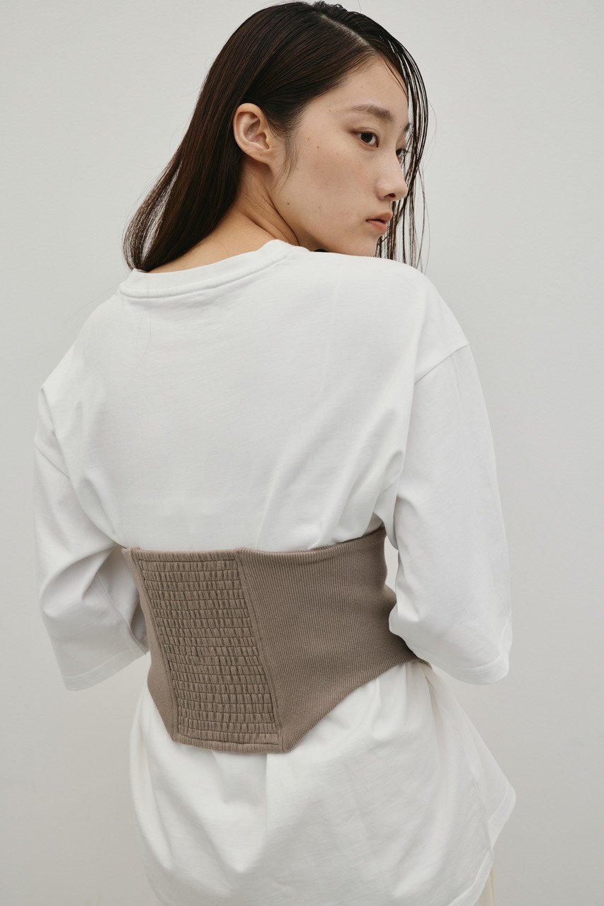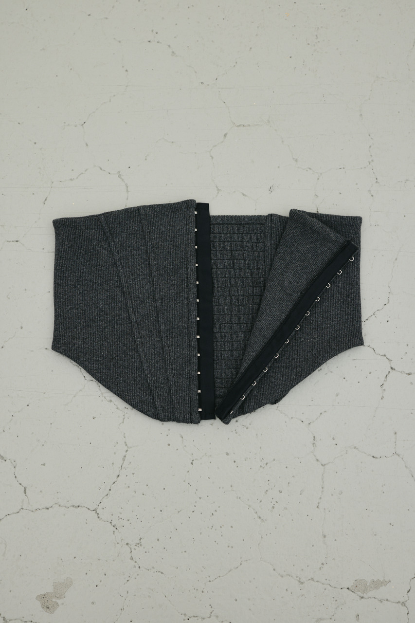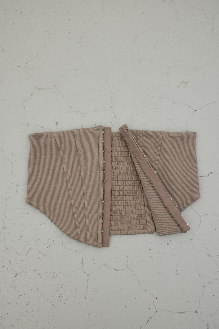 リブカット素材のコルセットビスチェ。程よいシェイプラインで身体になじみやすく、カジュアルなスタイリングにも女性らしいニュアンスを取り入れられる一枚。後ろはシャーリングゴムを入れて、厚手のカットーやシャツも重ねやすい仕様になっています。透け感なし、ストレッチなし。