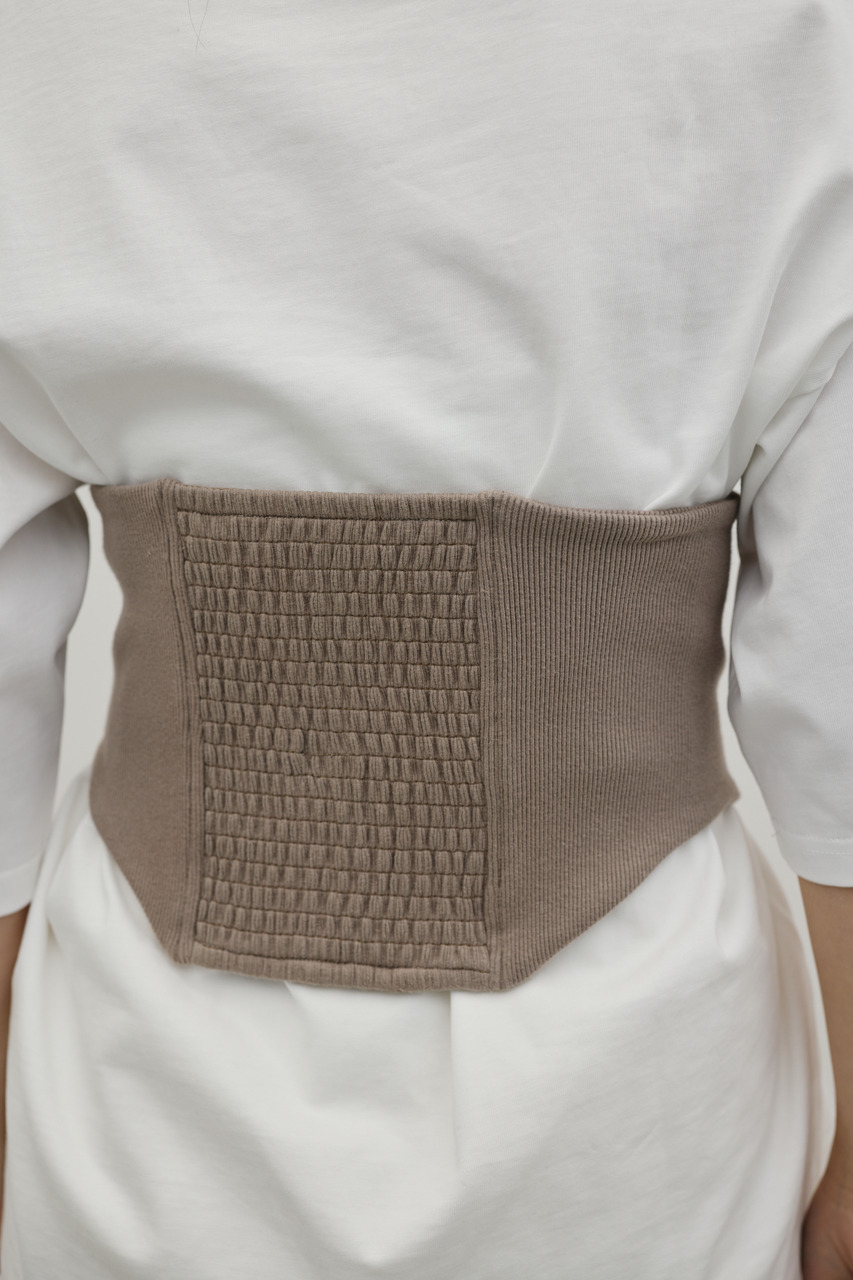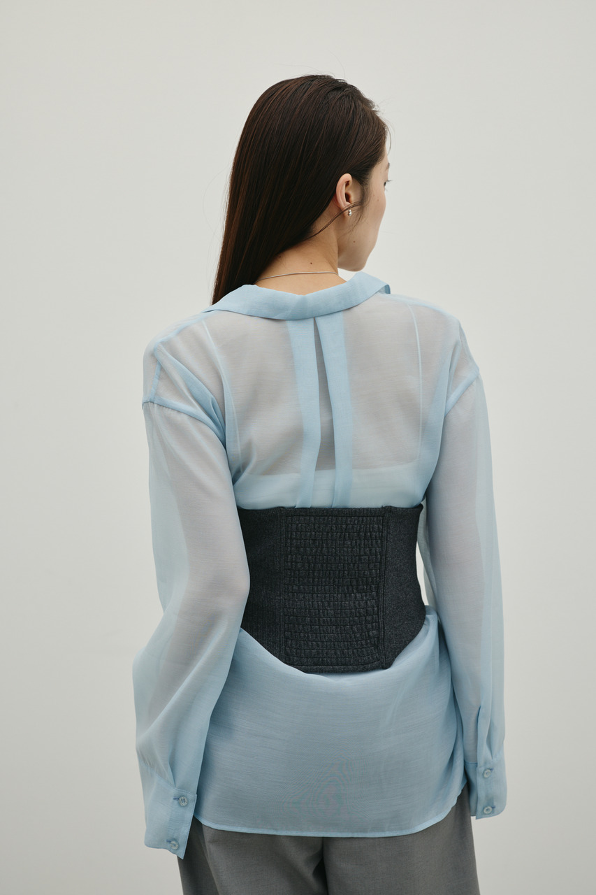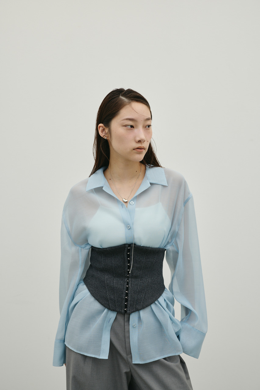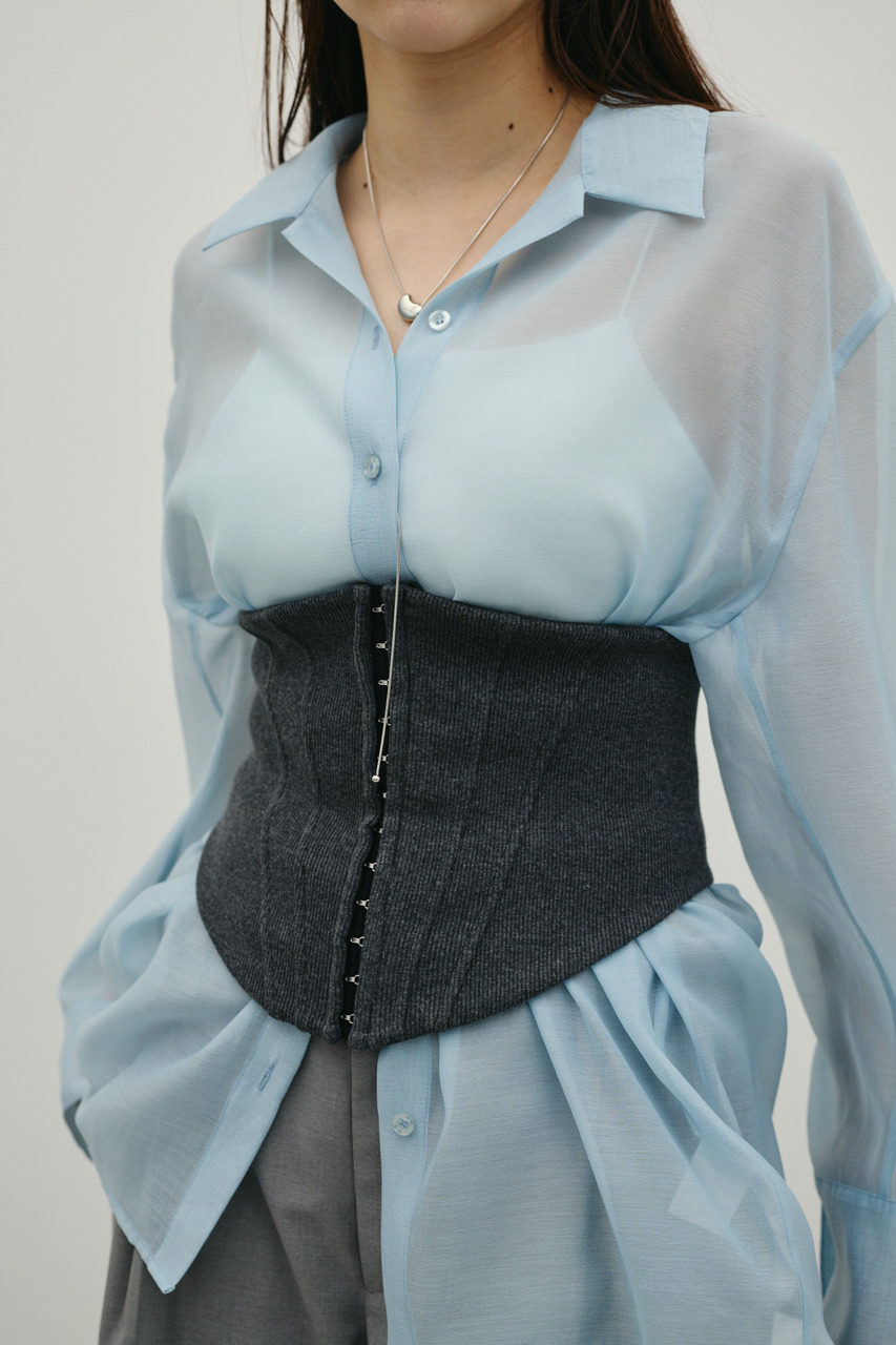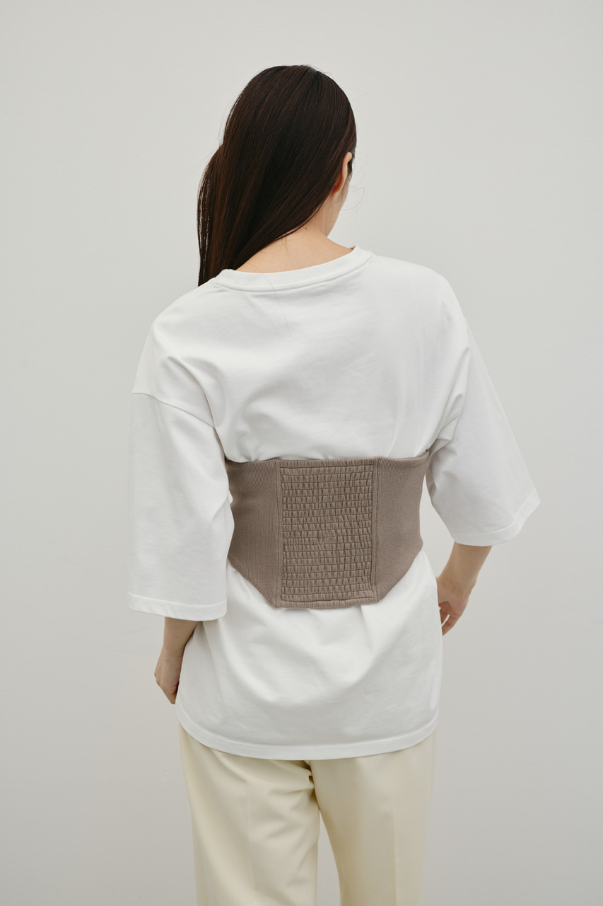 リブカット素材のコルセットビスチェ。程よいシェイプラインで身体になじみやすく、カジュアルなスタイリングにも女性らしいニュアンスを取り入れられる一枚。後ろはシャーリングゴムを入れて、厚手のカットーやシャツも重ねやすい仕様になっています。透け感なし、ストレッチなし。