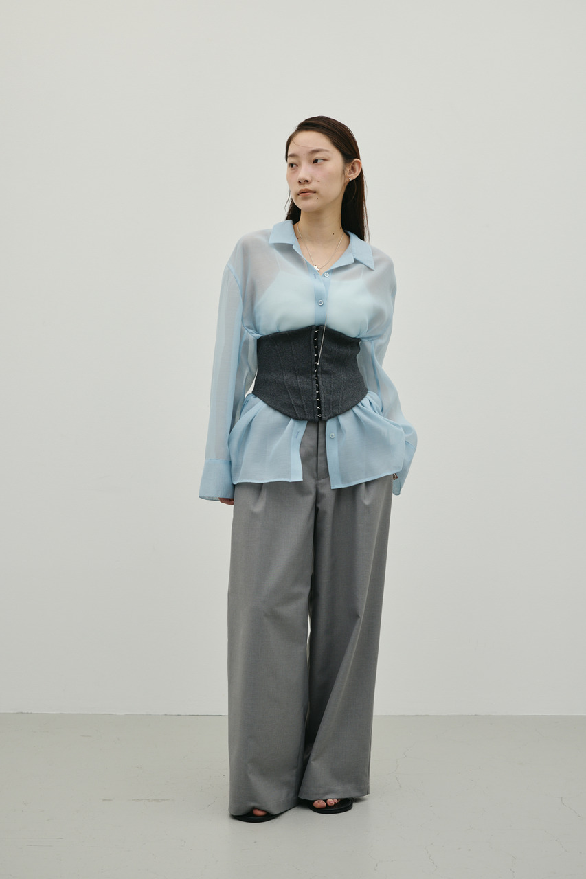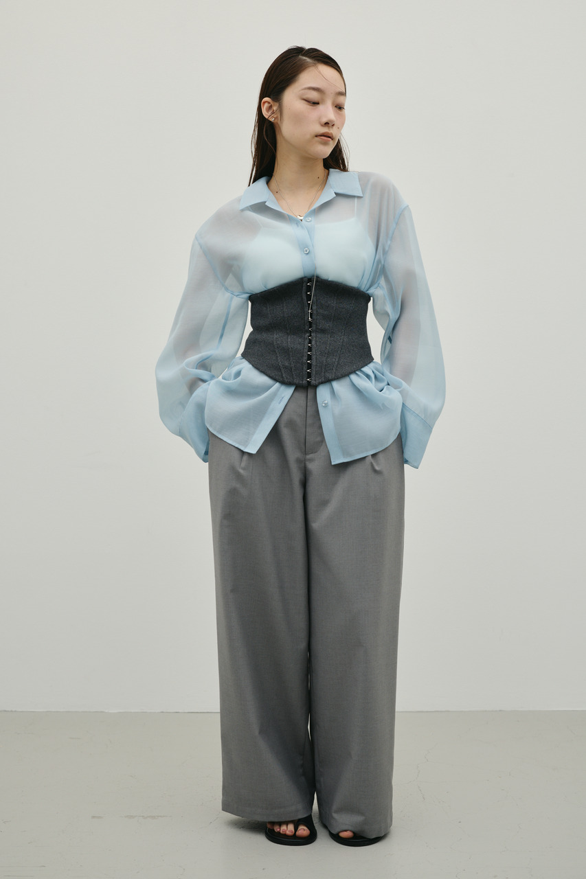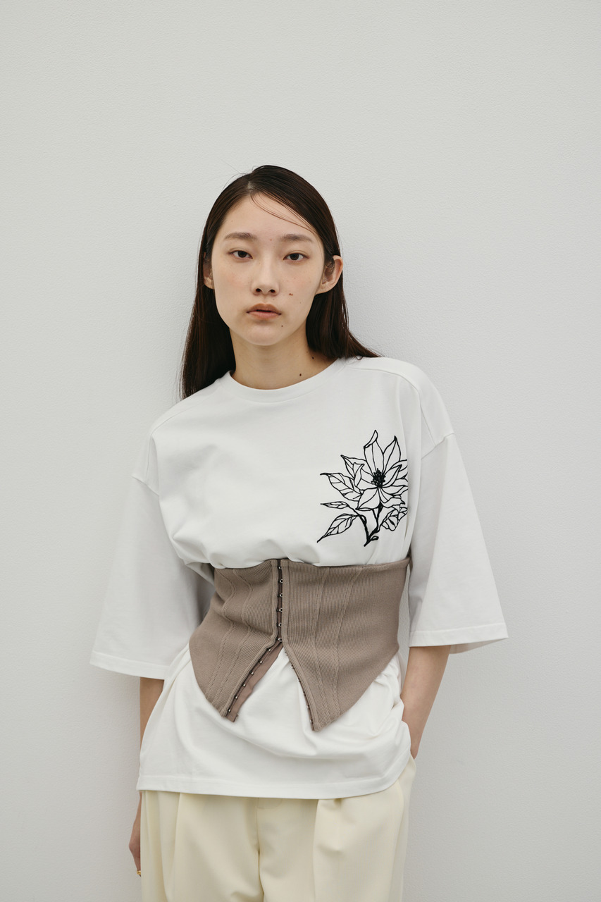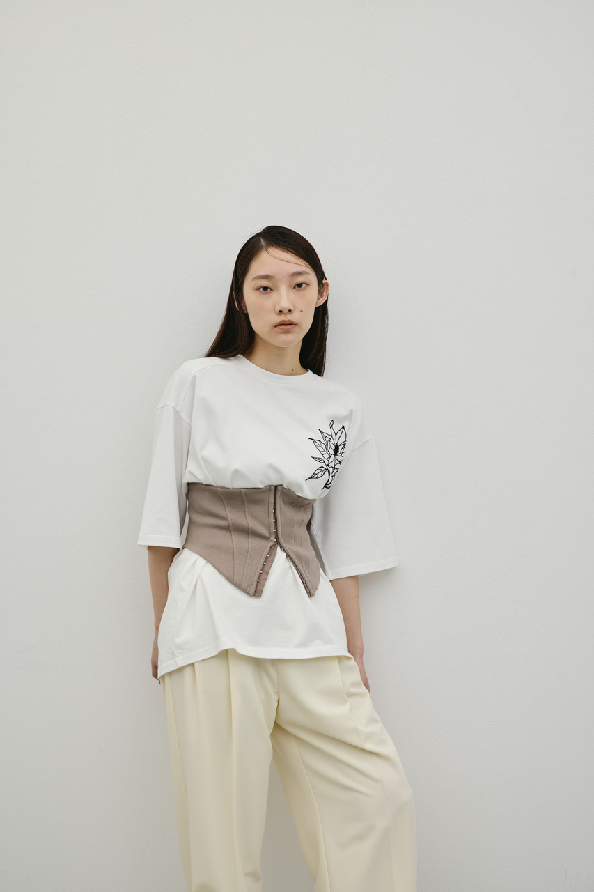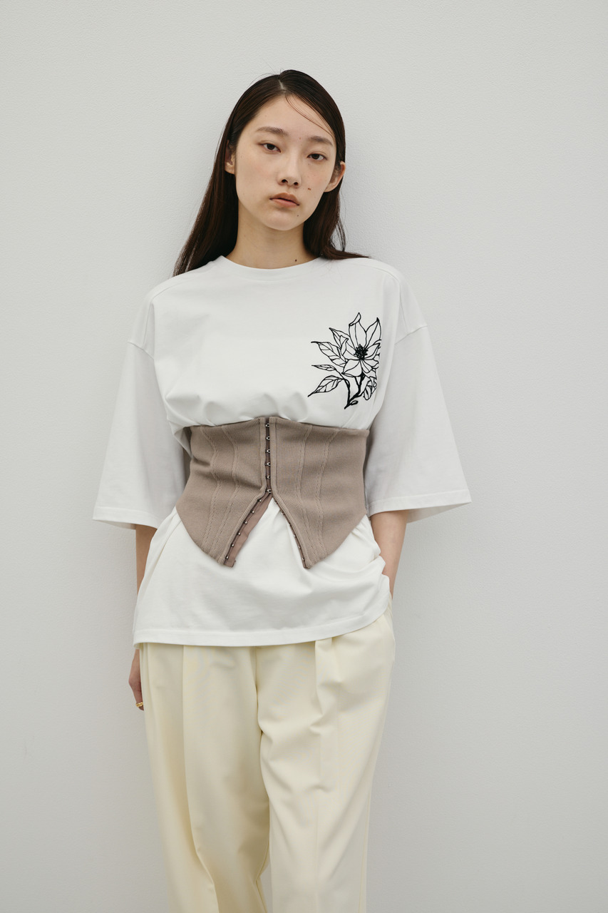 リブカット素材のコルセットビスチェ。程よいシェイプラインで身体になじみやすく、カジュアルなスタイリングにも女性らしいニュアンスを取り入れられる一枚。後ろはシャーリングゴムを入れて、厚手のカットーやシャツも重ねやすい仕様になっています。透け感なし、ストレッチなし。