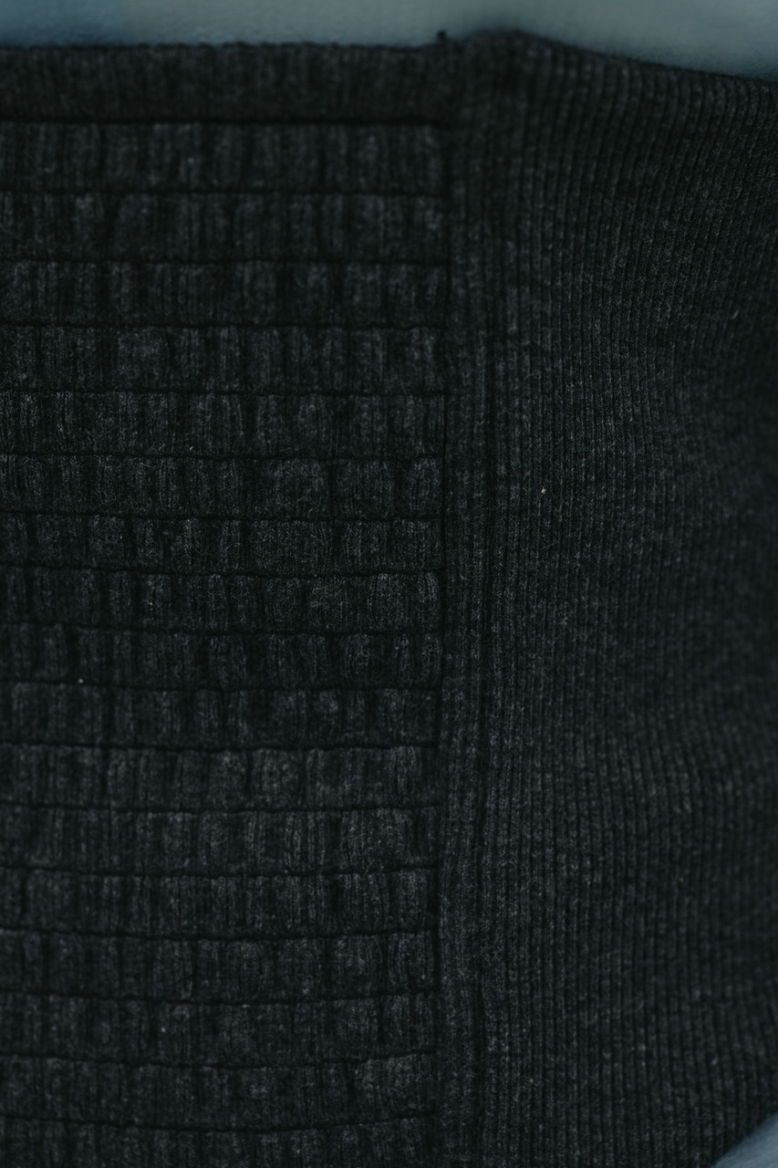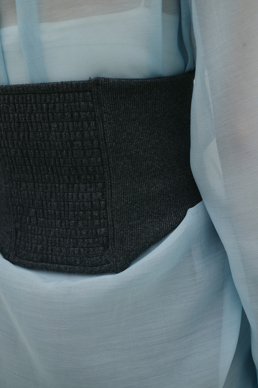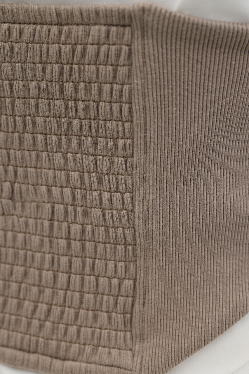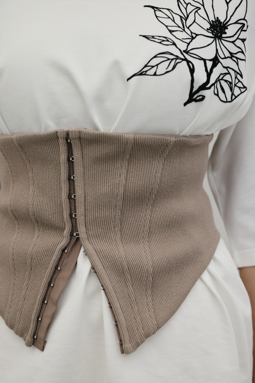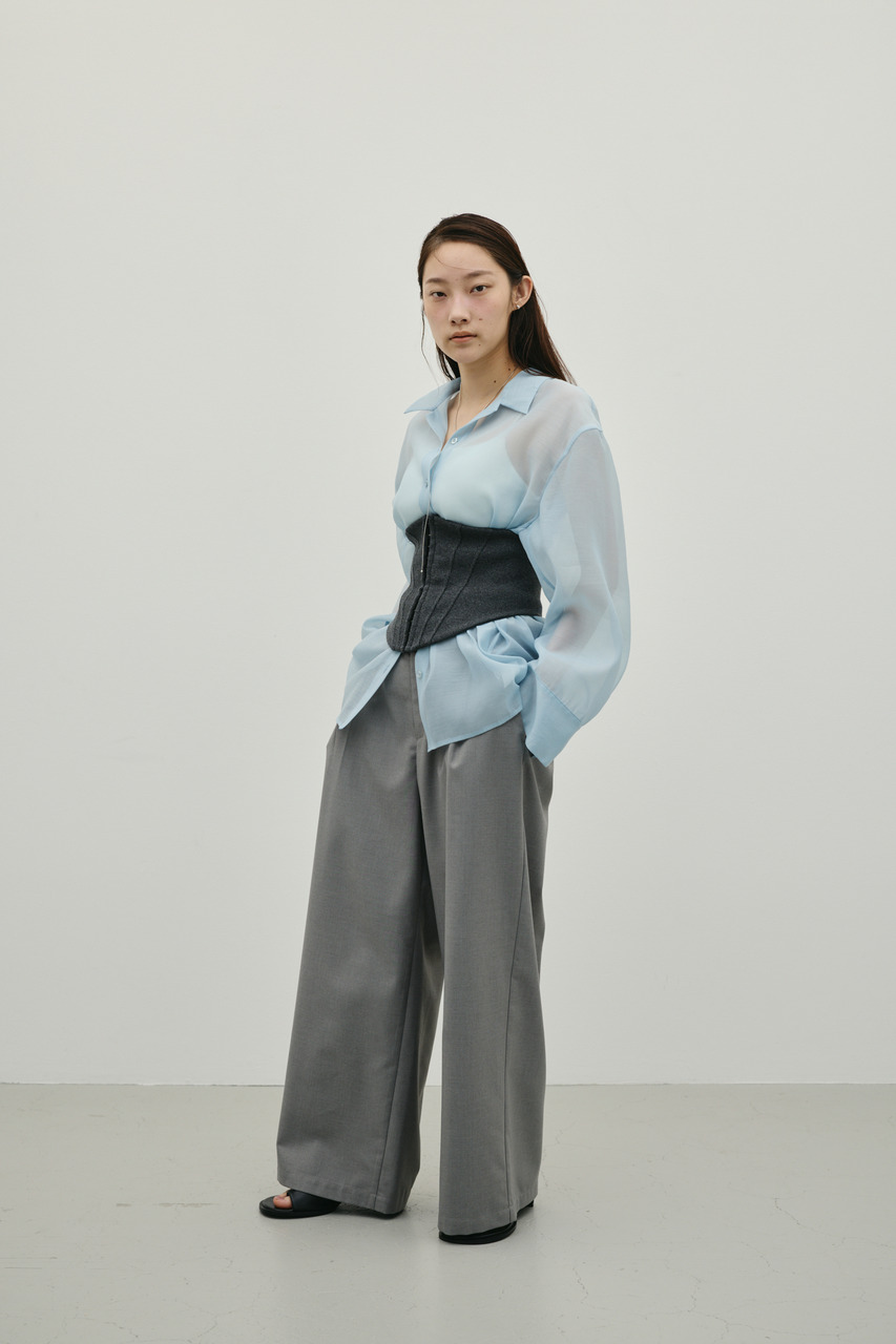 リブカット素材のコルセットビスチェ。程よいシェイプラインで身体になじみやすく、カジュアルなスタイリングにも女性らしいニュアンスを取り入れられる一枚。後ろはシャーリングゴムを入れて、厚手のカットーやシャツも重ねやすい仕様になっています。透け感なし、ストレッチなし。