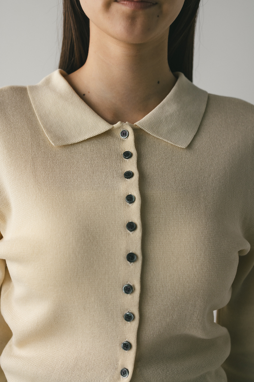 前後2WAYで着用可能なニットポロ。なめらかでさらりとした糸を使用。ビスコース混の微光沢が上品な印象に見せてくれます。総針に編み立てにしているのでボディーラインもひびきにくい一枚です。ストレッチあり、透け感なし。
