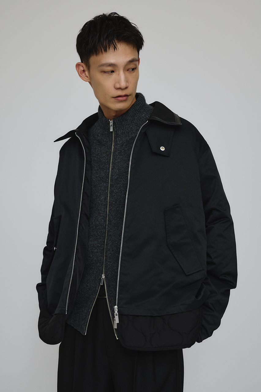 キルトライナーをドッキングさせた特徴的なデザインのフライトジャケット。衿はニットとレザーを組み合わせたデザイン、チンストラップ付きで防寒性も優れています。ゆとりのあるシルエットで厚手トップスと合わせてもゆったりと着用いただけます。ストレッチなし、透け感なし。