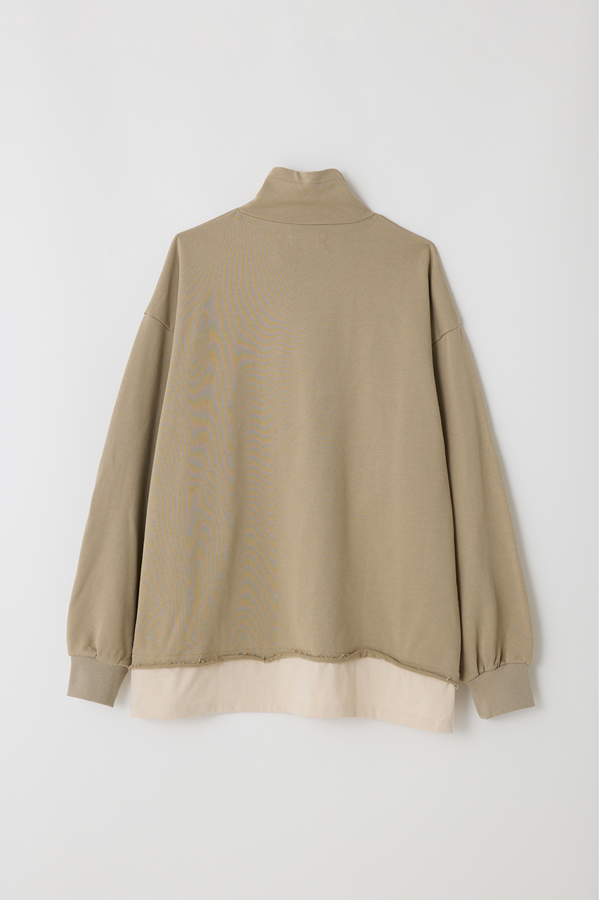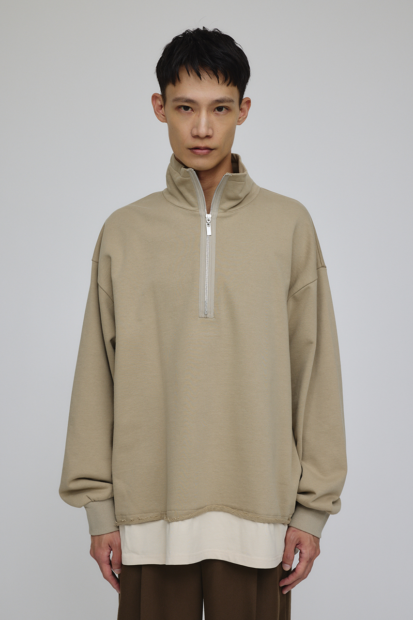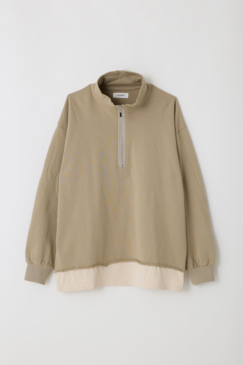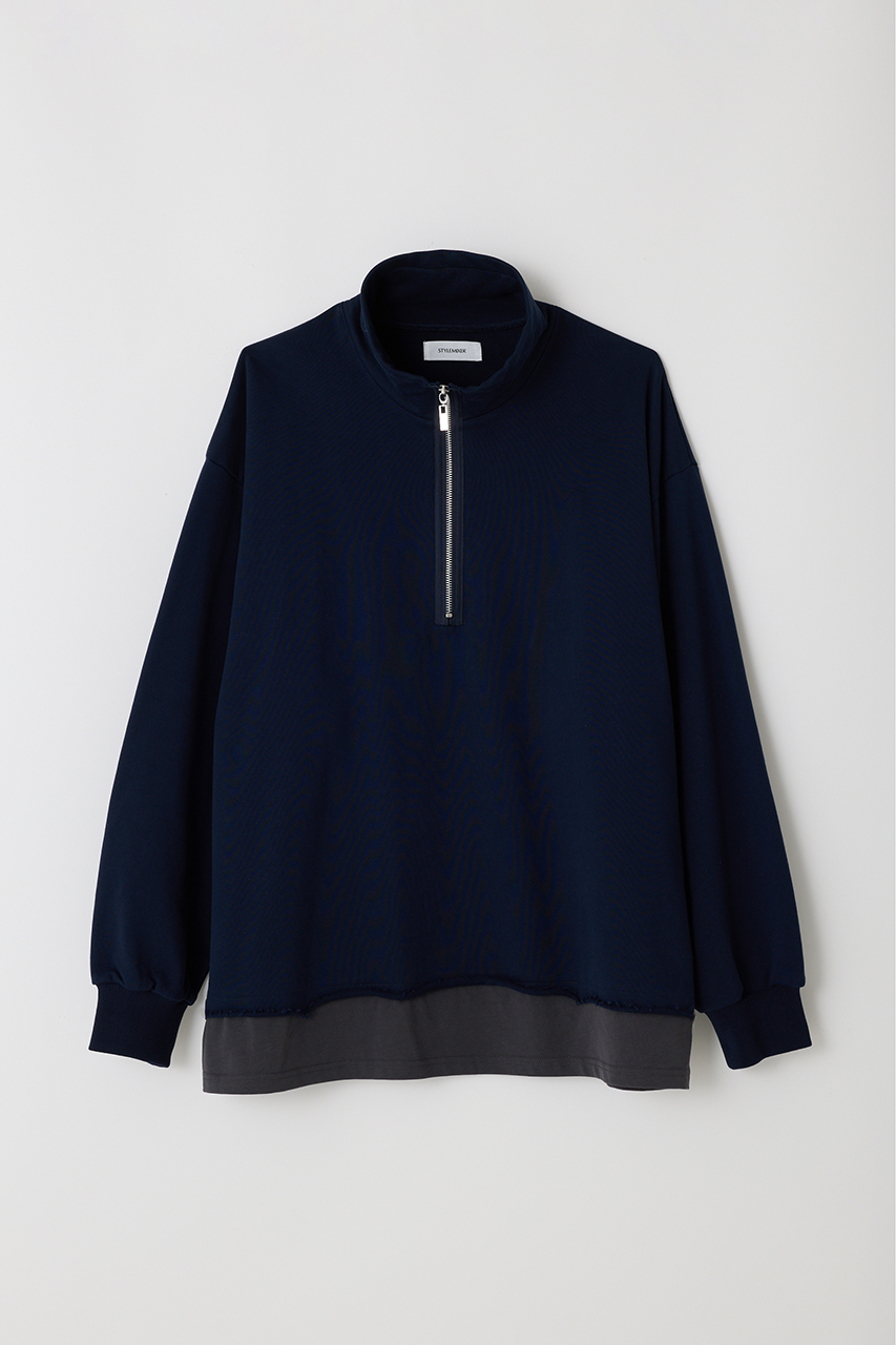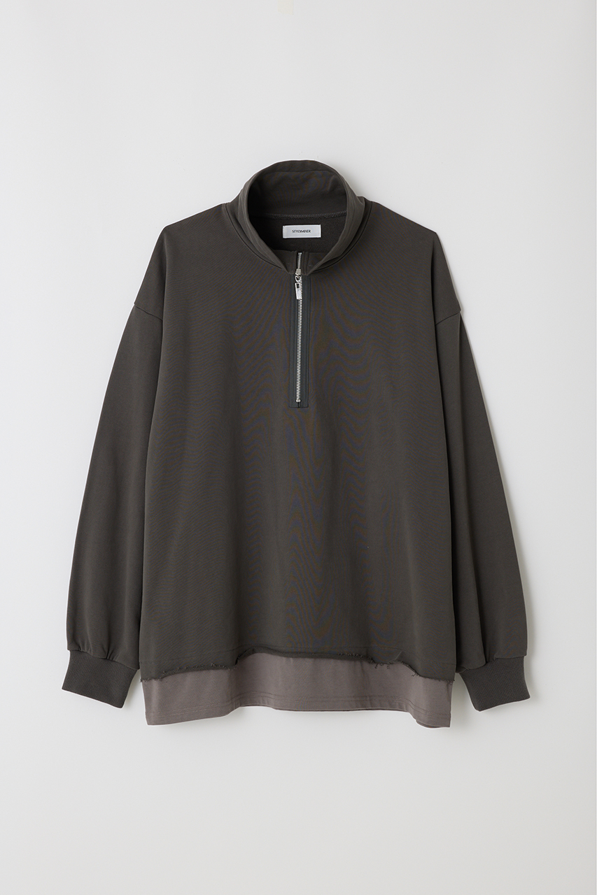 程良い厚みの綿100%裏毛を使用したハーフジップスウェット。あえての長めのファスナーテープを表使いにする事でリメイク風な雰囲気をプラス。裾はTシャツと同じ天竺素材を重ね付け。程良い切り替えのアクセントでレイヤード風に仕上げています。ストレッチあり、透け感なし。【お手入れ方法】マシンウォッシュ可