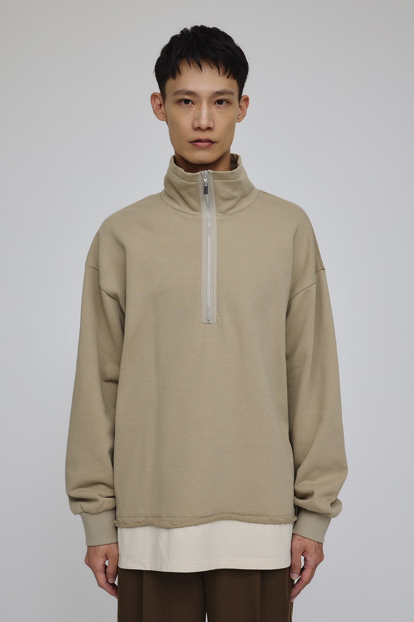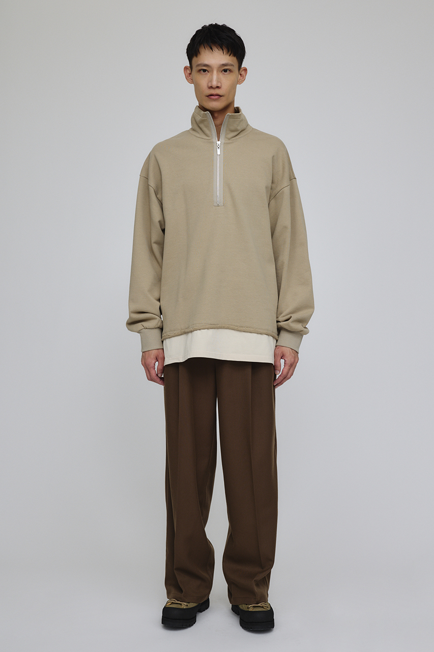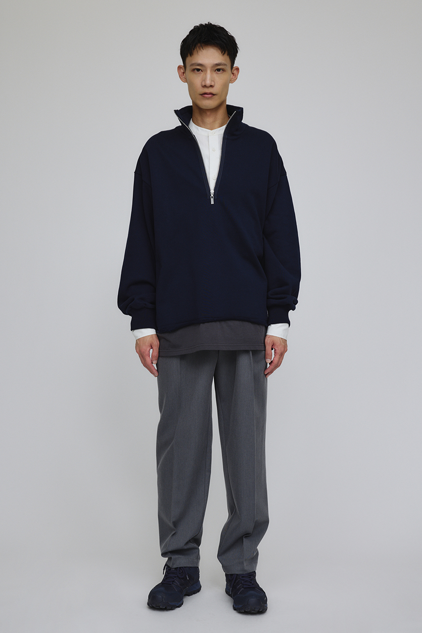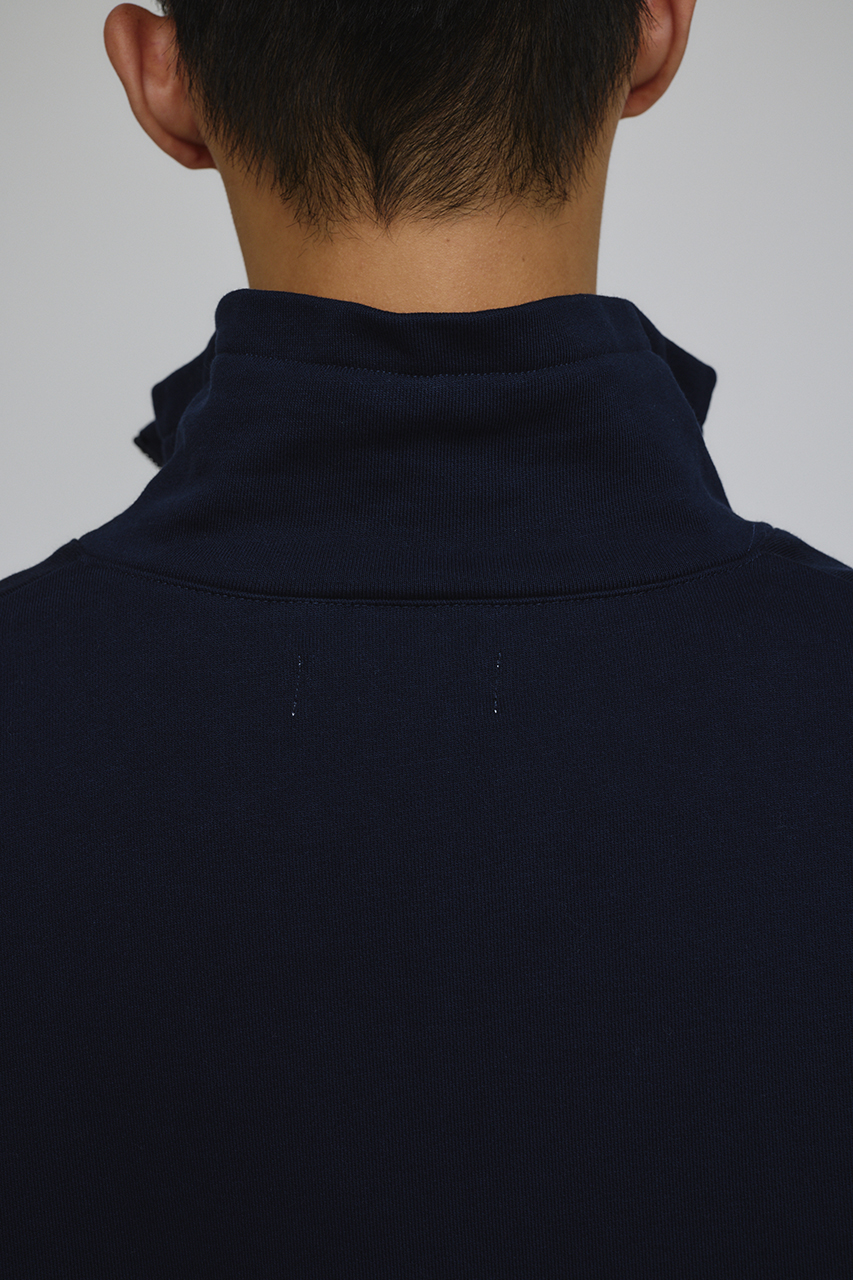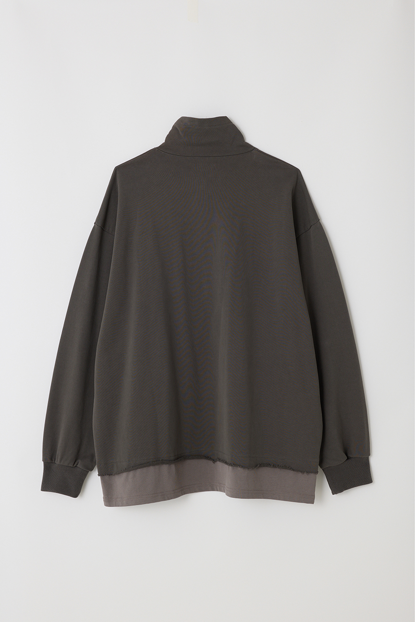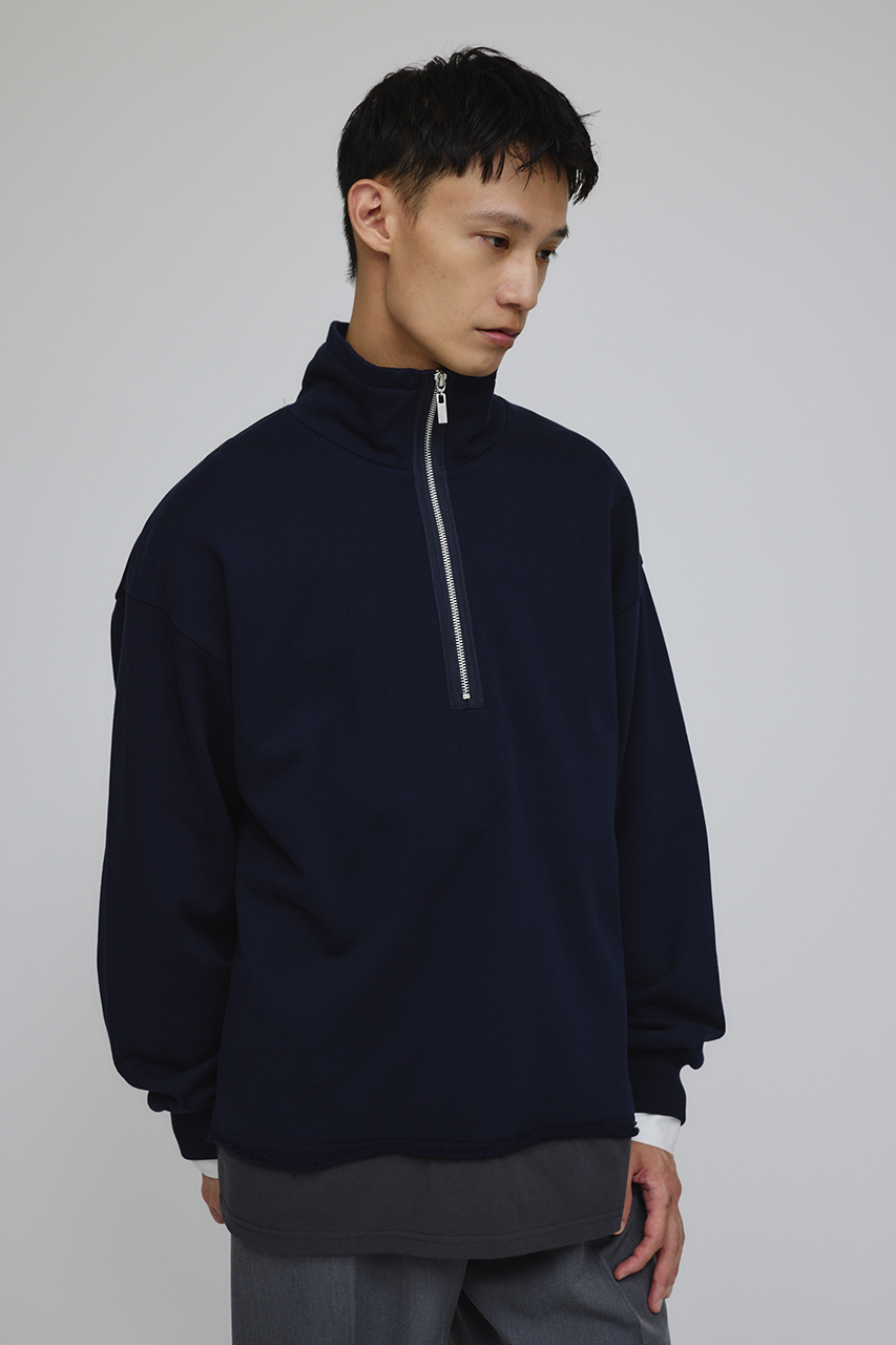 程良い厚みの綿100%裏毛を使用したハーフジップスウェット。あえての長めのファスナーテープを表使いにする事でリメイク風な雰囲気をプラス。裾はTシャツと同じ天竺素材を重ね付け。程良い切り替えのアクセントでレイヤード風に仕上げています。ストレッチあり、透け感なし。【お手入れ方法】マシンウォッシュ可
