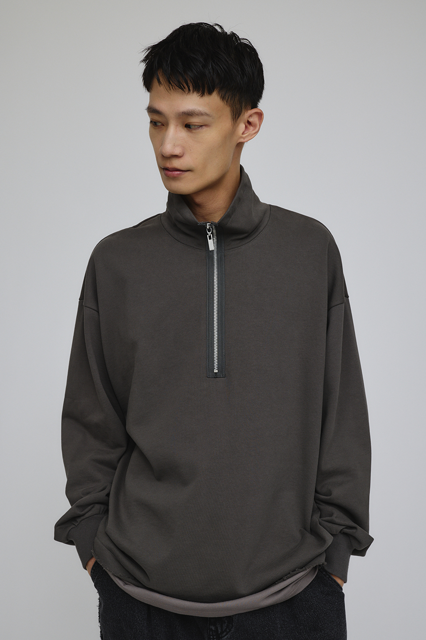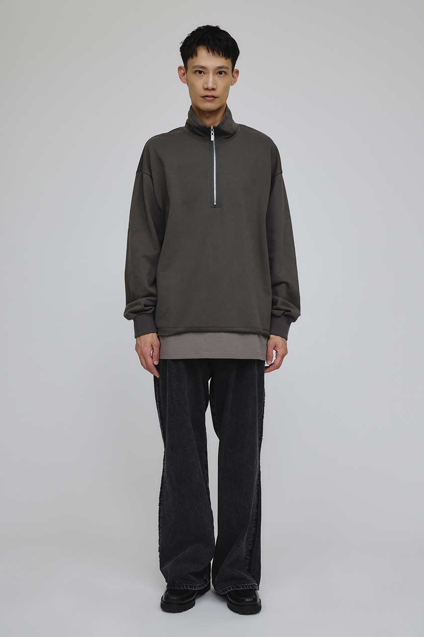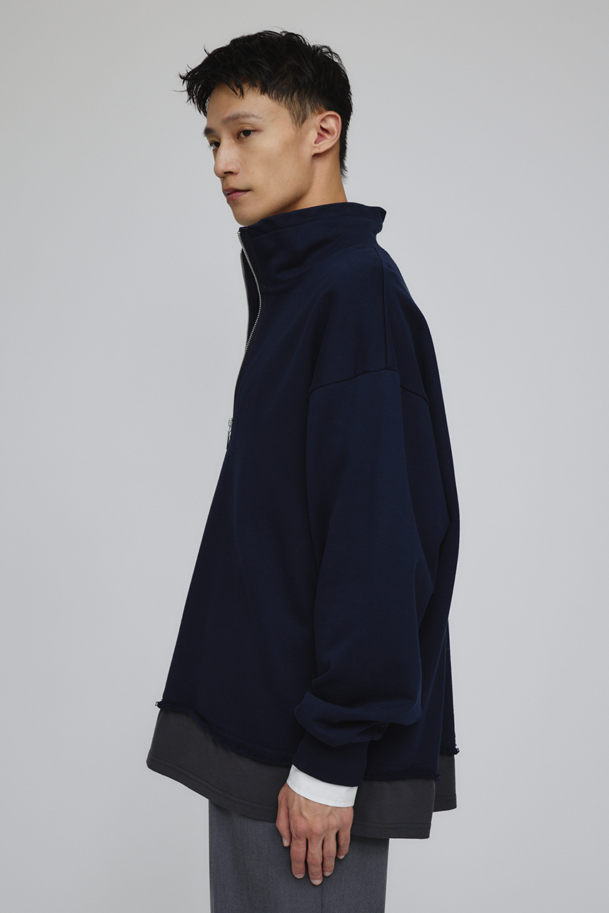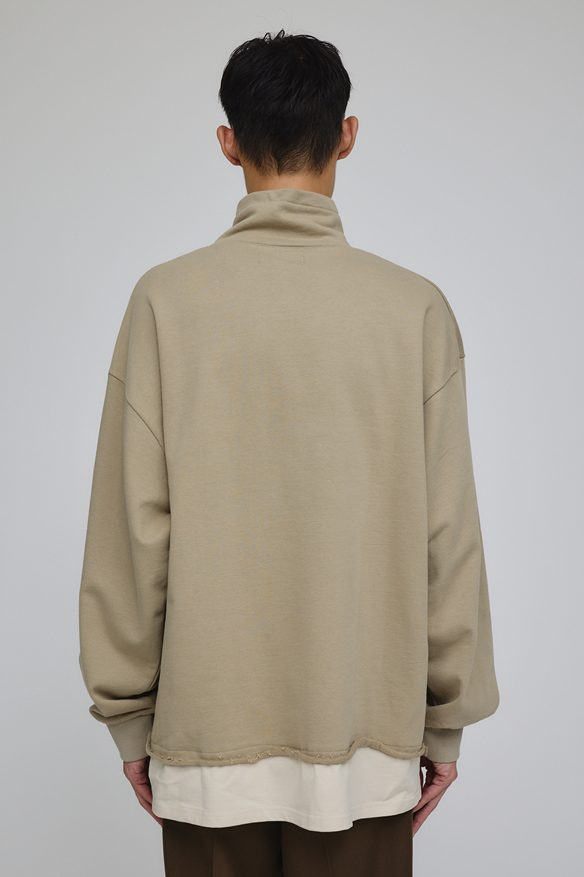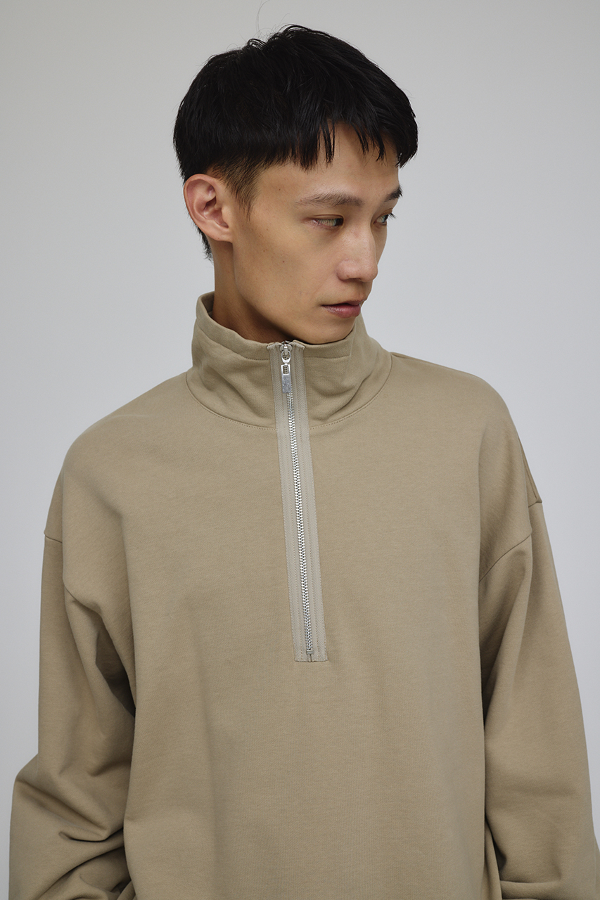 程良い厚みの綿100%裏毛を使用したハーフジップスウェット。あえての長めのファスナーテープを表使いにする事でリメイク風な雰囲気をプラス。裾はTシャツと同じ天竺素材を重ね付け。程良い切り替えのアクセントでレイヤード風に仕上げています。ストレッチあり、透け感なし。【お手入れ方法】マシンウォッシュ可
