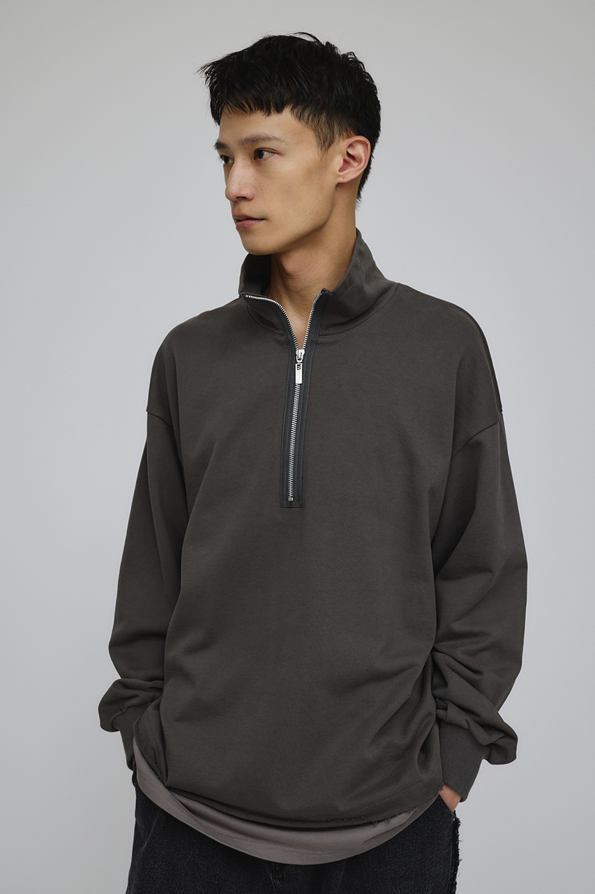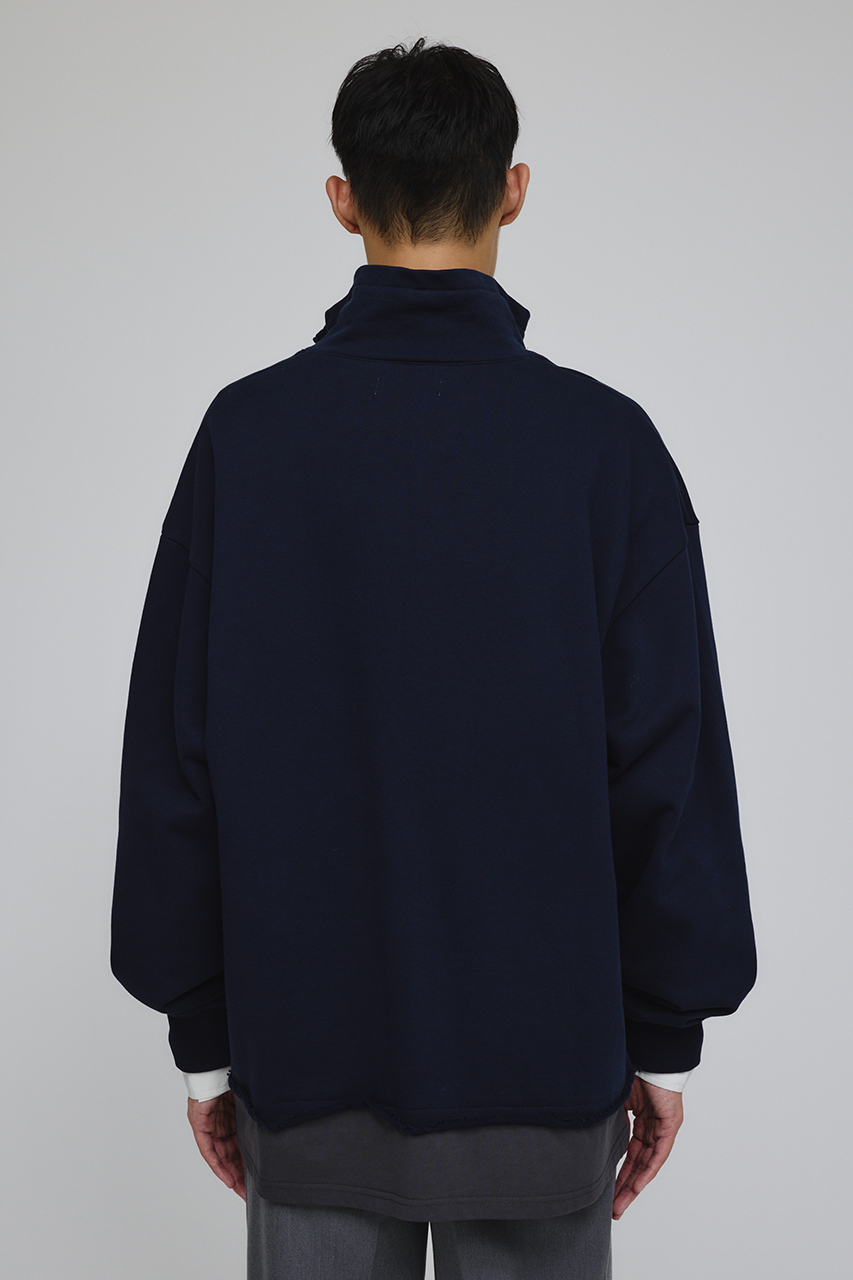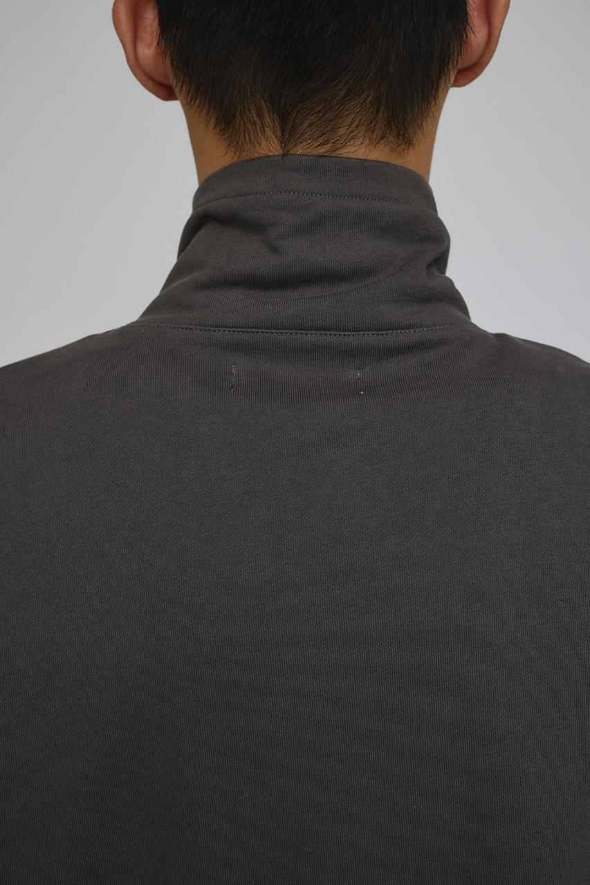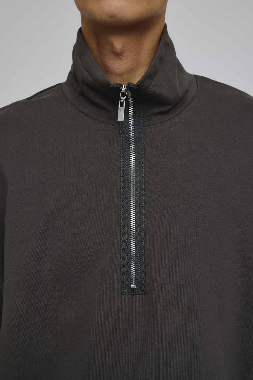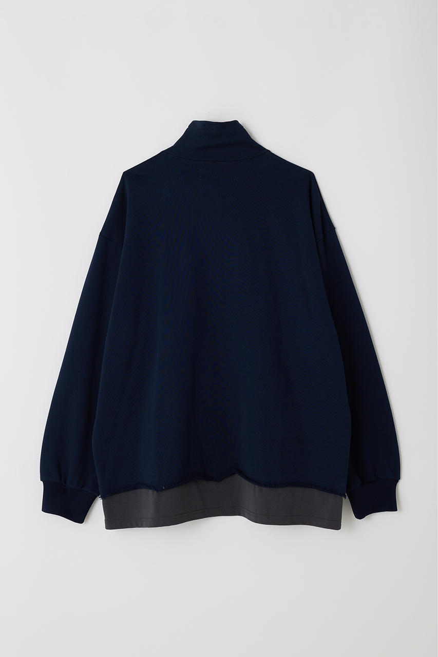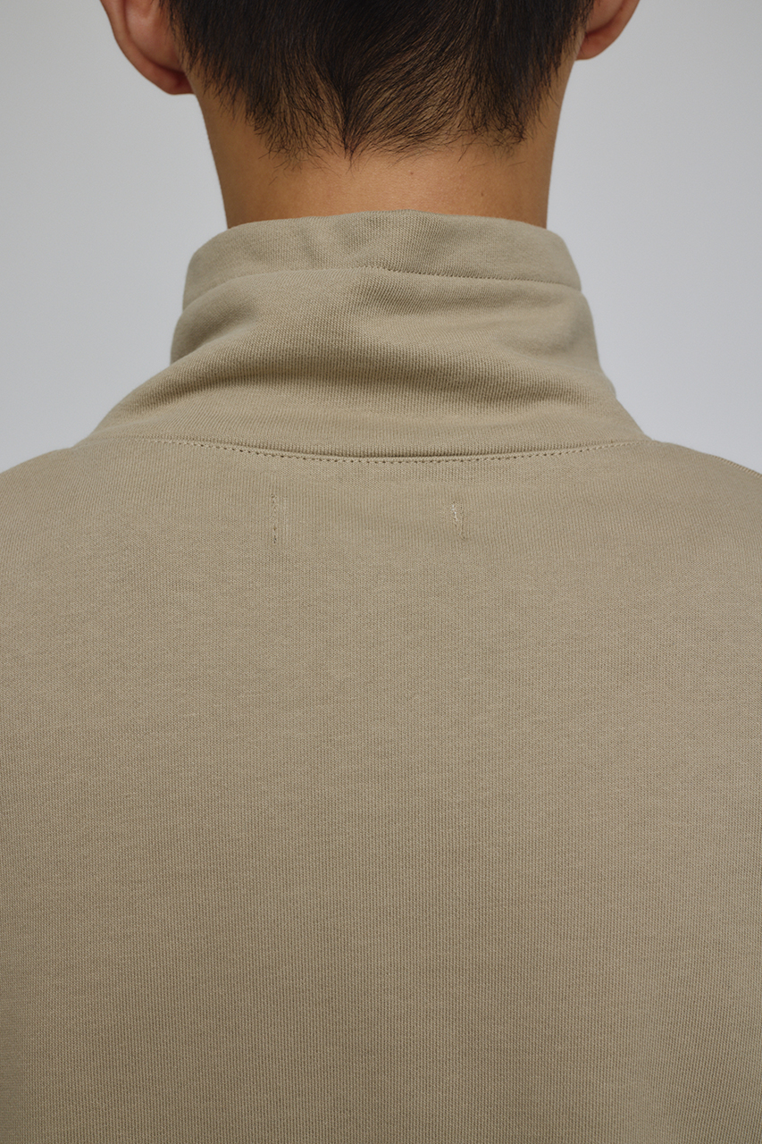 程良い厚みの綿100%裏毛を使用したハーフジップスウェット。あえての長めのファスナーテープを表使いにする事でリメイク風な雰囲気をプラス。裾はTシャツと同じ天竺素材を重ね付け。程良い切り替えのアクセントでレイヤード風に仕上げています。ストレッチあり、透け感なし。【お手入れ方法】マシンウォッシュ可