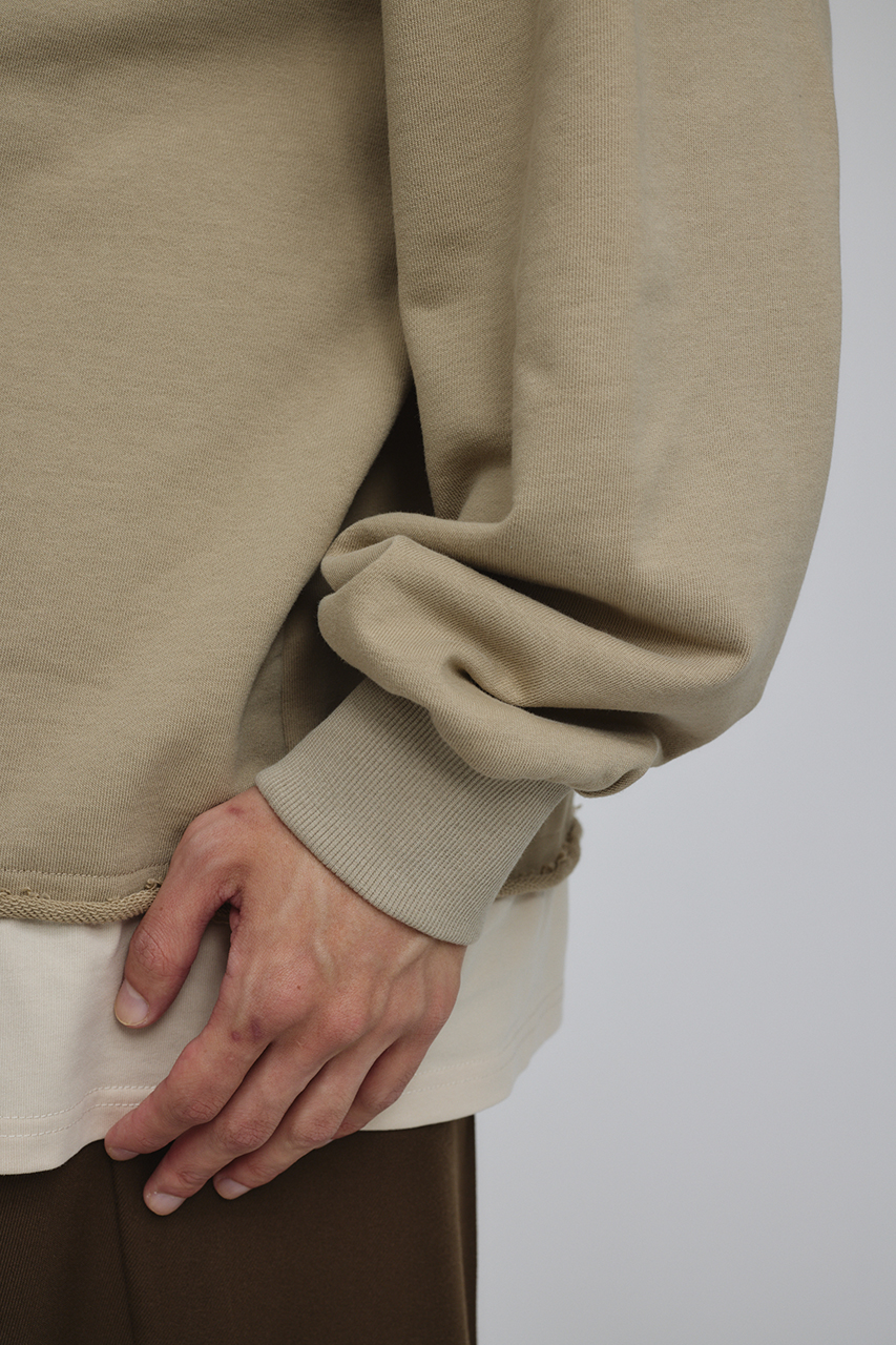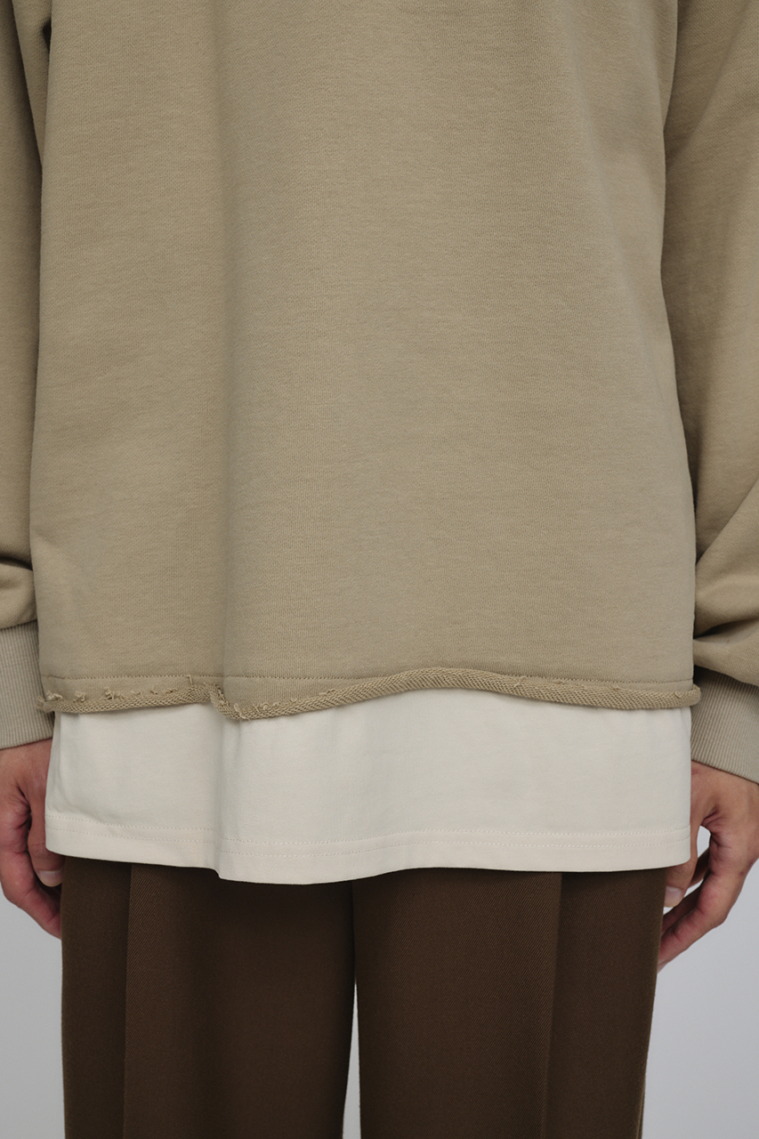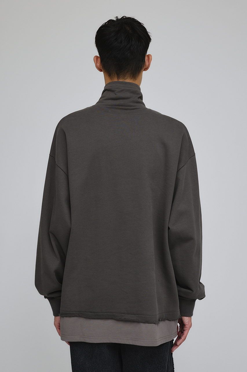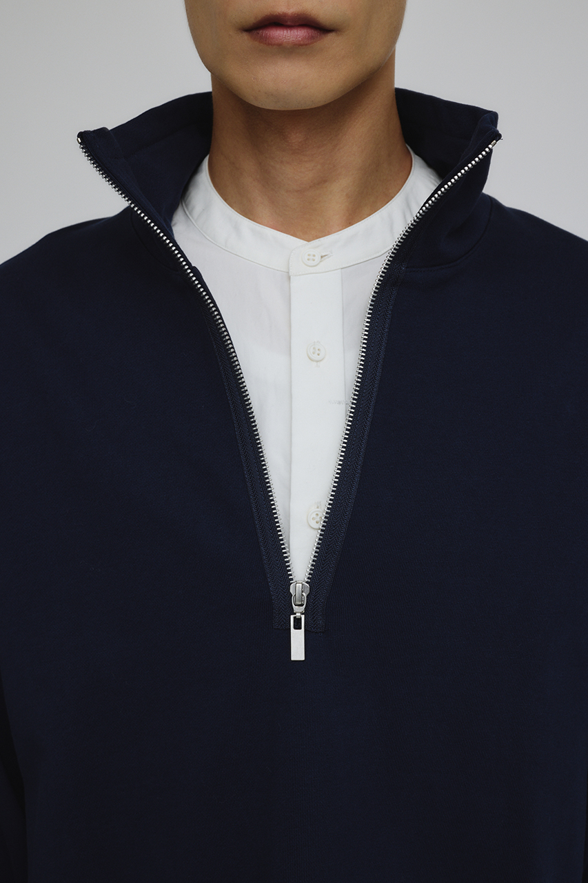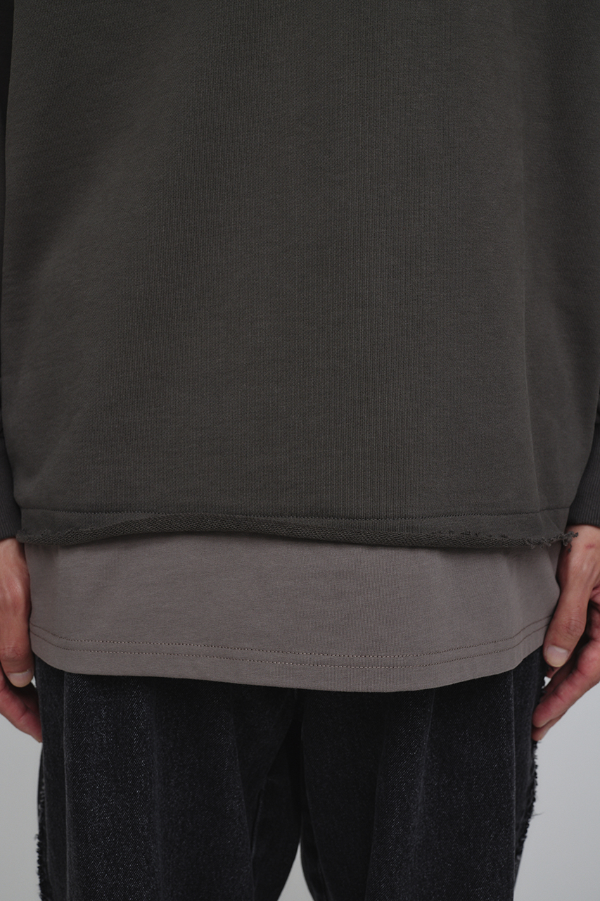 程良い厚みの綿100%裏毛を使用したハーフジップスウェット。あえての長めのファスナーテープを表使いにする事でリメイク風な雰囲気をプラス。裾はTシャツと同じ天竺素材を重ね付け。程良い切り替えのアクセントでレイヤード風に仕上げています。ストレッチあり、透け感なし。【お手入れ方法】マシンウォッシュ可