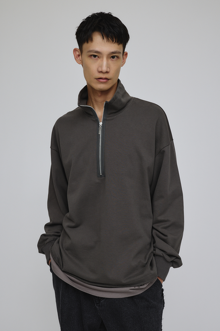 程良い厚みの綿100%裏毛を使用したハーフジップスウェット。あえての長めのファスナーテープを表使いにする事でリメイク風な雰囲気をプラス。裾はTシャツと同じ天竺素材を重ね付け。程良い切り替えのアクセントでレイヤード風に仕上げています。ストレッチあり、透け感なし。【お手入れ方法】マシンウォッシュ可