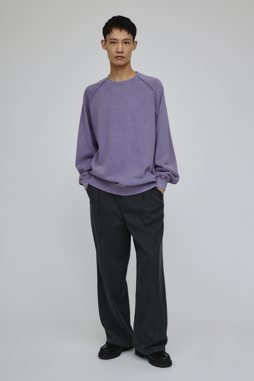 しっかりと厚みのある裏毛のスウェットを硫化染めした後、パウダーブリーチを施したフェード感のあるクルーネックスウェット。
