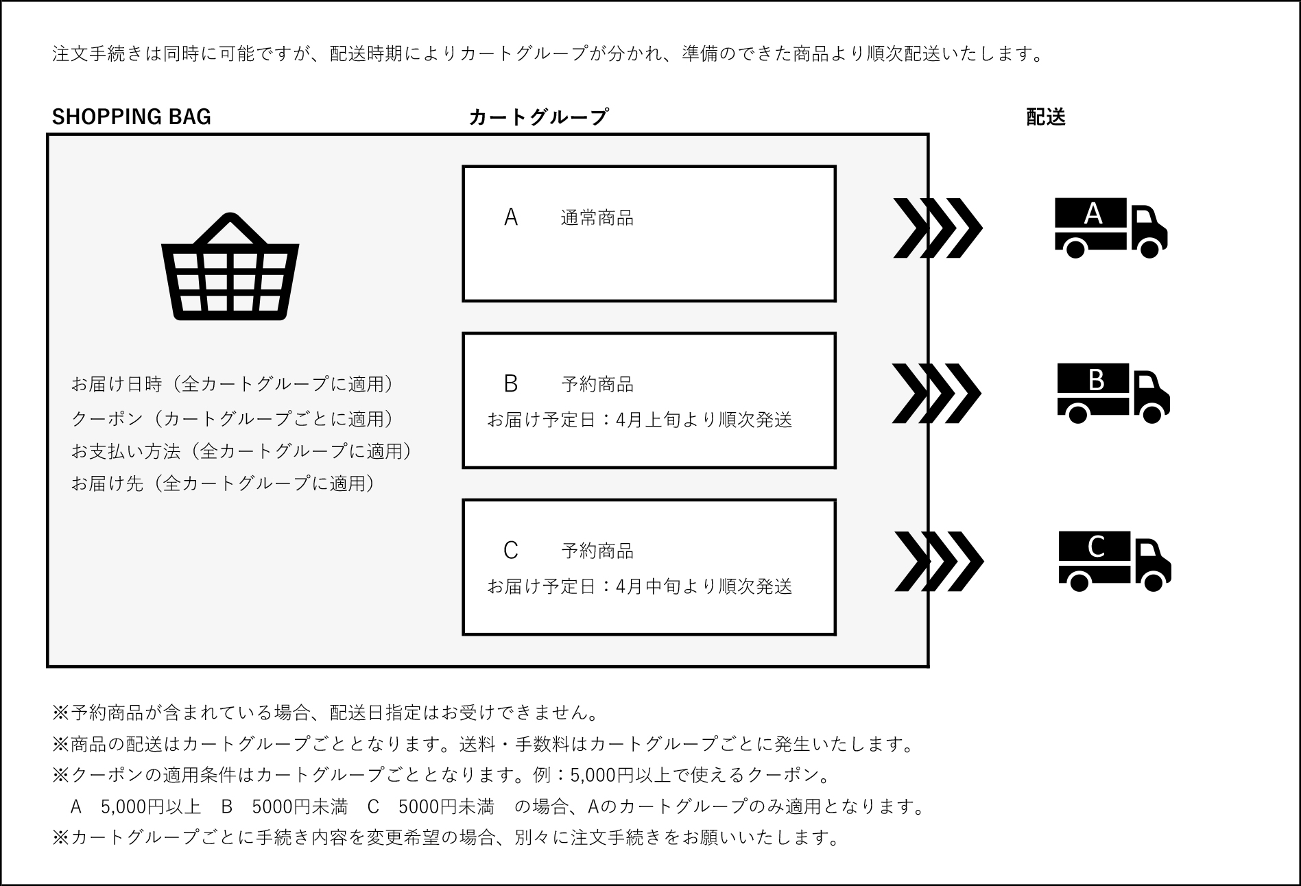 通常商品、予約商品は同時に注文手続きが可能ですが、配送時期によりカートグループが分かれ、配送はカートグループごととなります。