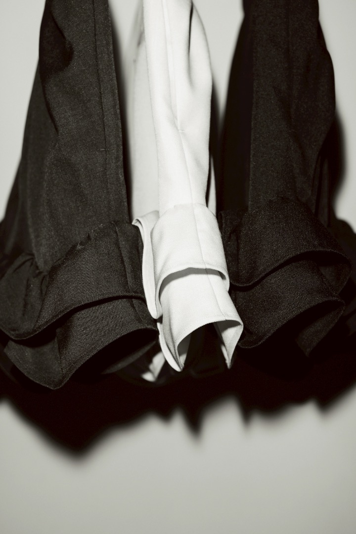 アームのパネルをあえてなくし、袖上にタックと細身の袖で独特のカーブスリーブが腕周りをしなやかなに見せてくれます。