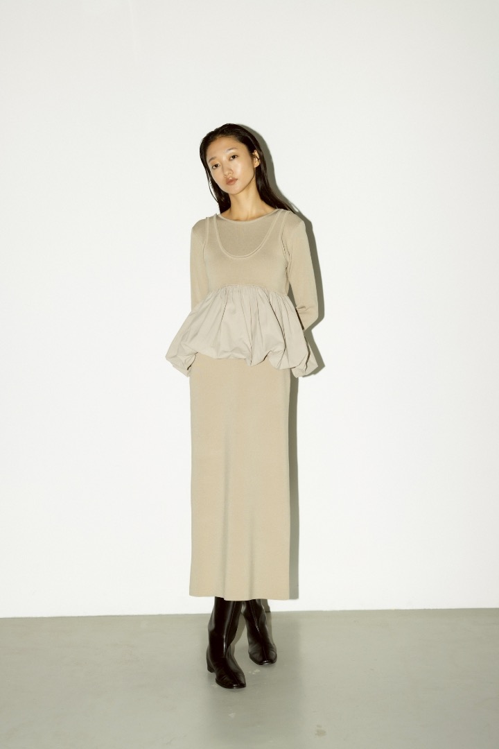 • バルーンペプラムベストとナローシルエットワンピースのセットアイテム。