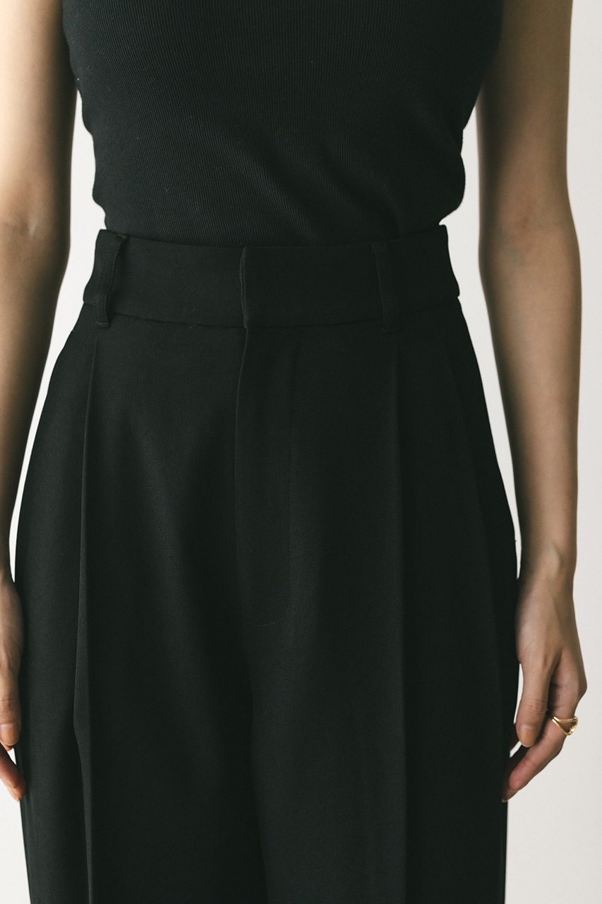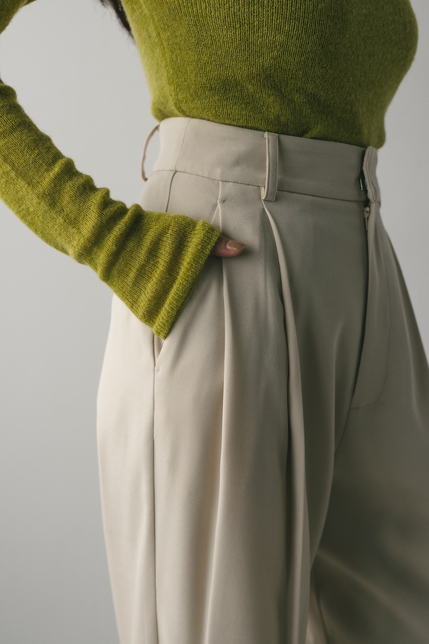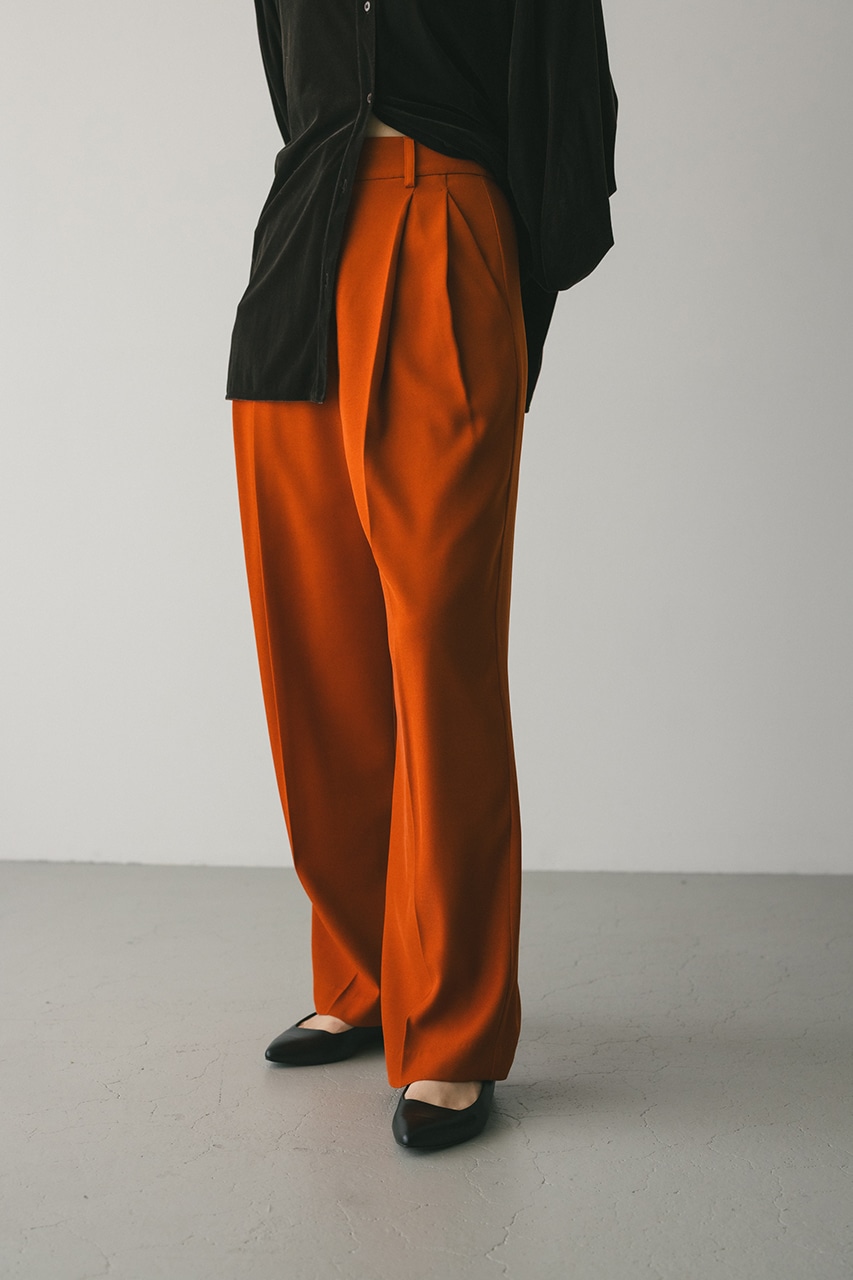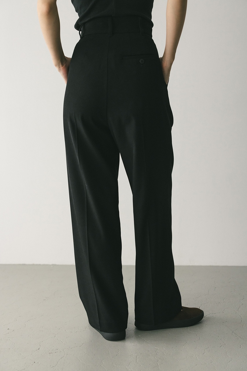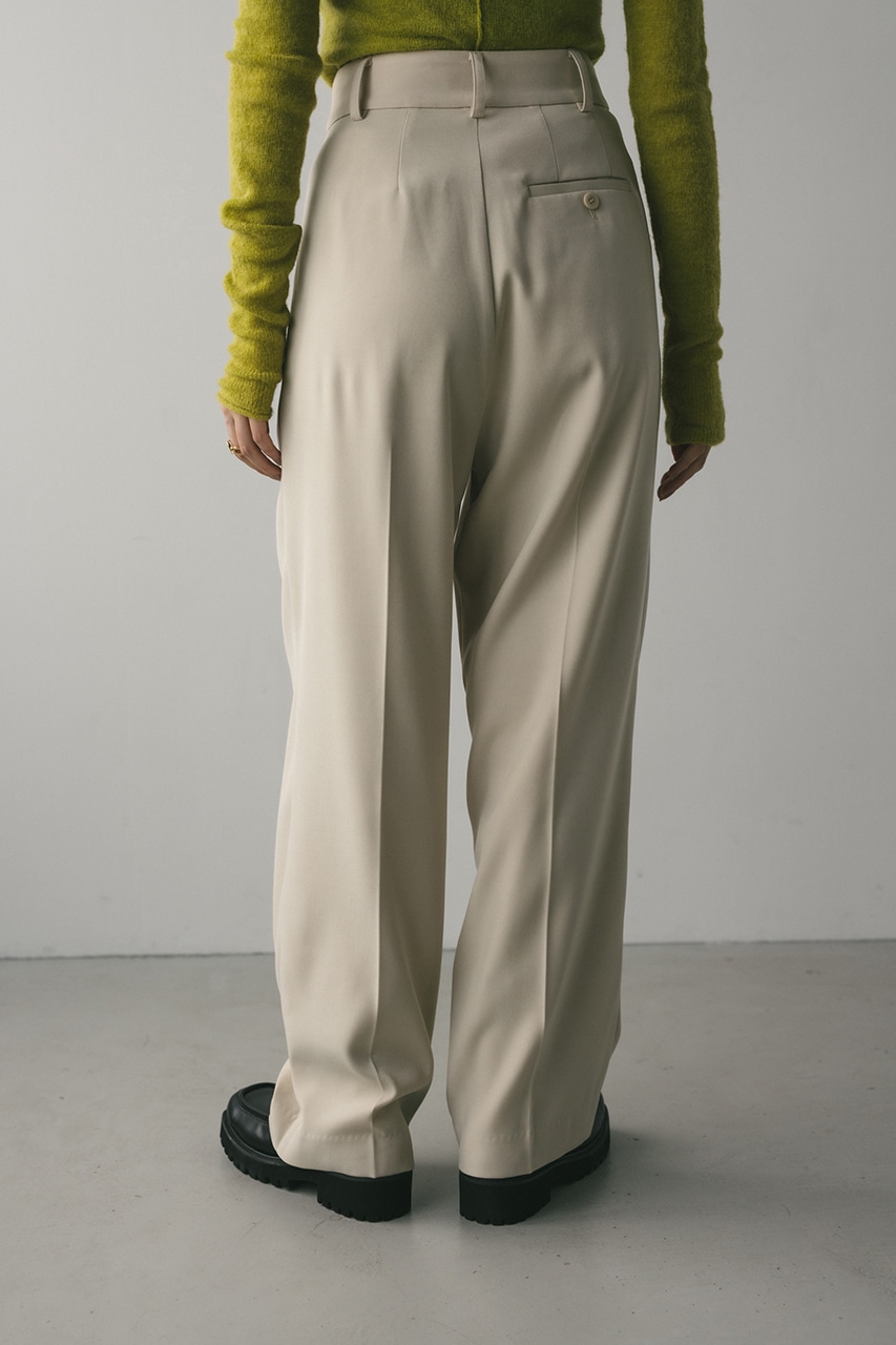 スタミキ定番人気のタックパンツ。深く入れた2本のタックとセンタープレスが美しいシルエットをつくり、上品なマニッシュモードスタイルを完成させます。透け感なし、ストレッチややあり。パンツ丈通常もご用意しています。(500IAA31-2591 ベーシックツータックパンツ)