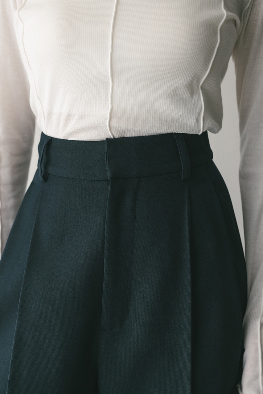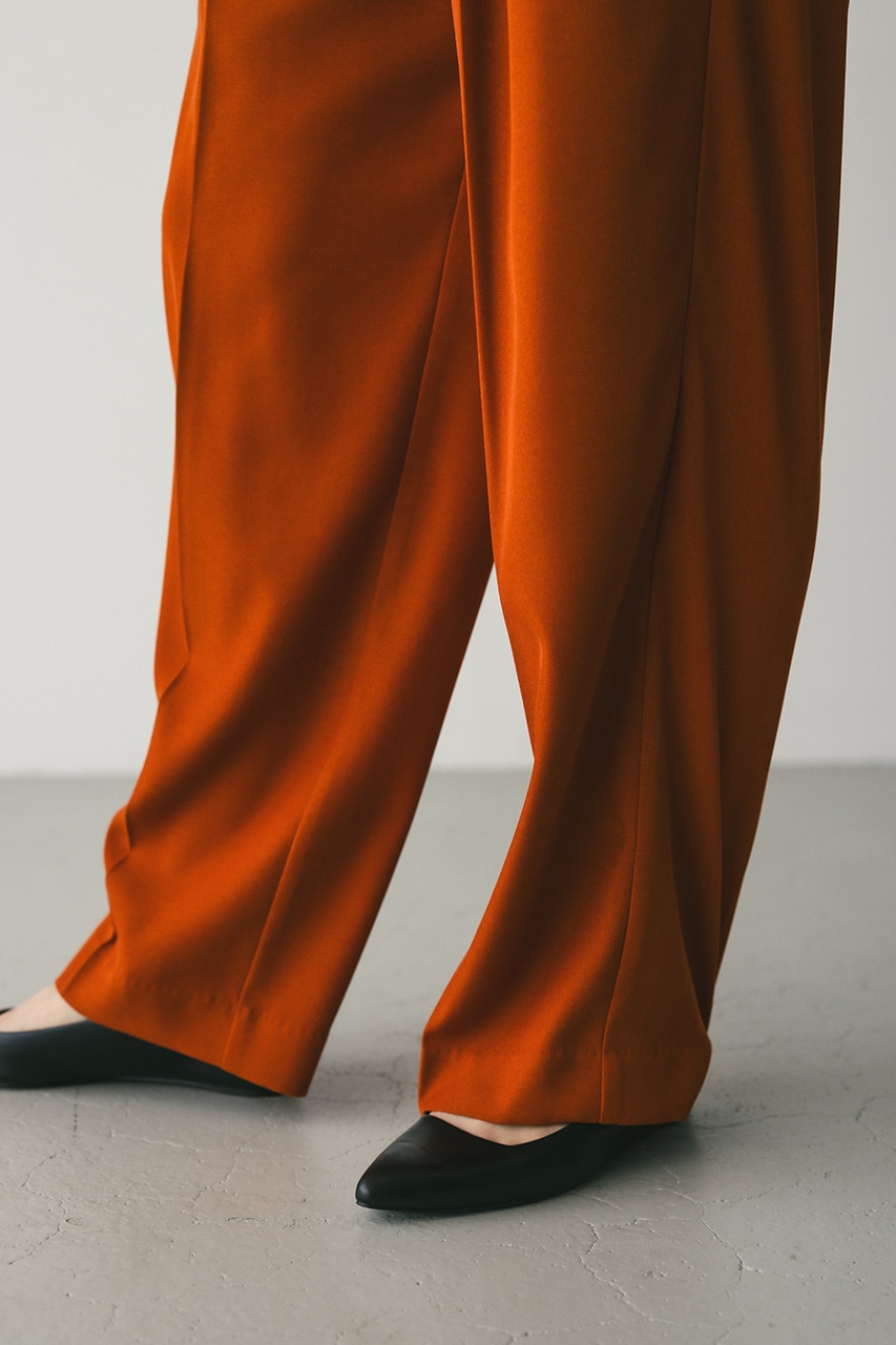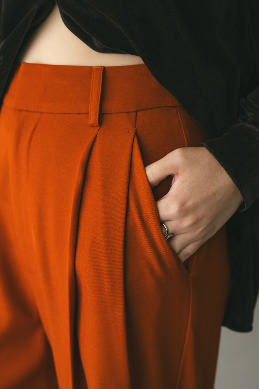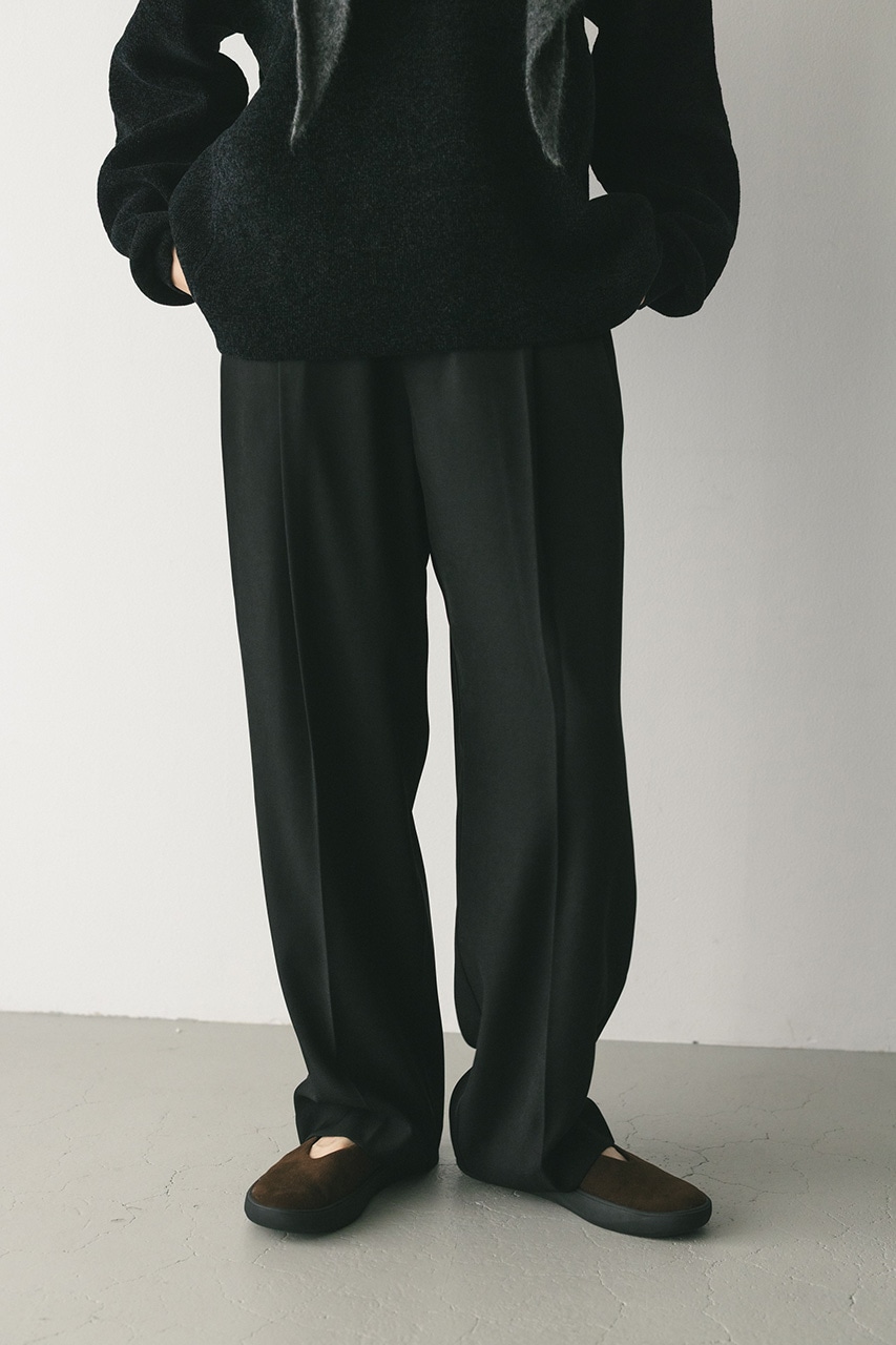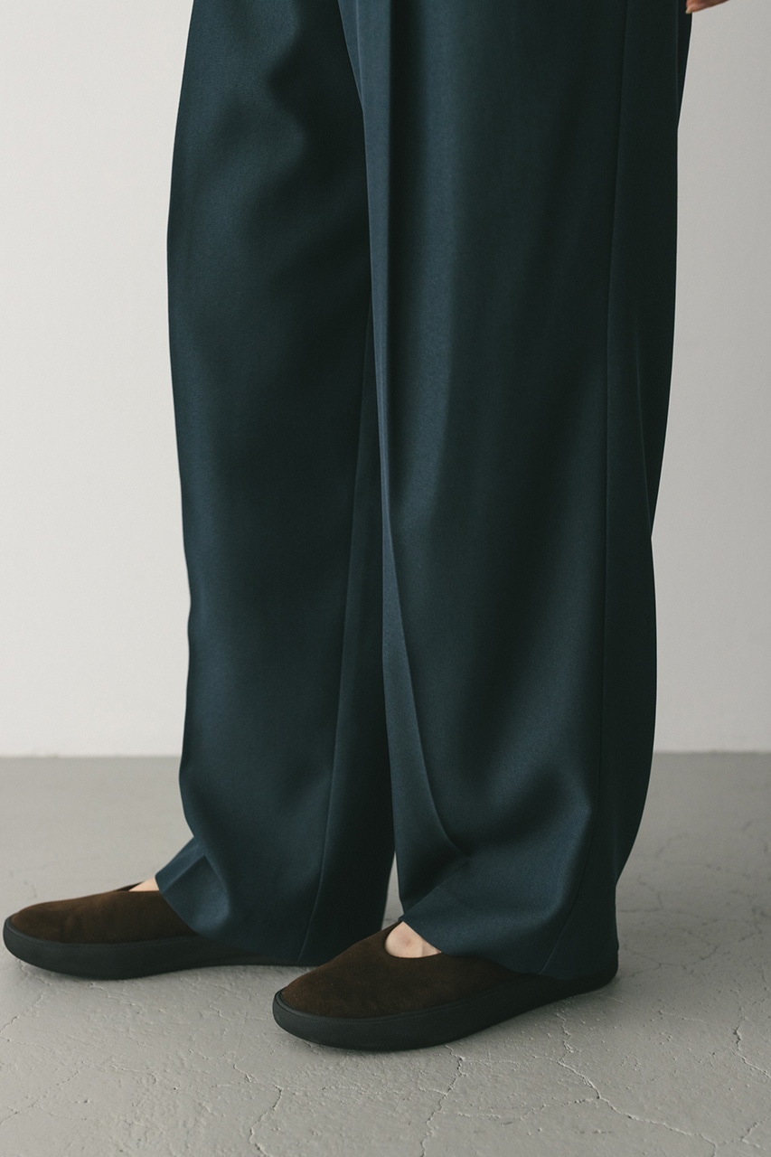 スタミキ定番人気のタックパンツ。深く入れた2本のタックとセンタープレスが美しいシルエットをつくり、上品なマニッシュモードスタイルを完成させます。透け感なし、ストレッチややあり。パンツ丈通常もご用意しています。(500IAA31-2591 ベーシックツータックパンツ)