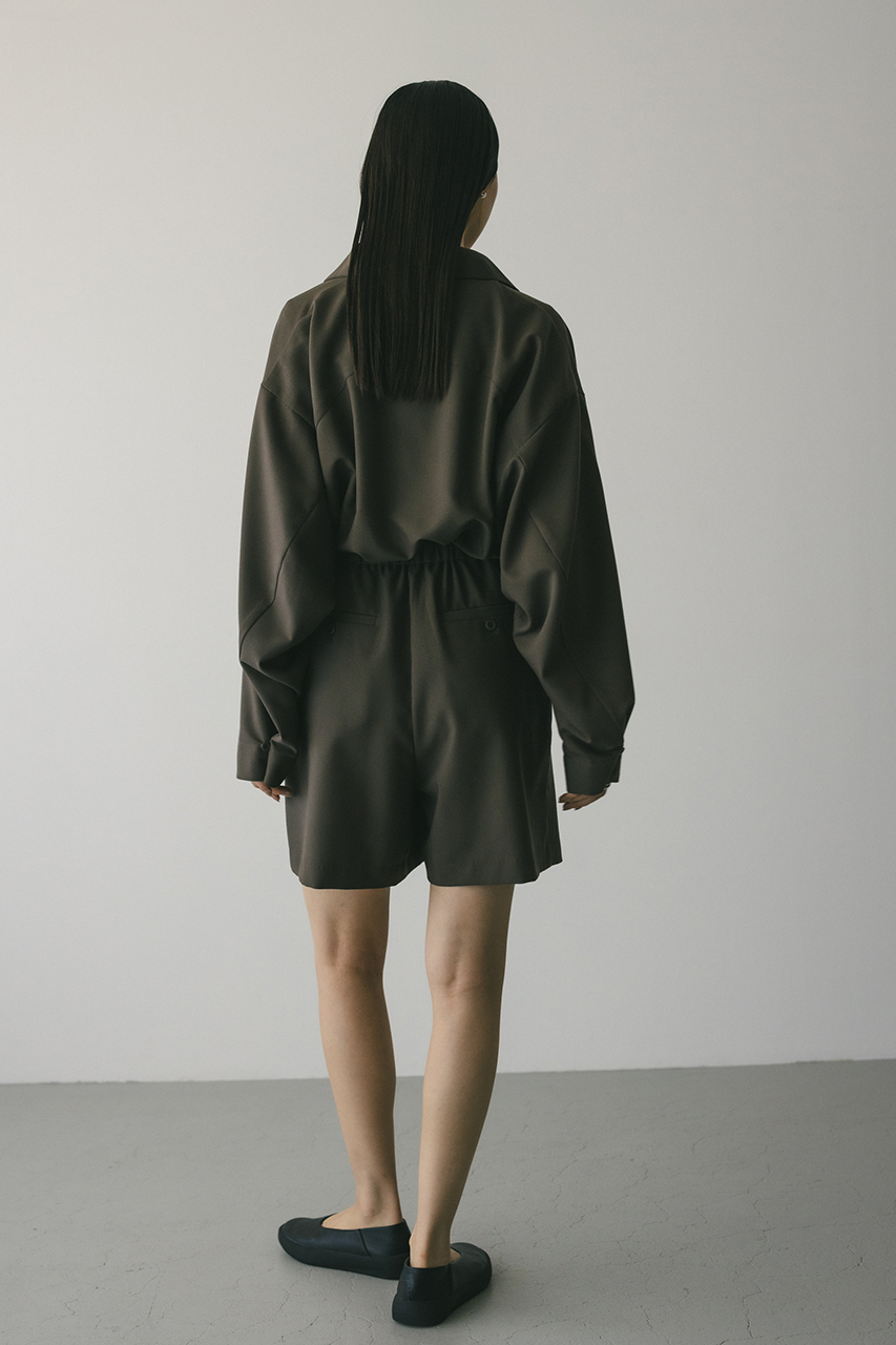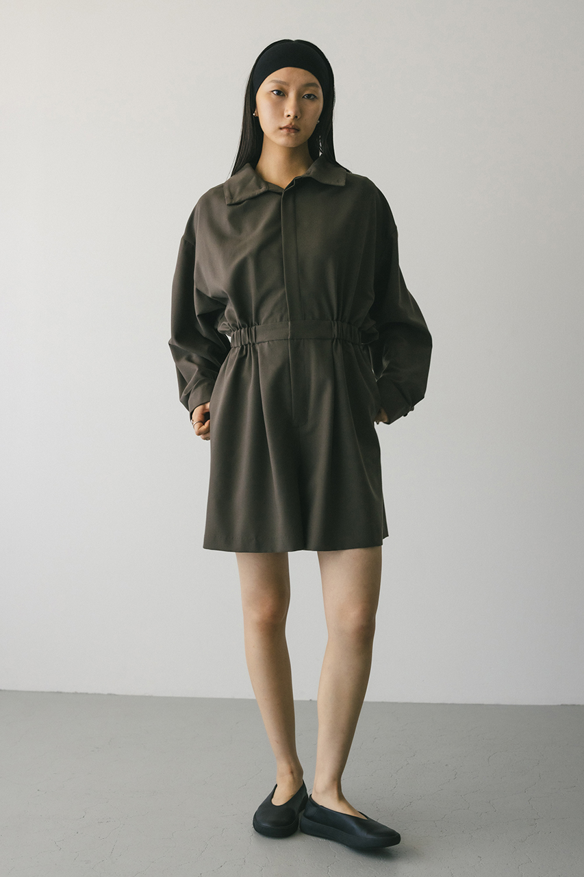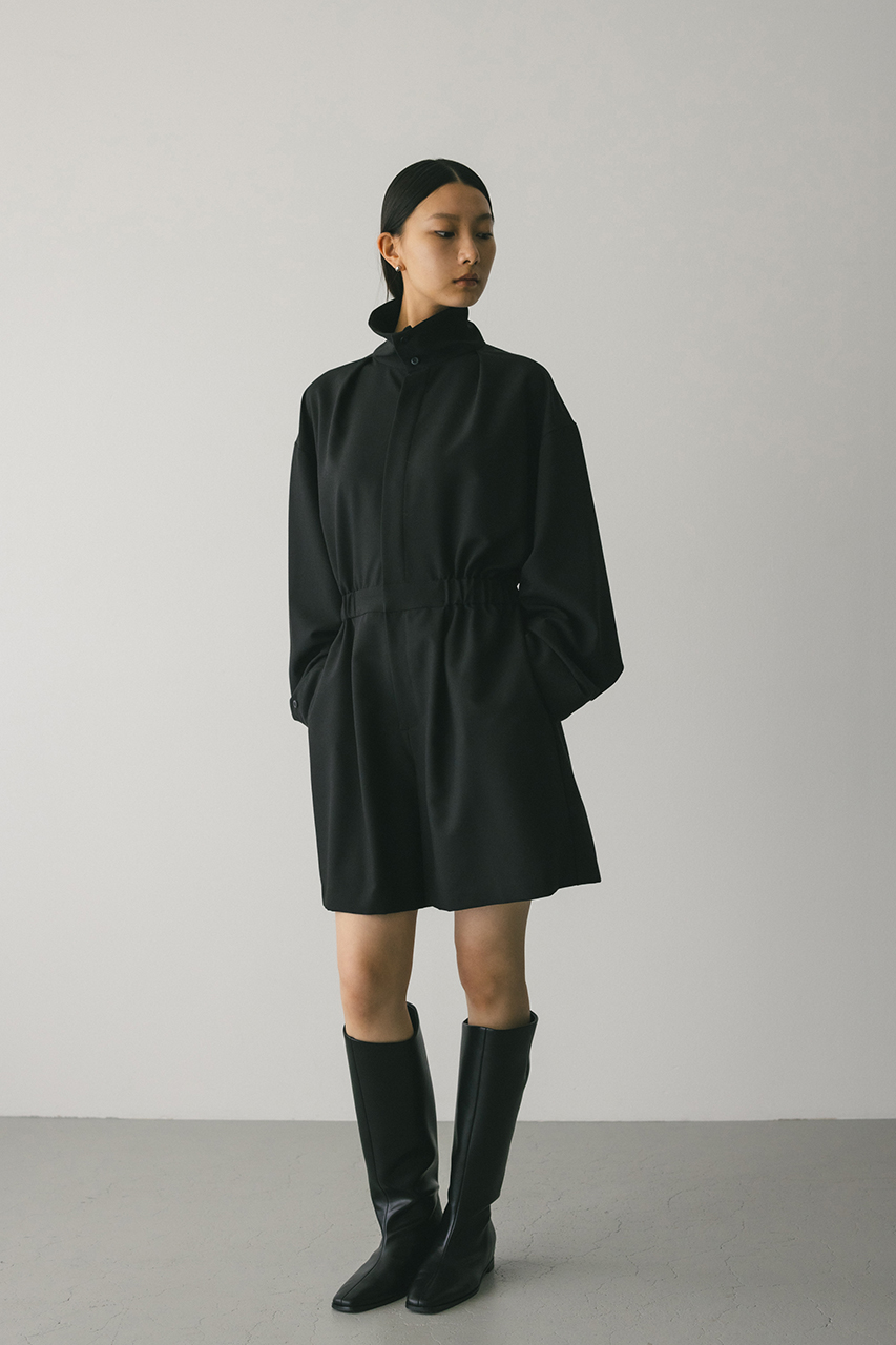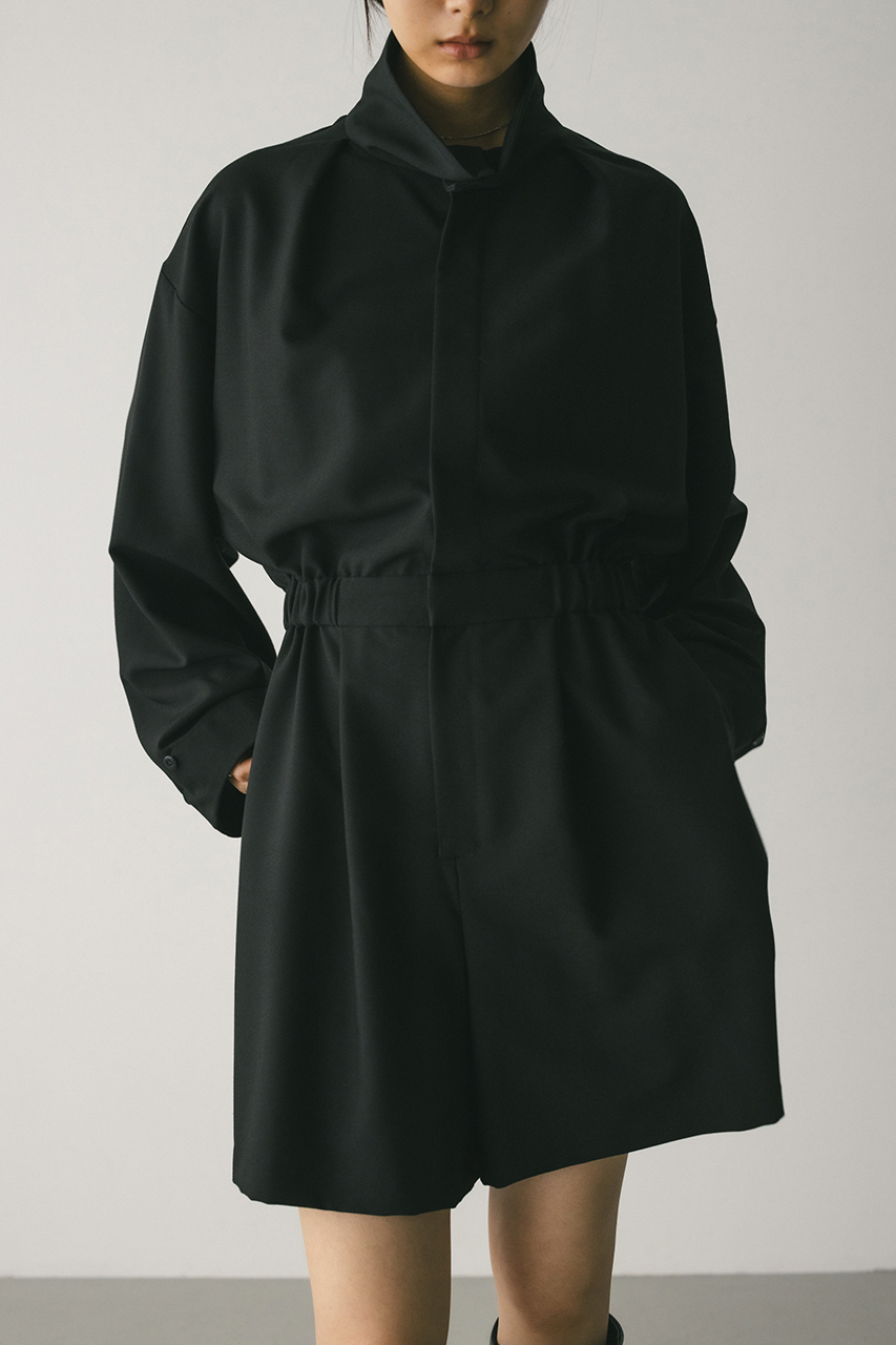 スタンドネックがモードなショート丈ロンパース。ウエストのゴムでブラウジングされるので程よい抜け感が加わり、カジュアルに着用いただけます。袖口のボタンでワイドスリーブやフォルムスリーブなど気分で変えていただけます。ポケット付き。ストレッチなし、透け感なし。