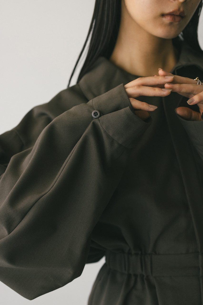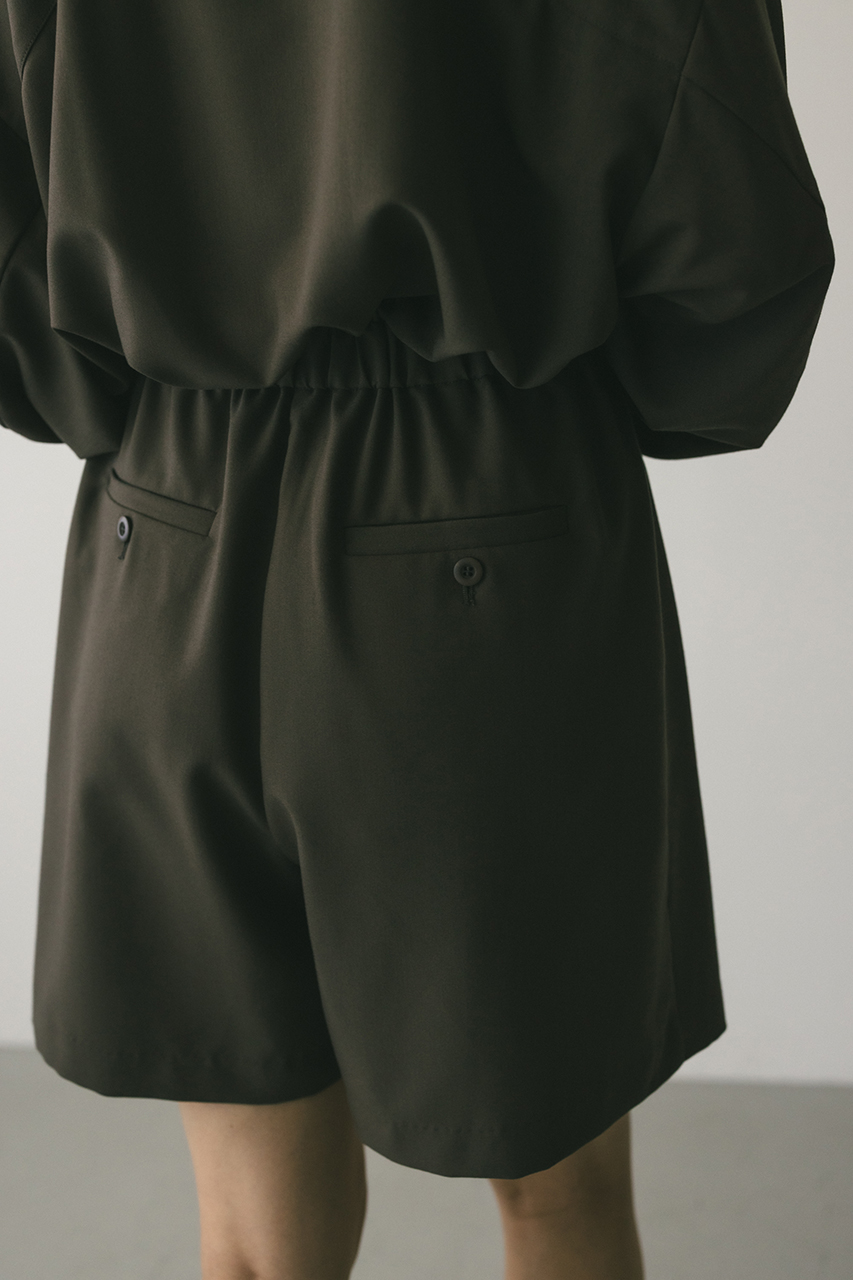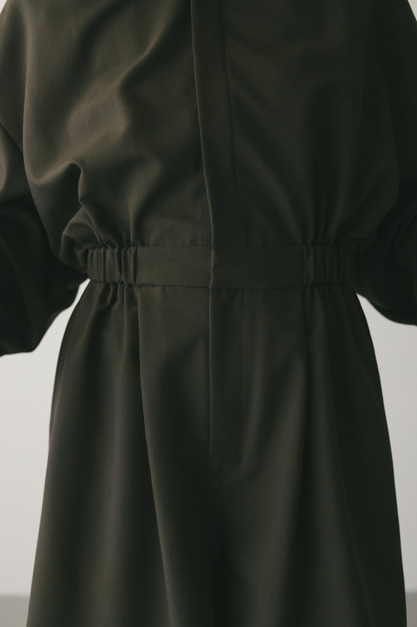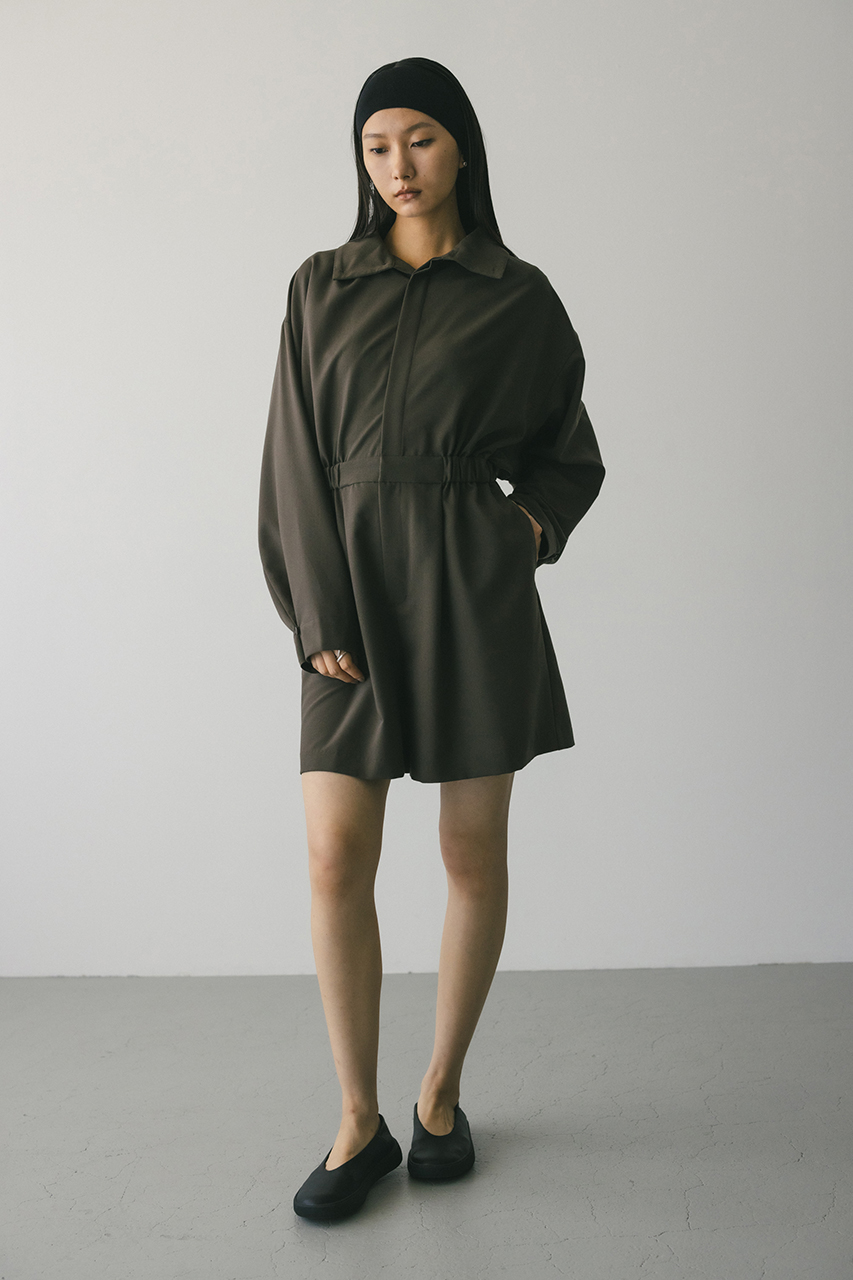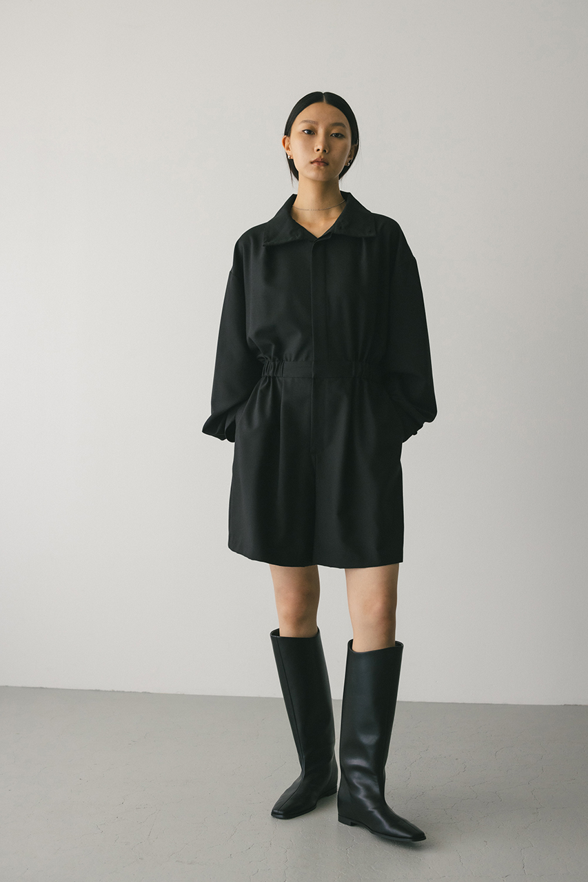スタンドネックがモードなショート丈ロンパース。ウエストのゴムでブラウジングされるので程よい抜け感が加わり、カジュアルに着用いただけます。袖口のボタンでワイドスリーブやフォルムスリーブなど気分で変えていただけます。ポケット付き。ストレッチなし、透け感なし。