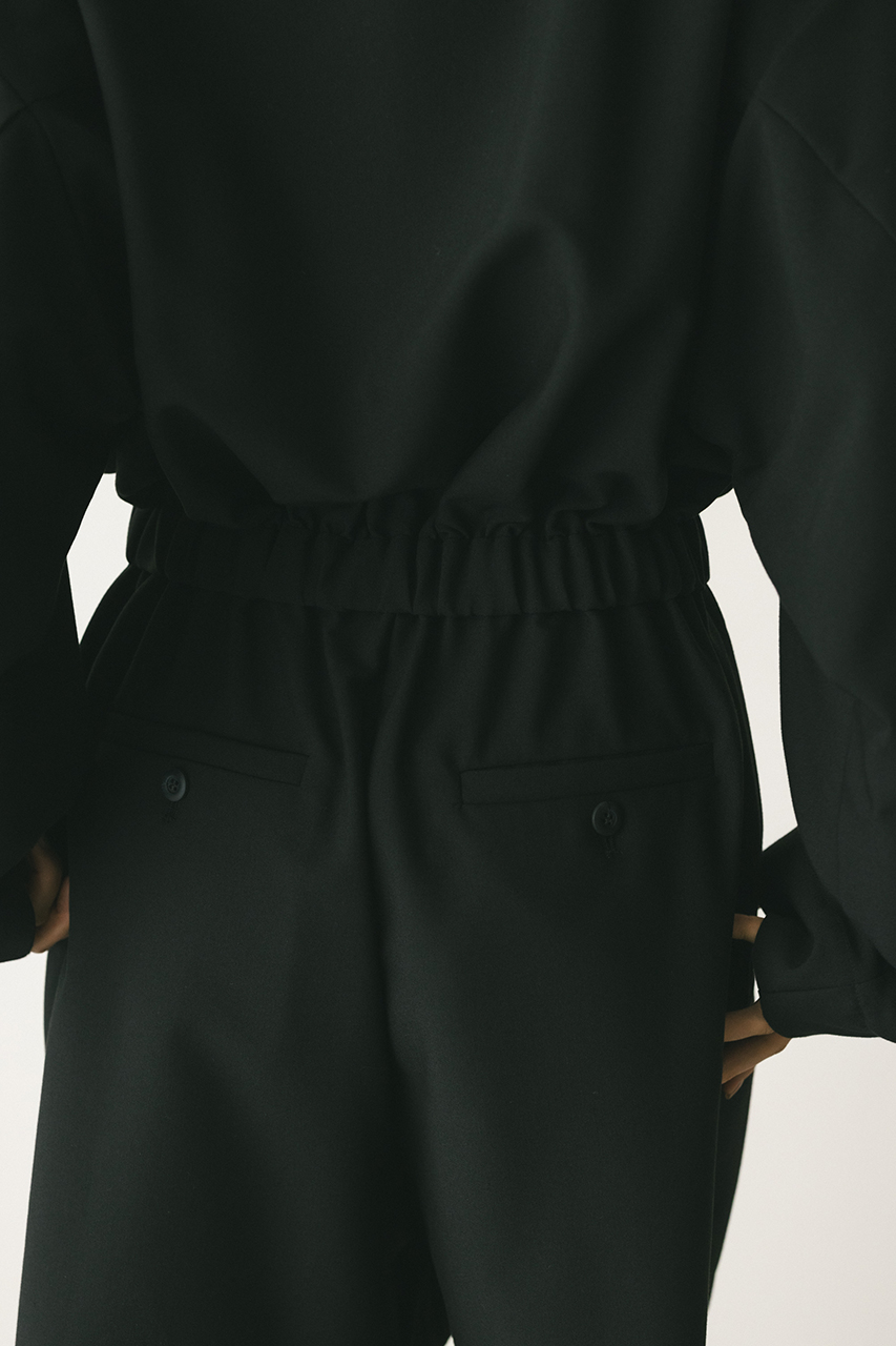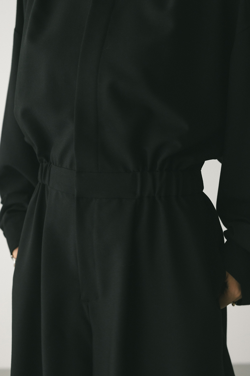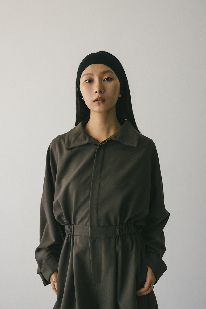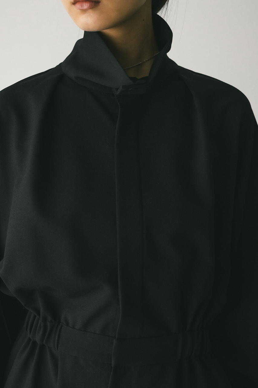 スタンドネックがモードなショート丈ロンパース。ウエストのゴムでブラウジングされるので程よい抜け感が加わり、カジュアルに着用いただけます。袖口のボタンでワイドスリーブやフォルムスリーブなど気分で変えていただけます。ポケット付き。ストレッチなし、透け感なし。