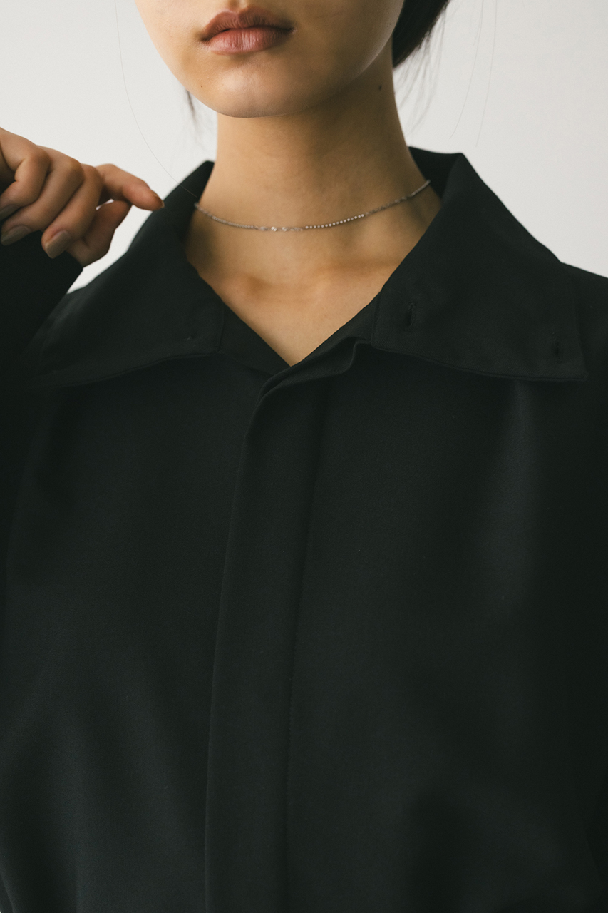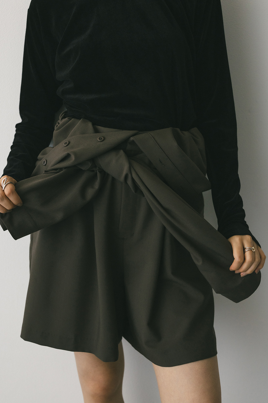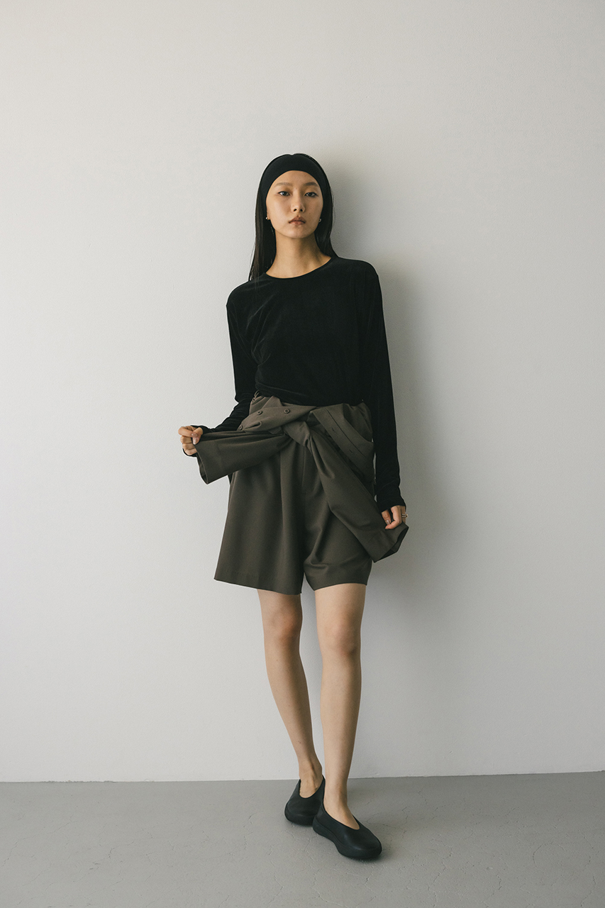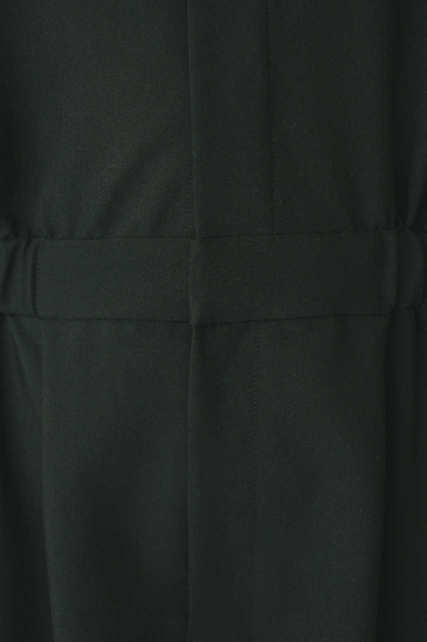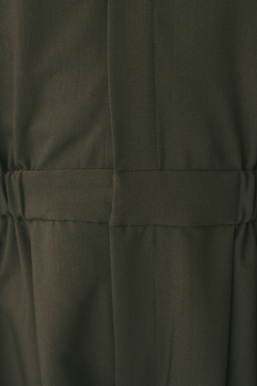 スタンドネックがモードなショート丈ロンパース。ウエストのゴムでブラウジングされるので程よい抜け感が加わり、カジュアルに着用いただけます。袖口のボタンでワイドスリーブやフォルムスリーブなど気分で変えていただけます。ポケット付き。ストレッチなし、透け感なし。