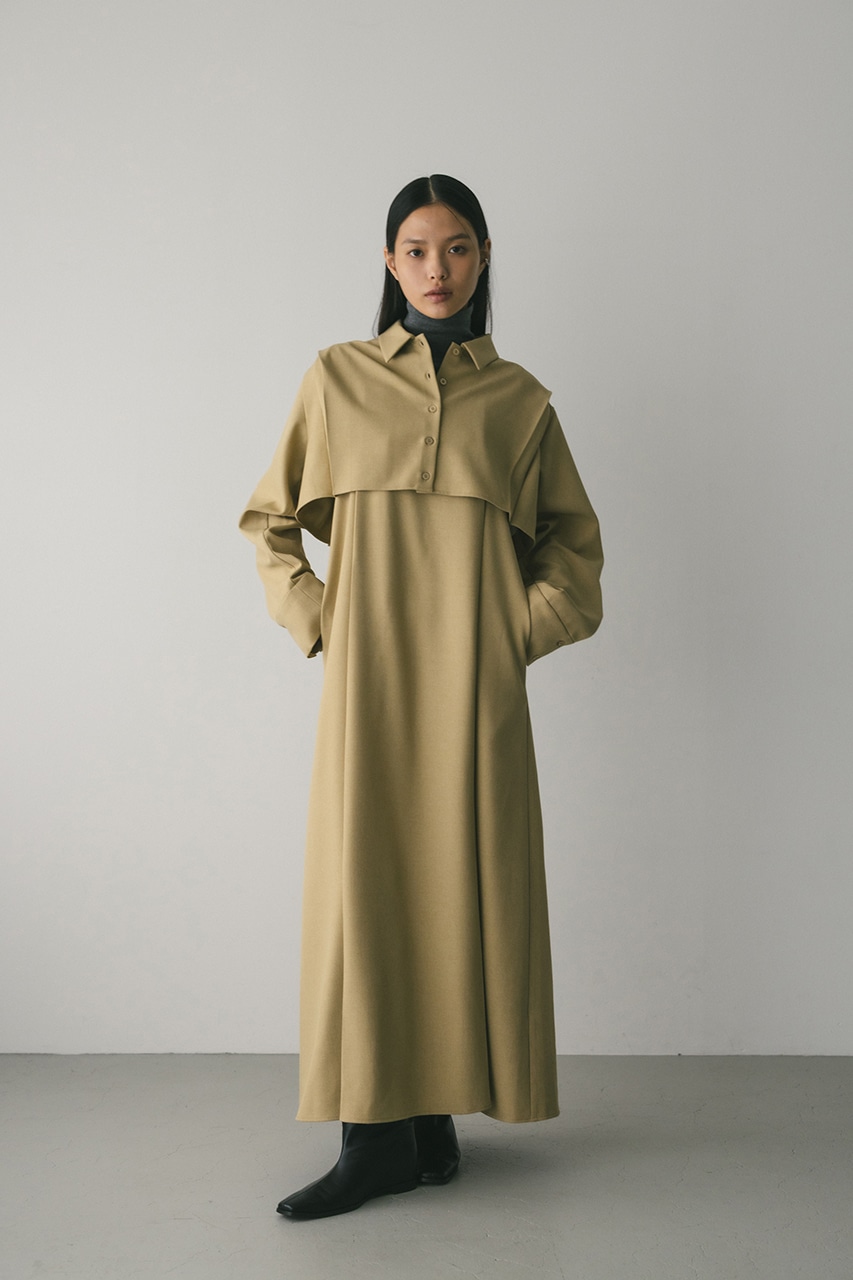 上品なメランジ見えする程よく厚みのある素材を使用したシャツワンピース。肩にタックを入れたボックスシルエットのシャツトップスとナローシルエットのキャミワンピースのセットアイテム。シャツは上から羽織ることも、ワンピースの中に着用することも可能。それぞれ別々でのスタイリングも楽しめます。肩紐は調整可能。ストレッチなし、透け感なし。