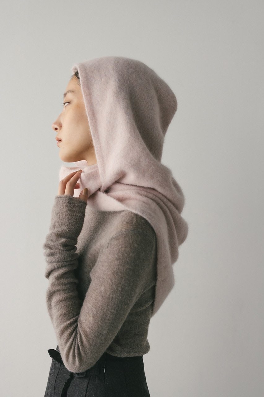 アンゴラ混の糸で編み上げた柔らかな風合いのニットスカーフ。三角型のスカーフにフード付きなので、防寒対策にもおすすめです。コートやニットの上に巻くだけでこなれた印象になれるアイテム。