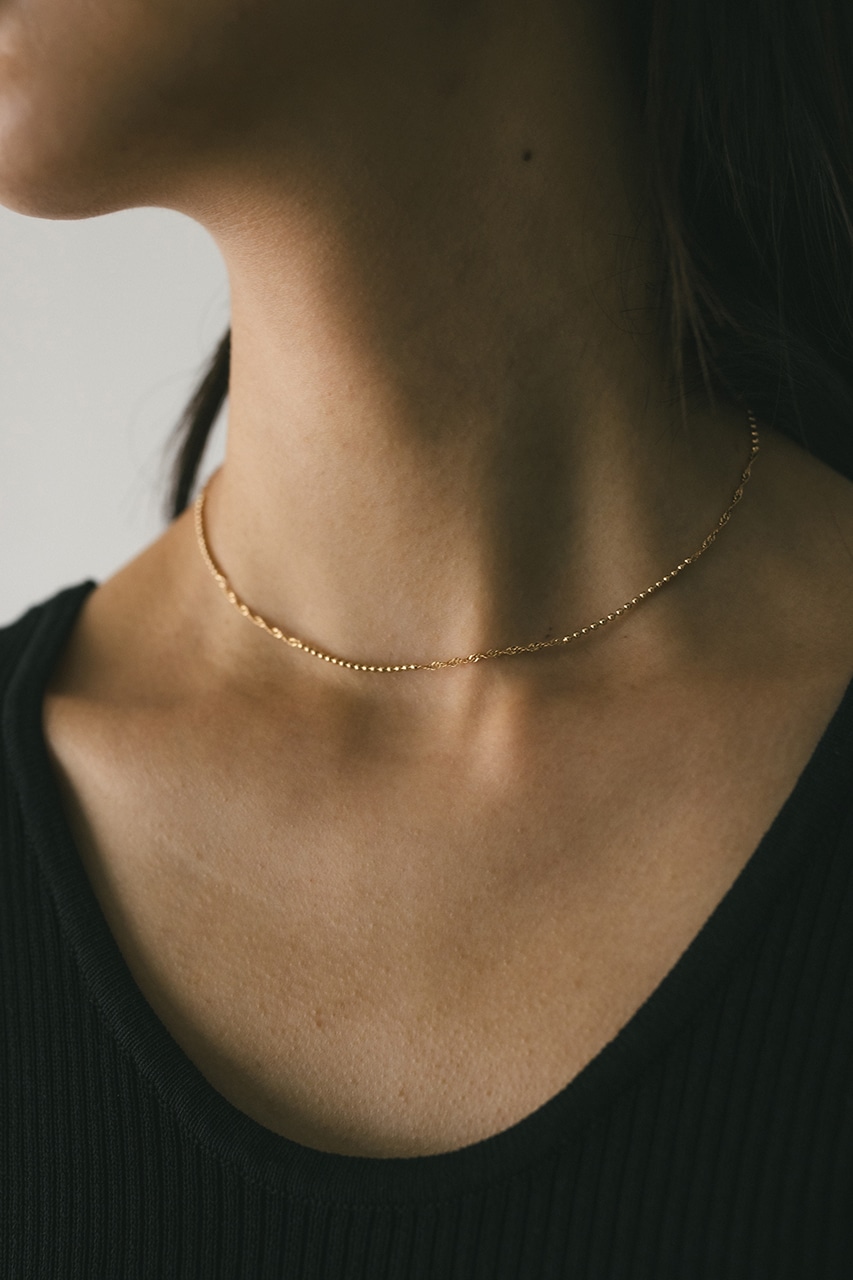 華奢なデザインのチェーンネックレス。シンプルながら首元を明るい印象に導きます。