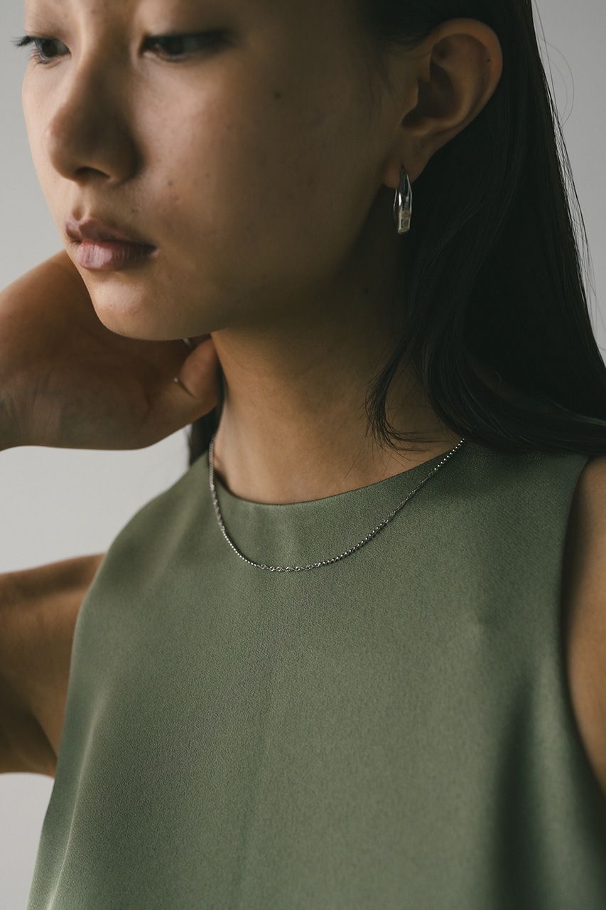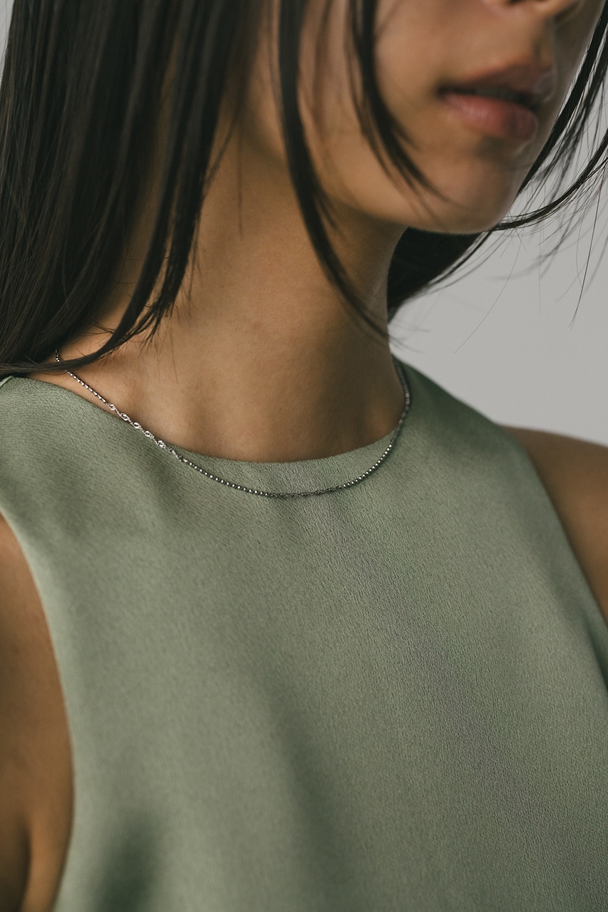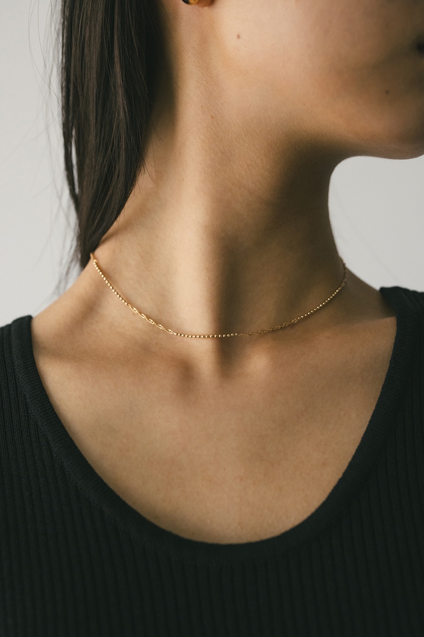 華奢なデザインのチェーンネックレス。シンプルながら首元を明るい印象に導きます。