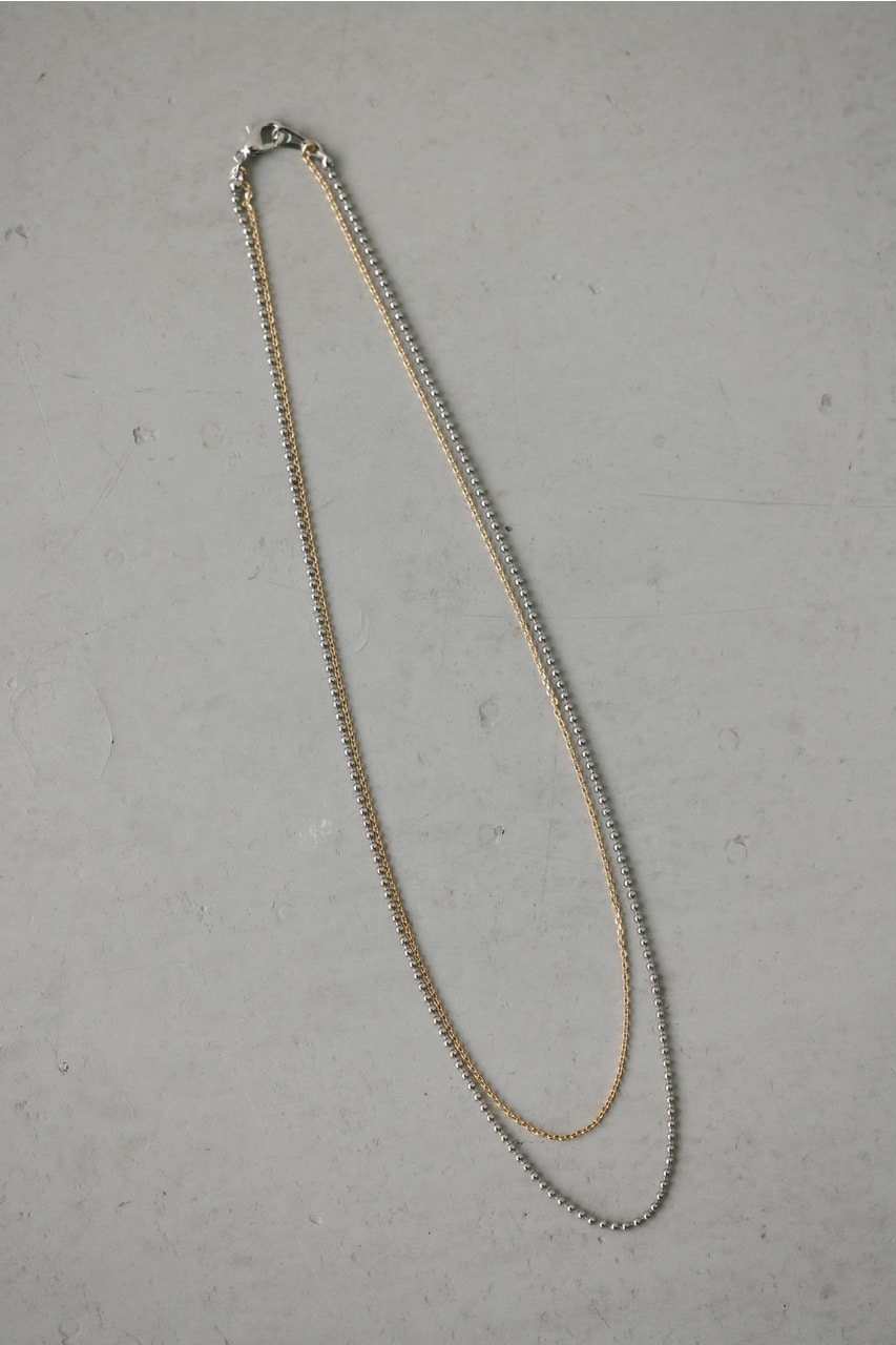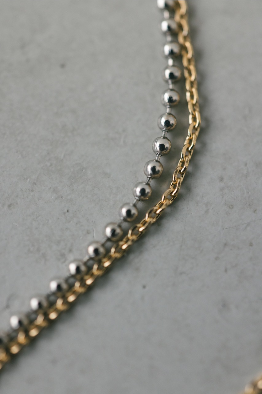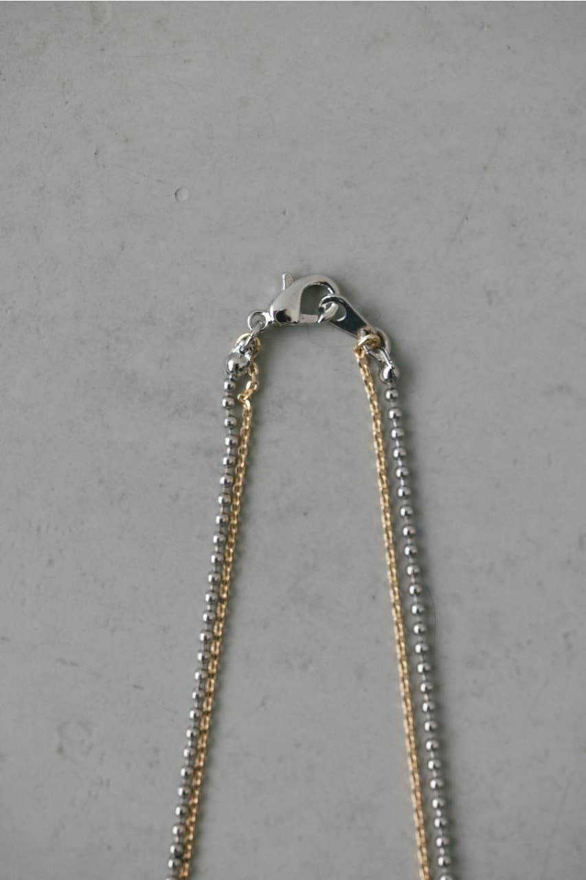 ゴールドとシルバーが2連になったネックレス。1つで重ね付け見えが叶います。