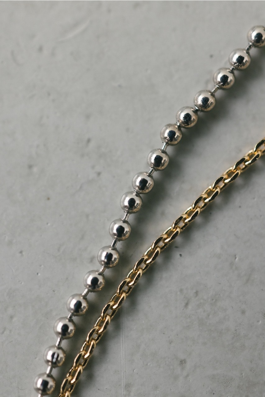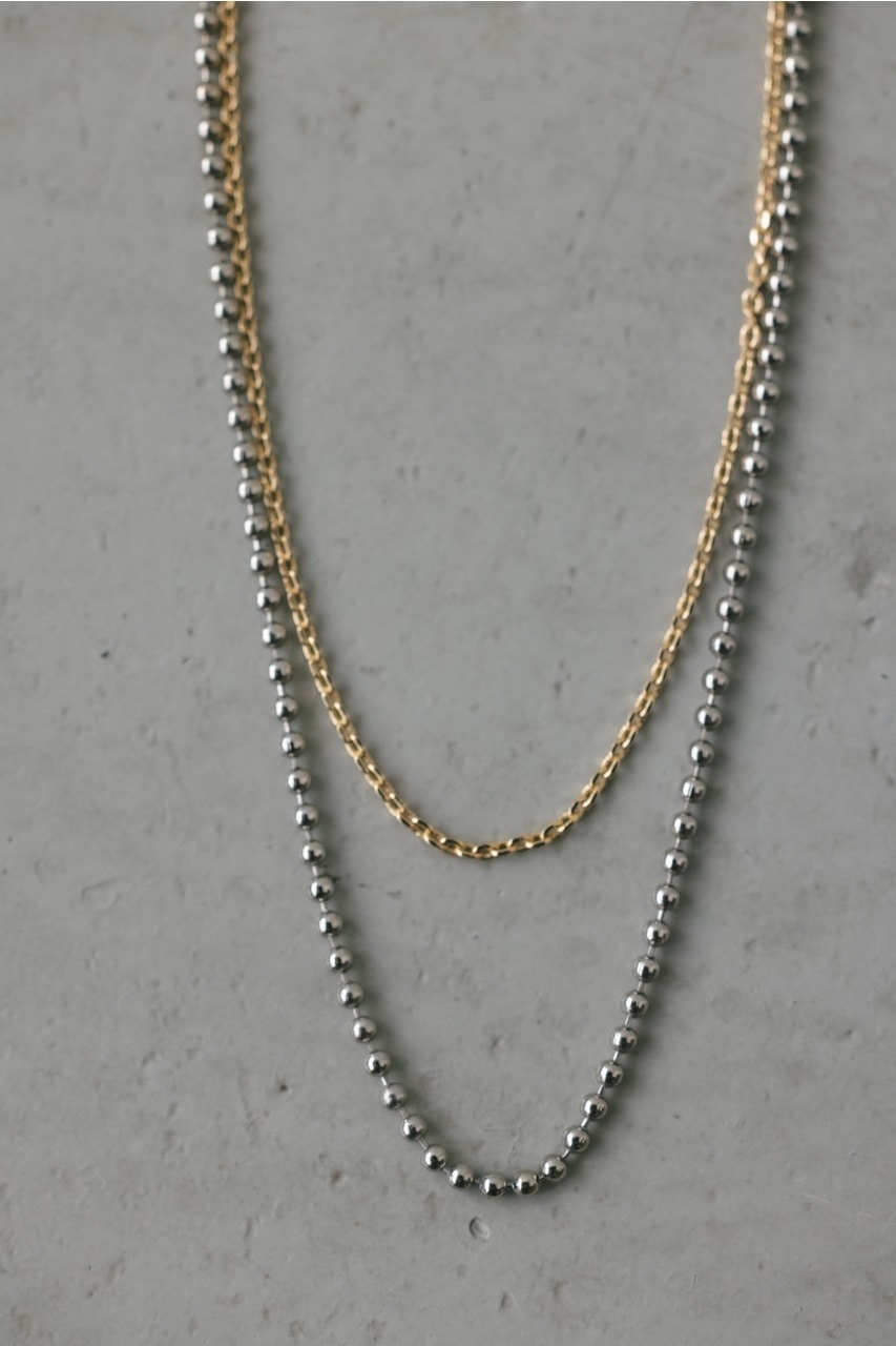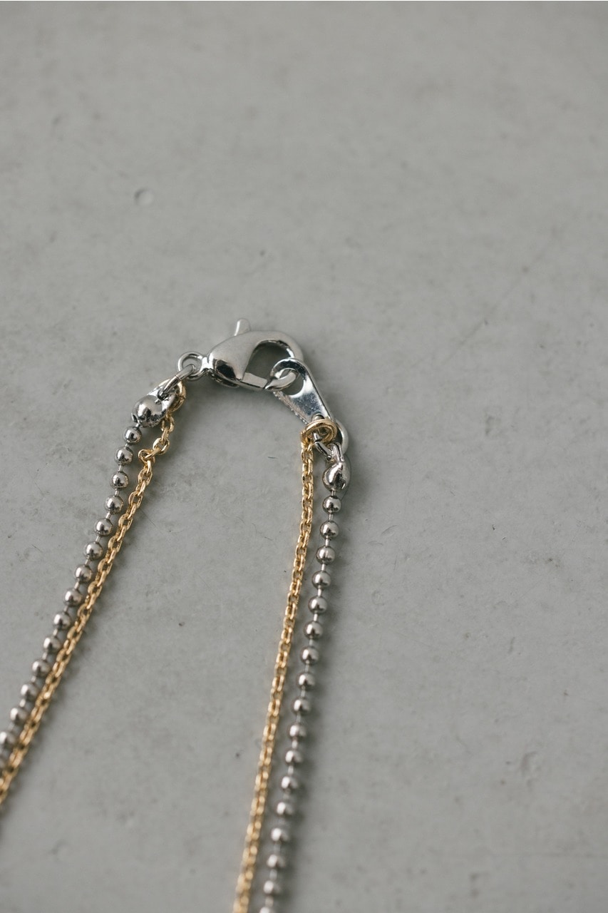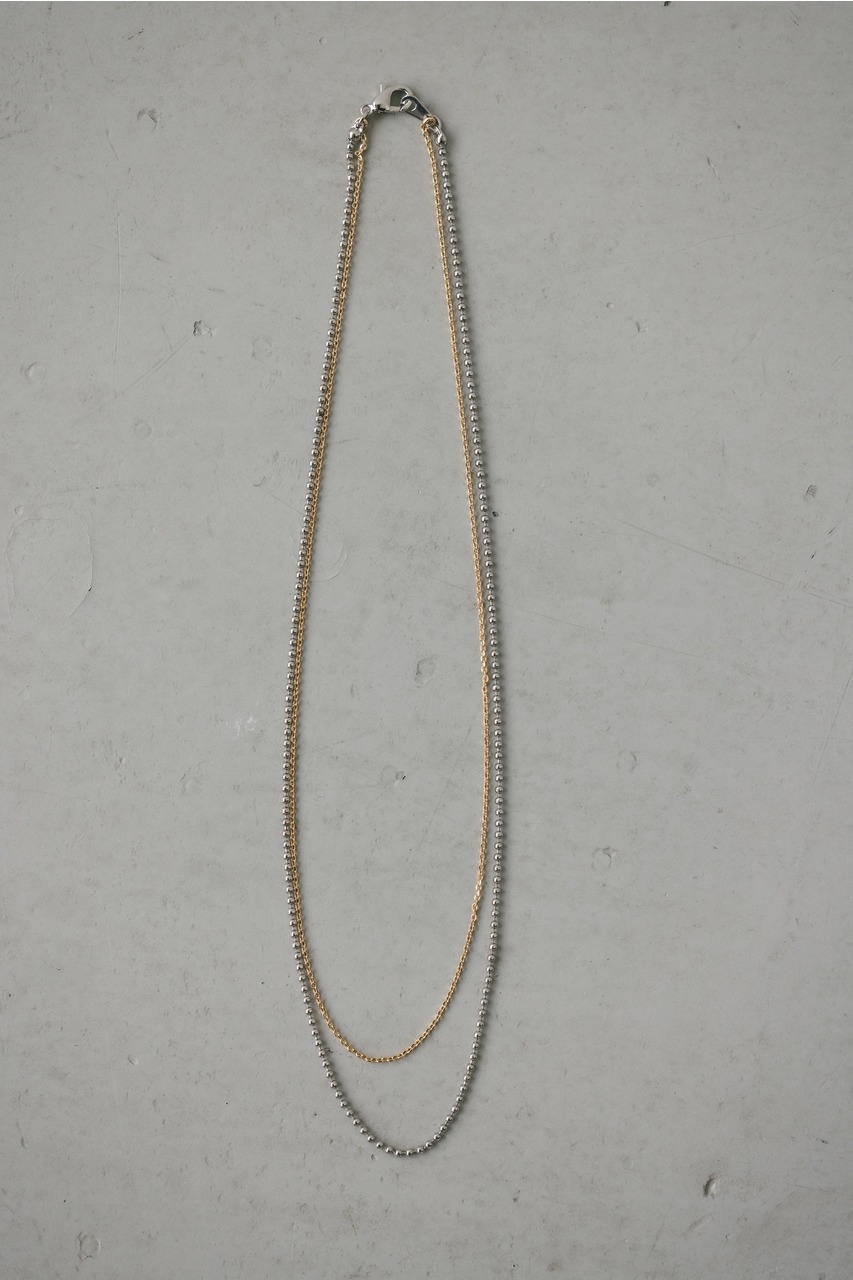 ゴールドとシルバーが2連になったネックレス。1つで重ね付け見えが叶います。