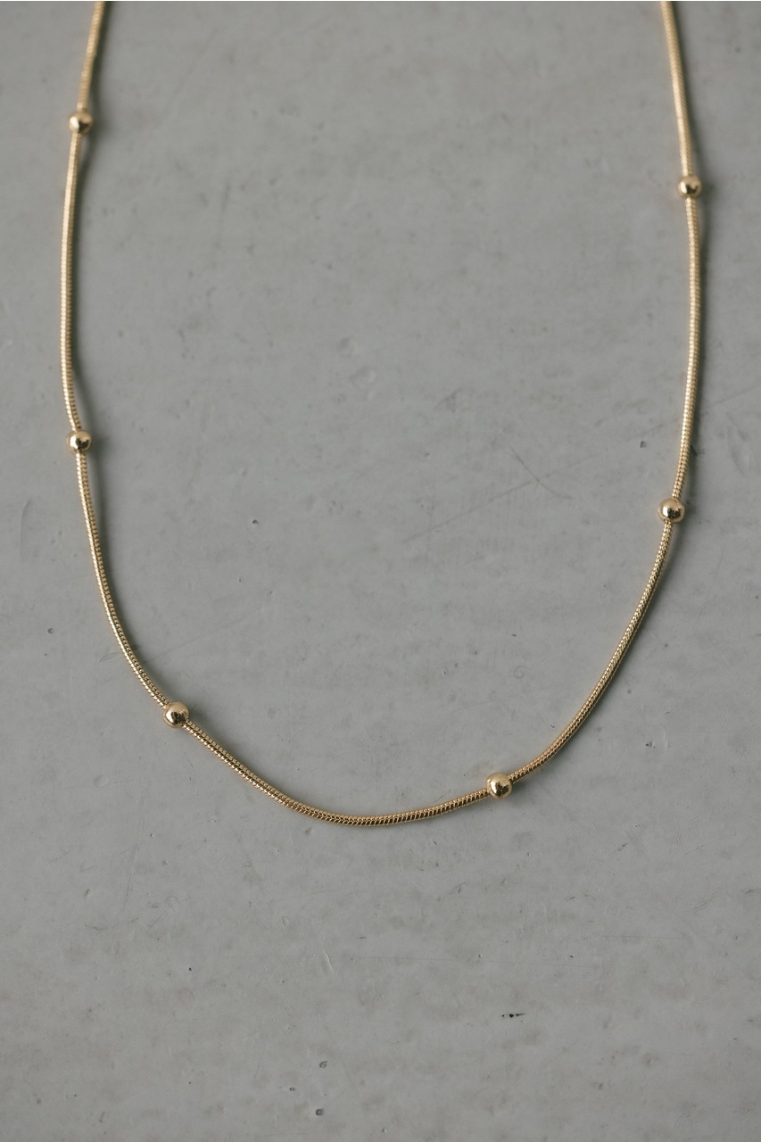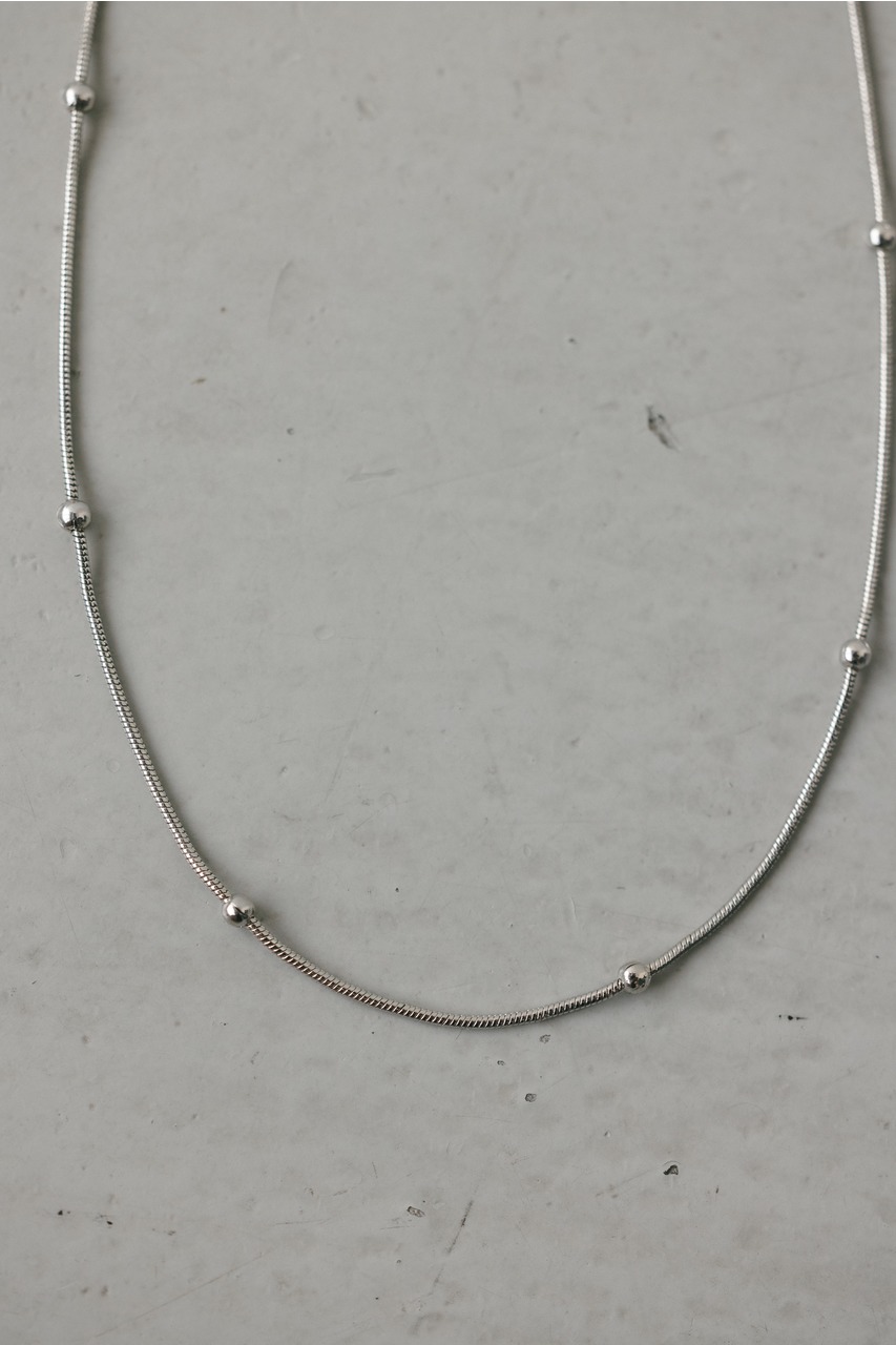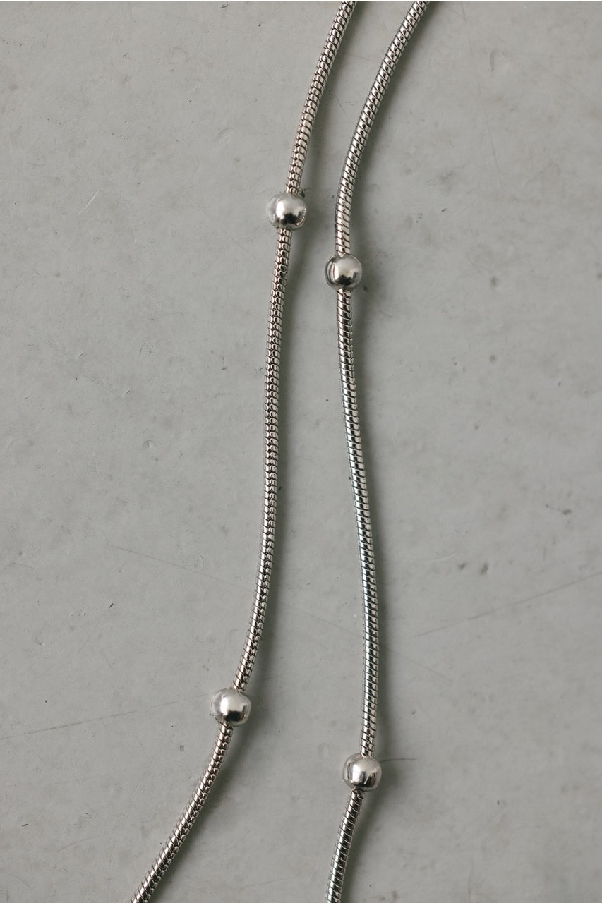 シンプルながら存在感のあるボールネックレス。首元を明るい印象に導きます。
