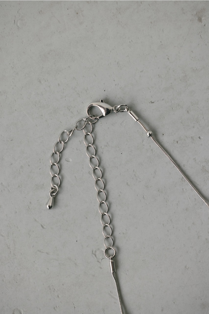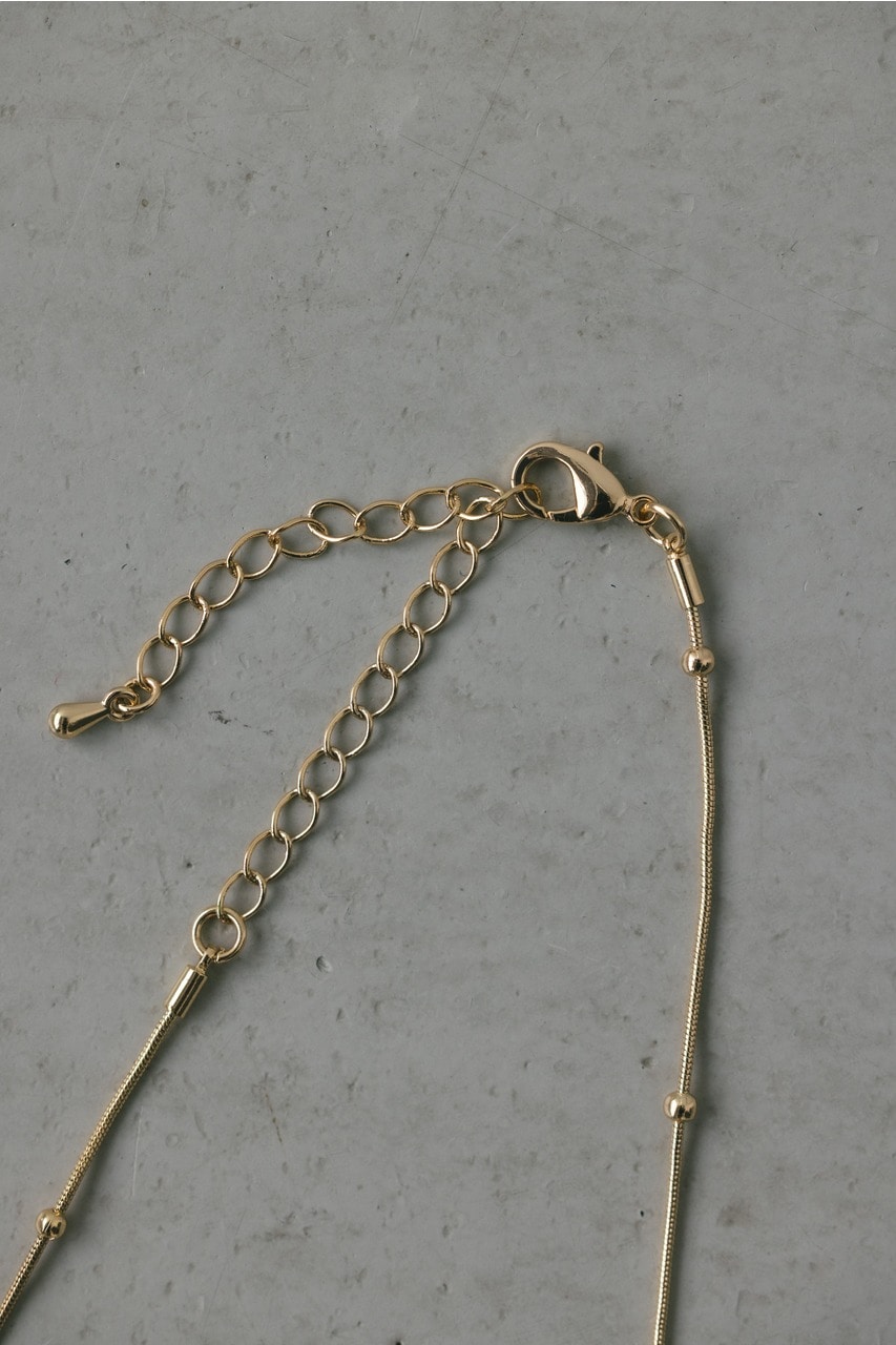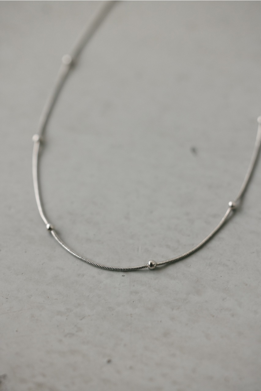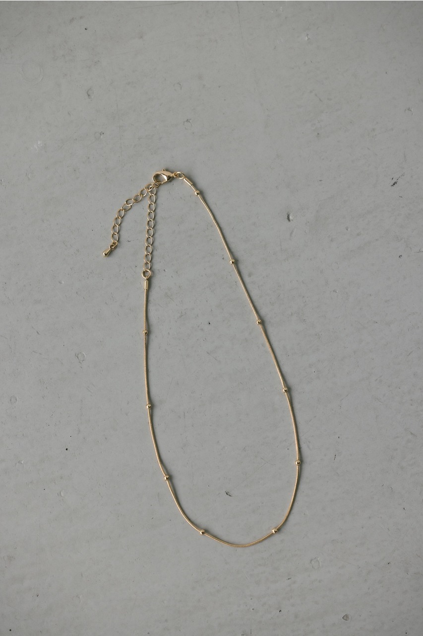 シンプルながら存在感のあるボールネックレス。首元を明るい印象に導きます。