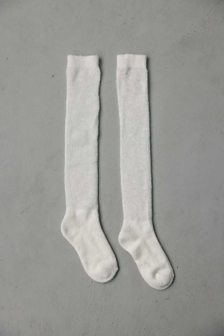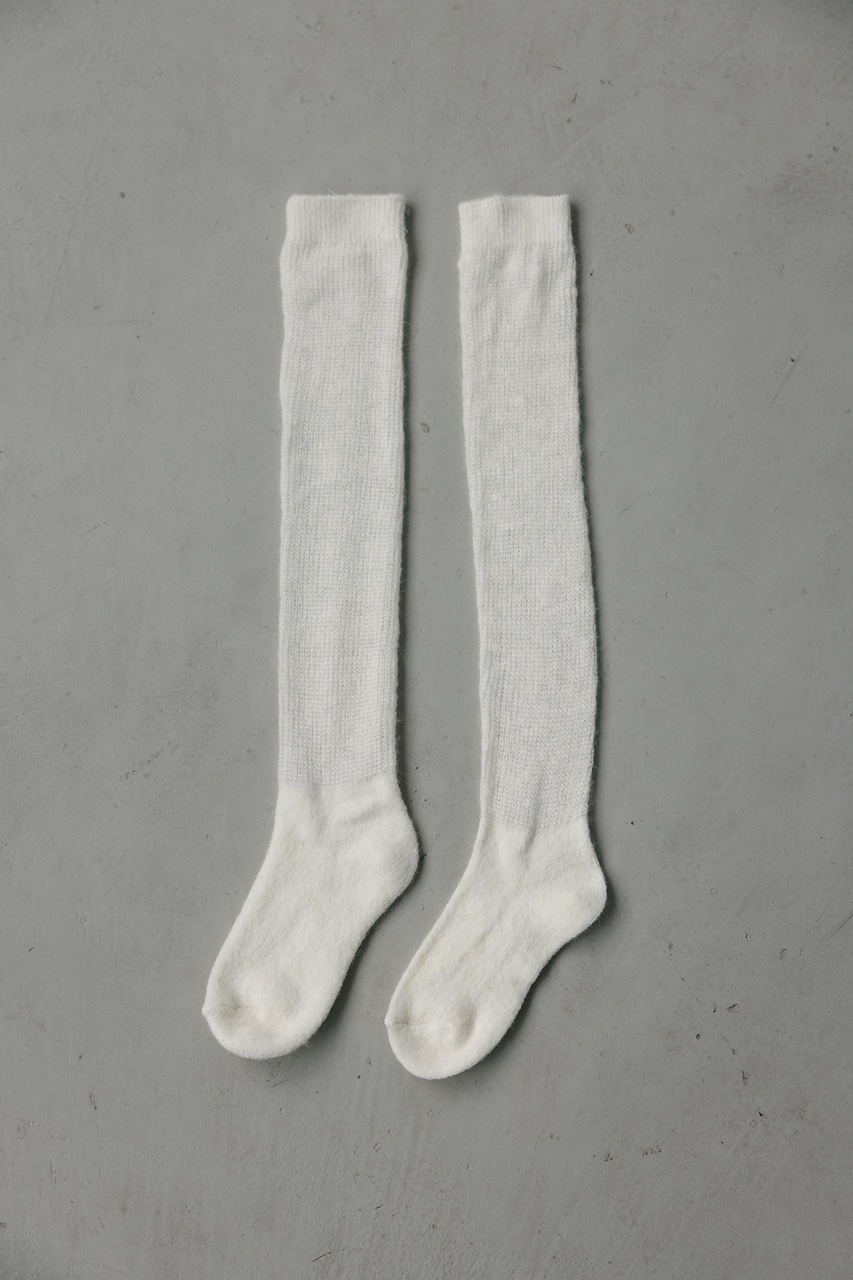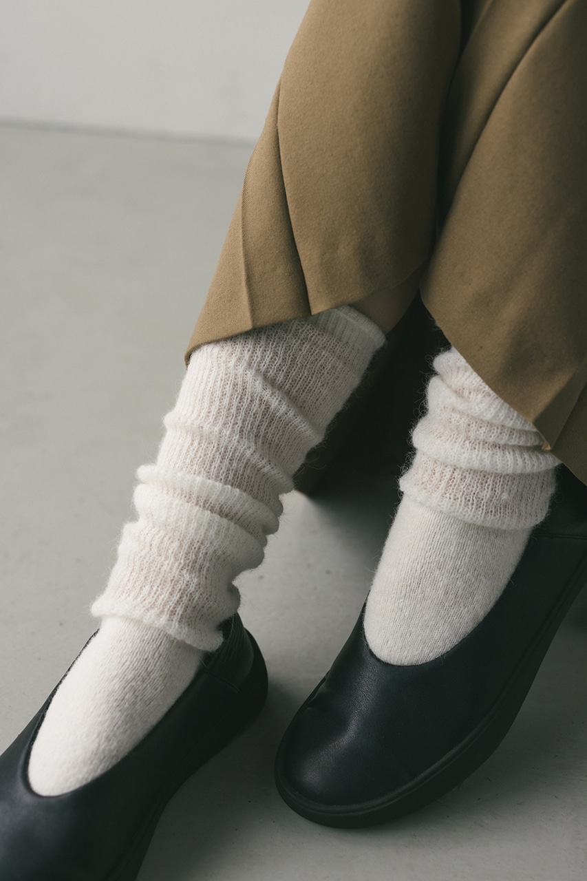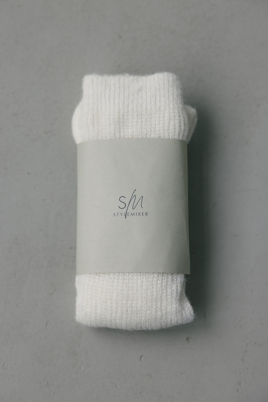 柔らかな糸を使用したリブハイソックス。単品ではもちろん、タイツやソックスとレイヤードして履くとよりトレンド感のあるスタイリングを楽しめます。