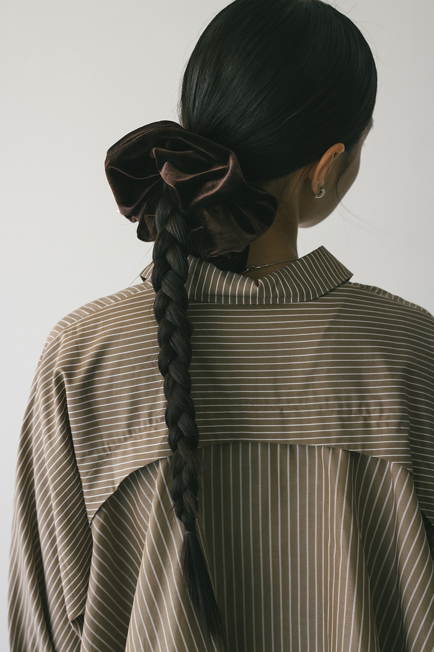 滑らかな光沢感のあるベロアシュシュ。手軽にヘアアレンジを楽しめるアイテムです。