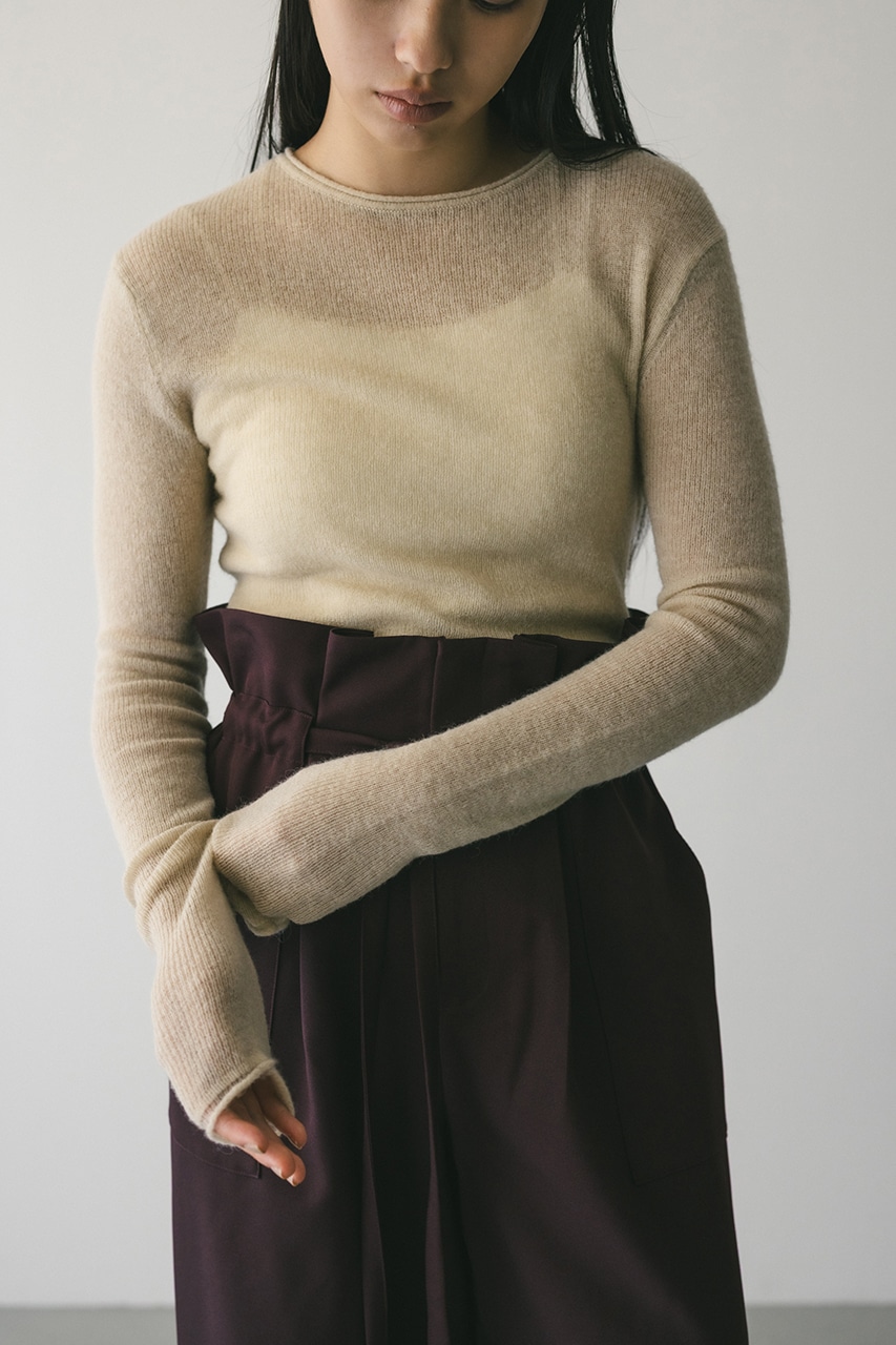 毛吹き素材の表情感が特徴的なロングスリーブニット。襟ぐり、袖口、裾にディテールを入れた上品見えする一枚。一枚ではもちろん、インナーレイヤードアイテムとしてもおすすめです。ストレッチあり、透け感あり。