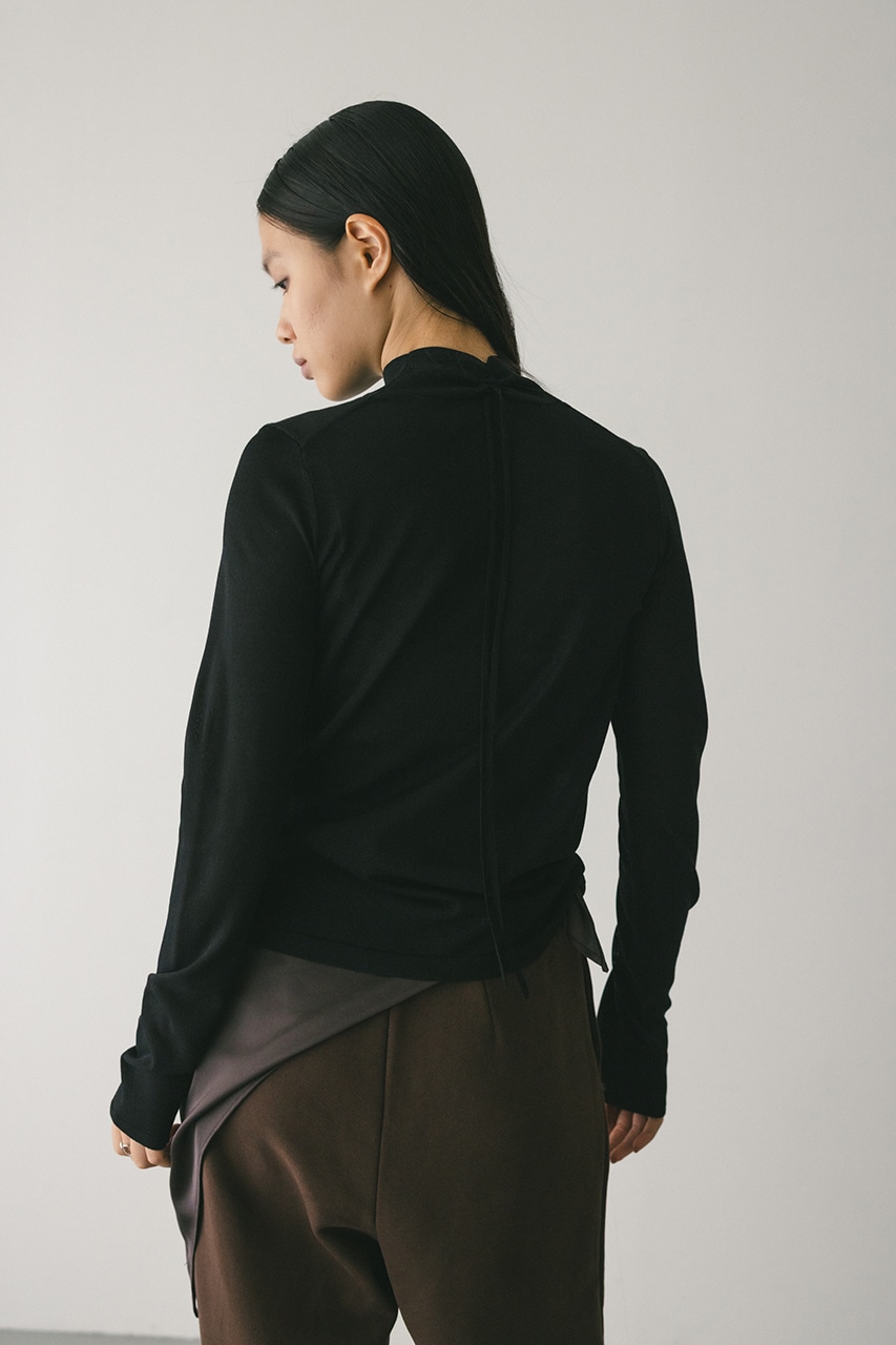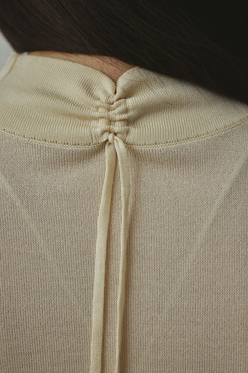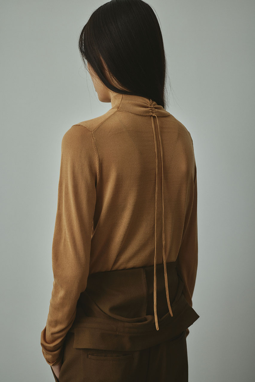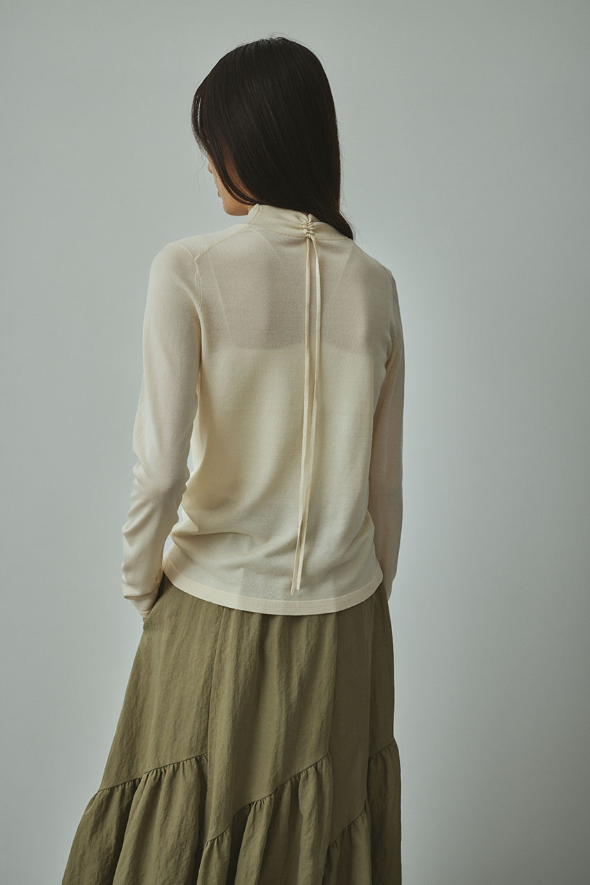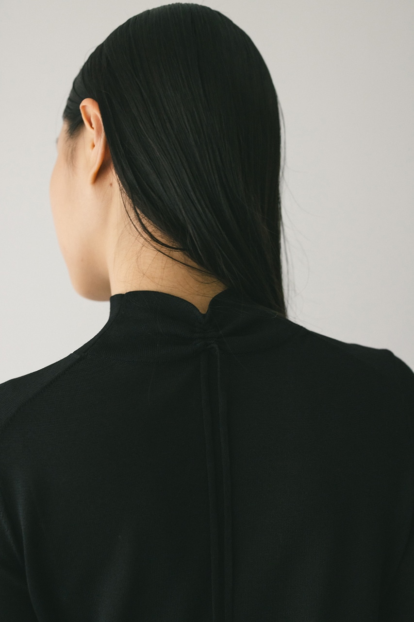 スタミキ定番人気のバックストリングデザインがポイントのニット。首に綺麗に沿うモックネックに施されたバックストリングデザインがモードで上品さを際立たせます。14Gのハイゲージで編みたてているので肌触りもよく、綺麗めにもカジュアルにも着用頂けます。透け感ややあり、ストレッチあり。