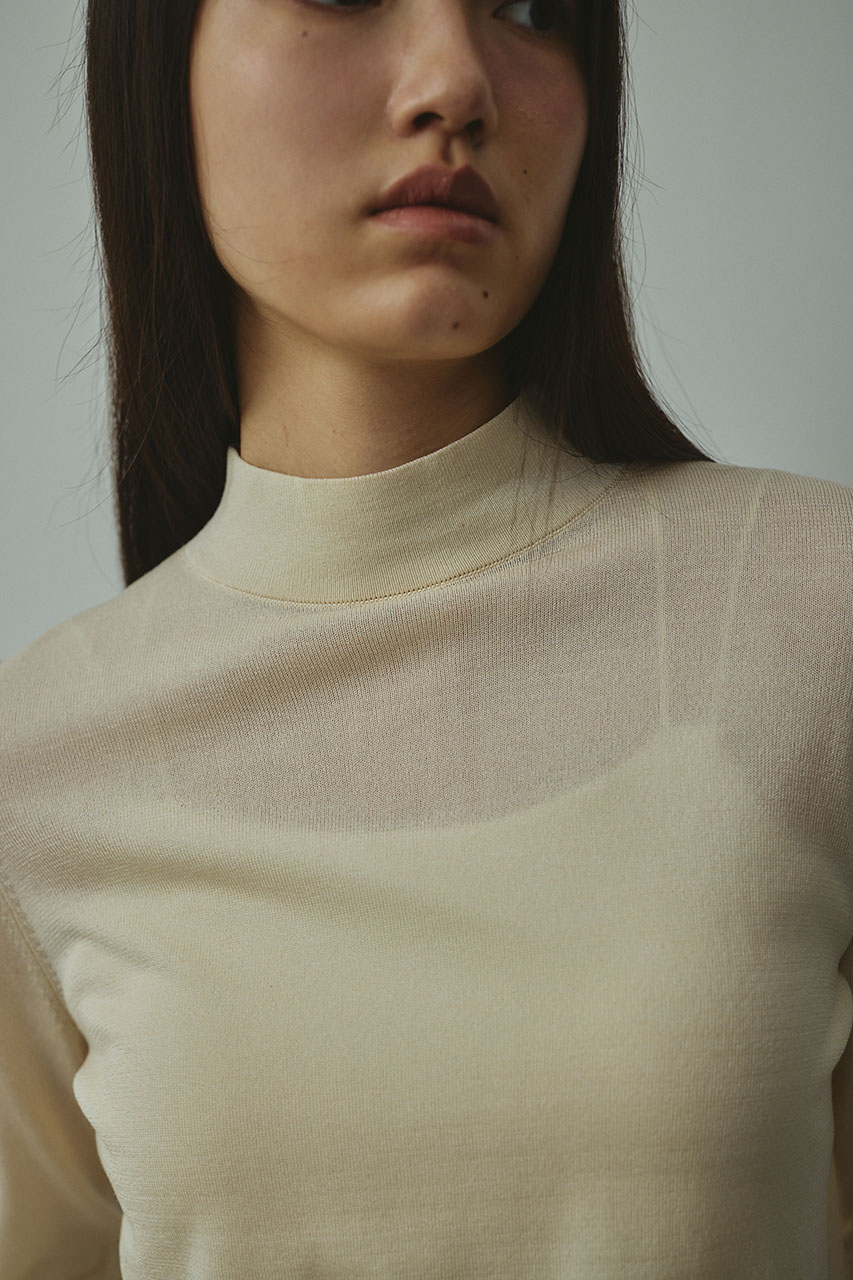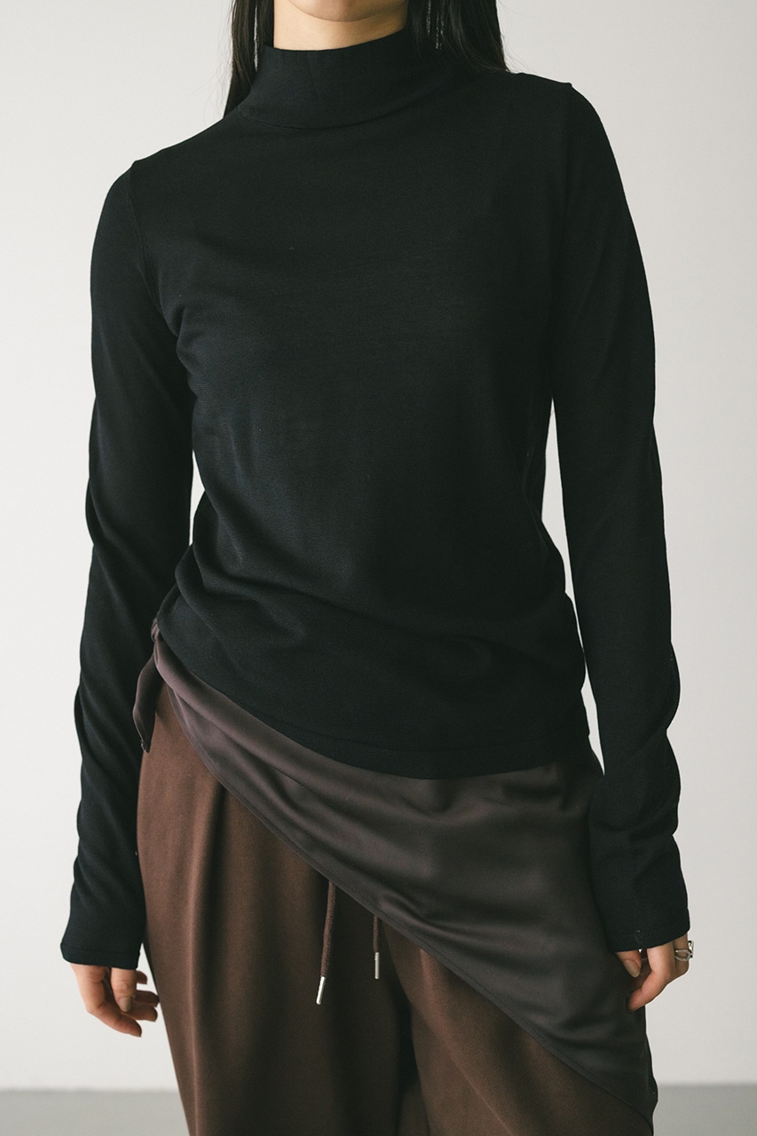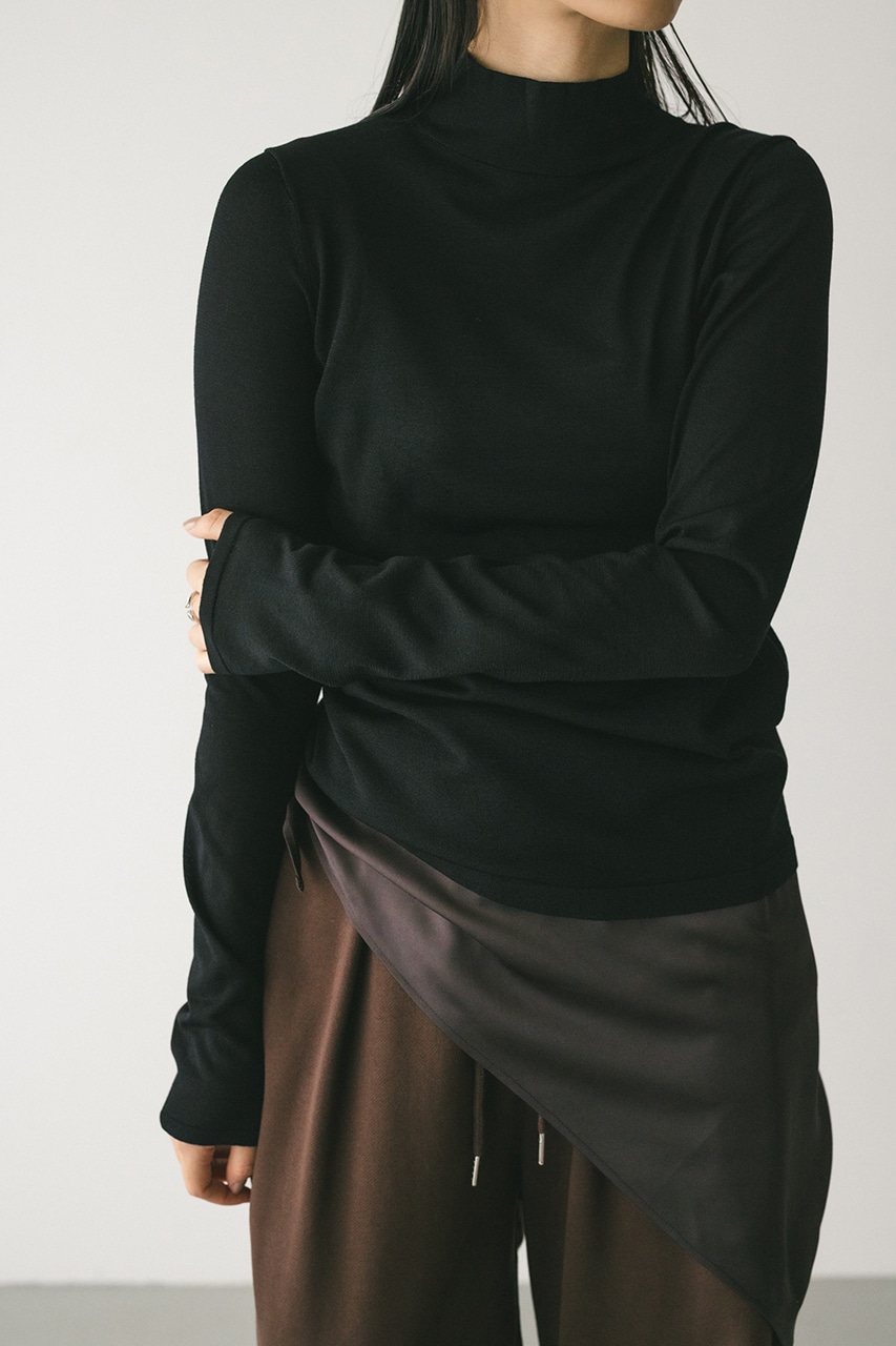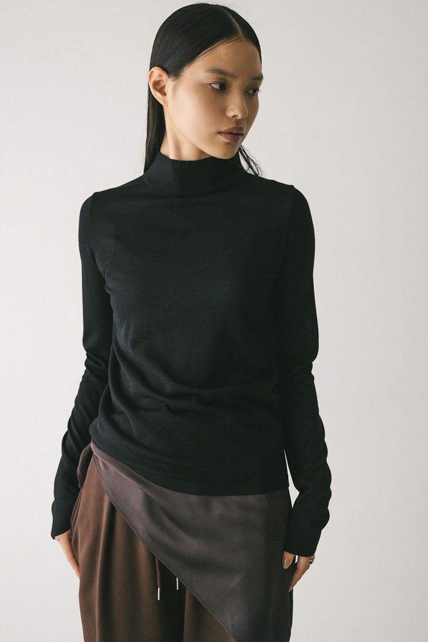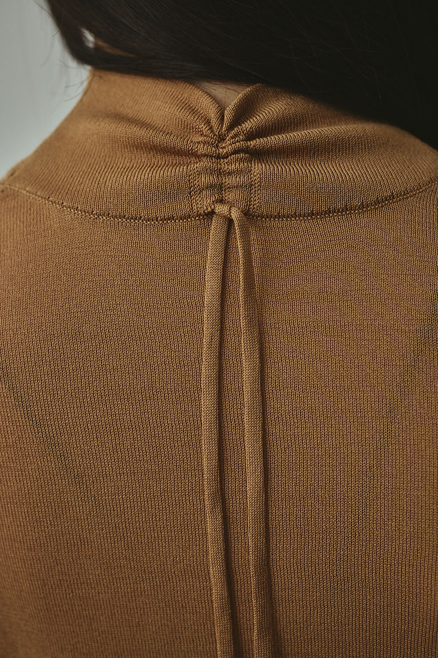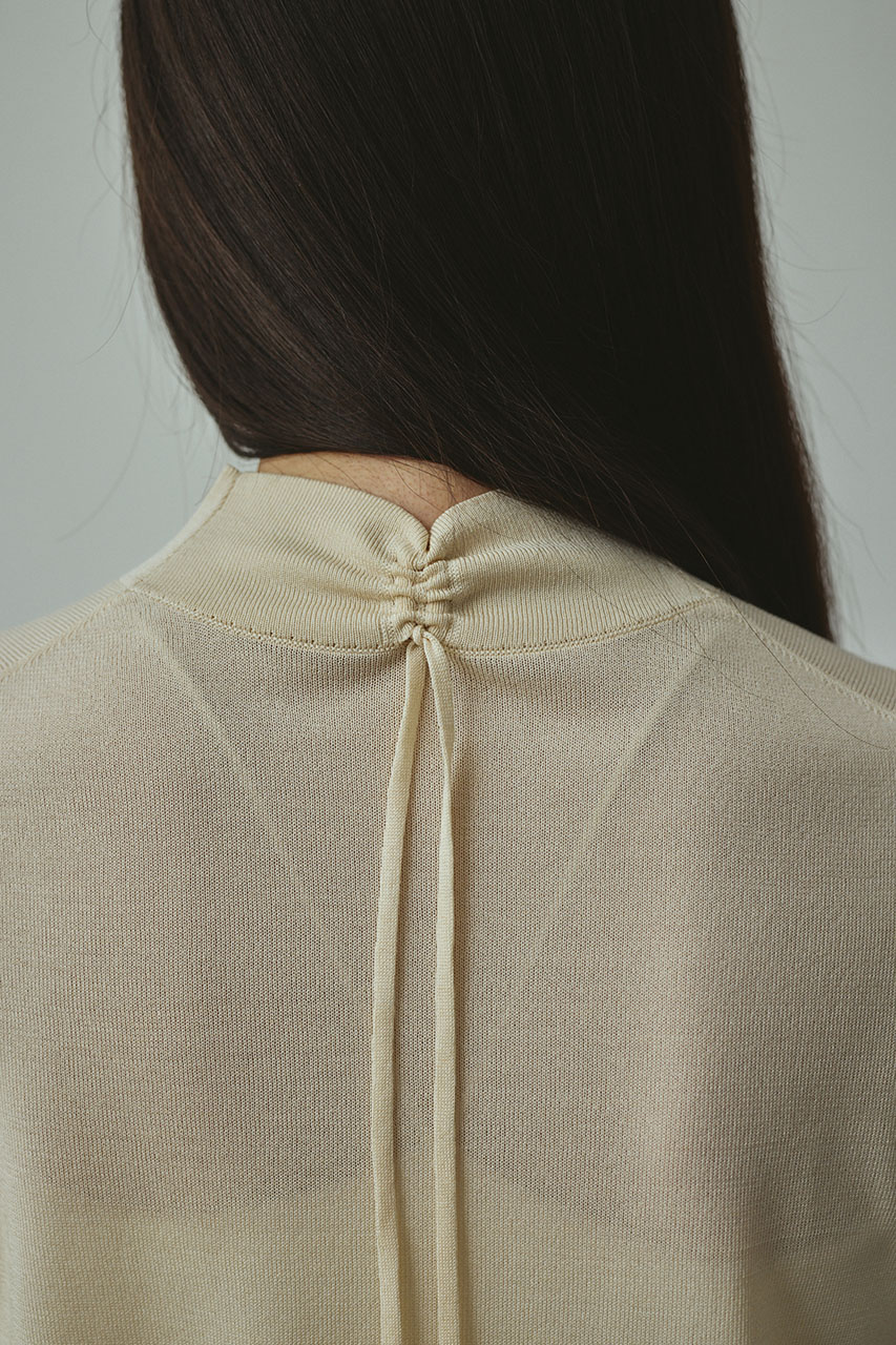 スタミキ定番人気のバックストリングデザインがポイントのニット。首に綺麗に沿うモックネックに施されたバックストリングデザインがモードで上品さを際立たせます。14Gのハイゲージで編みたてているので肌触りもよく、綺麗めにもカジュアルにも着用頂けます。透け感ややあり、ストレッチあり。