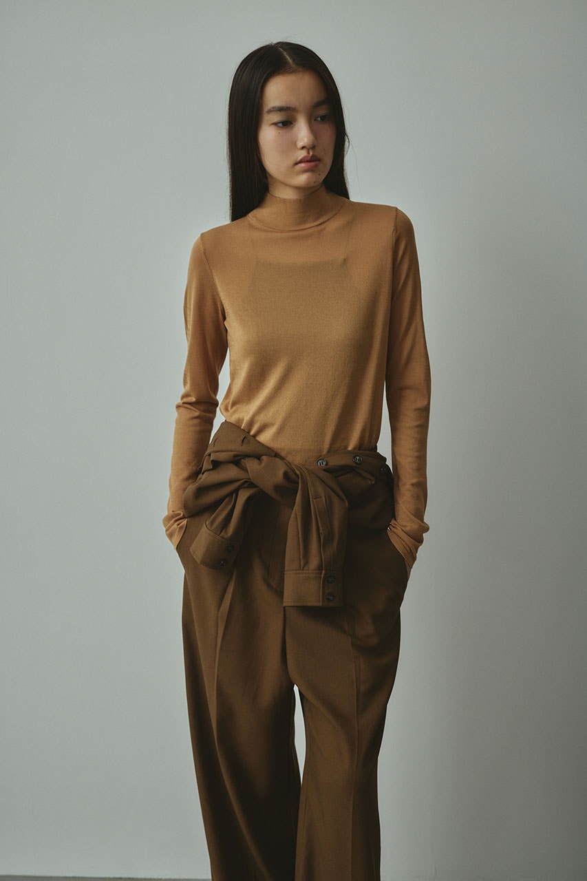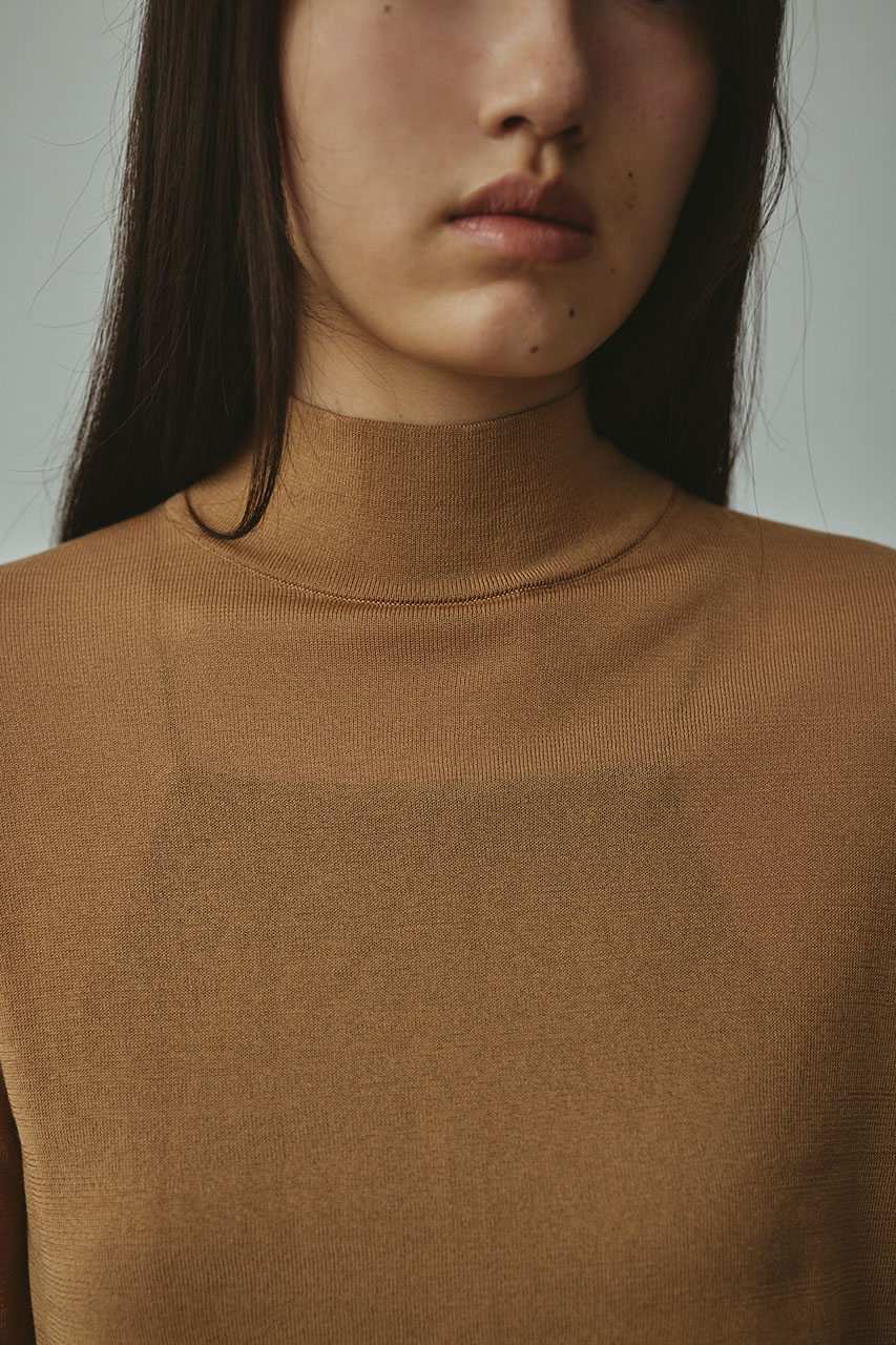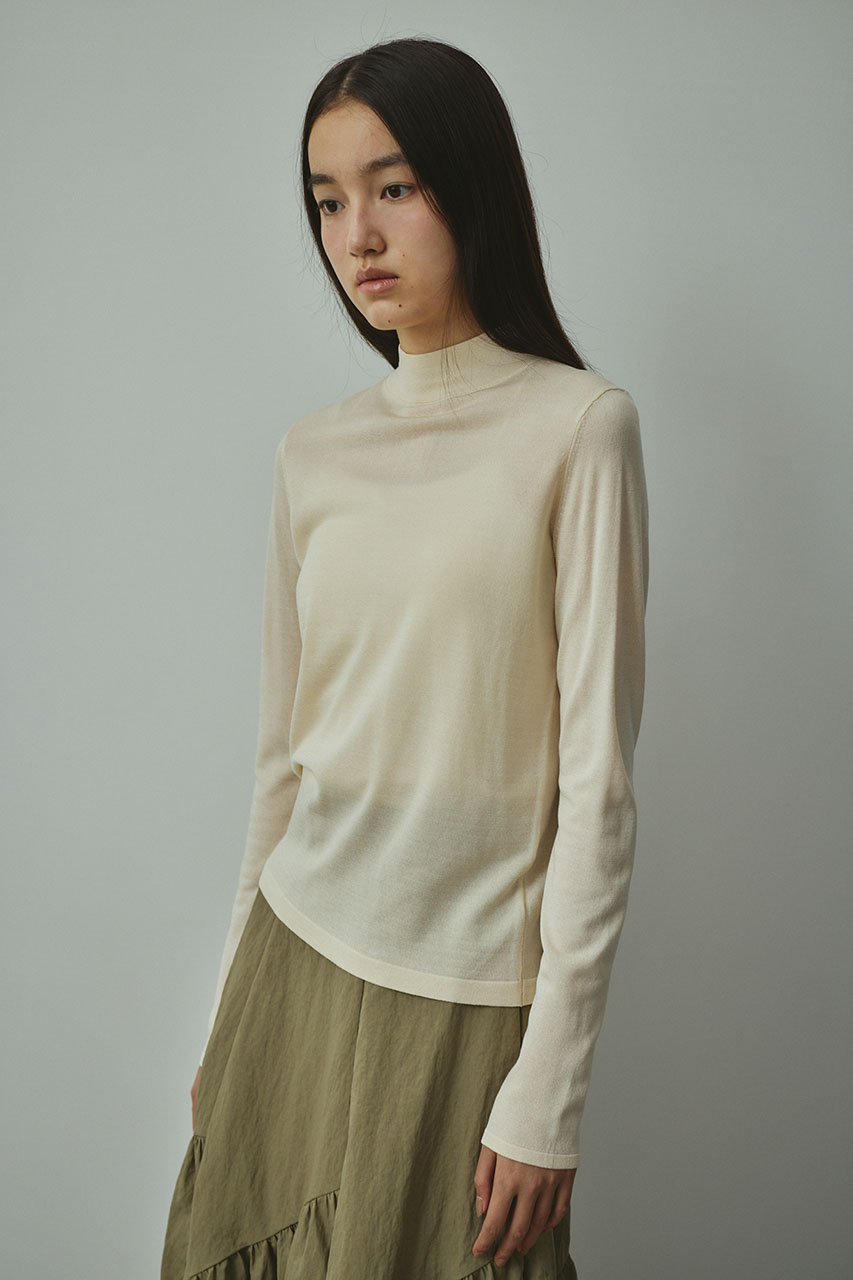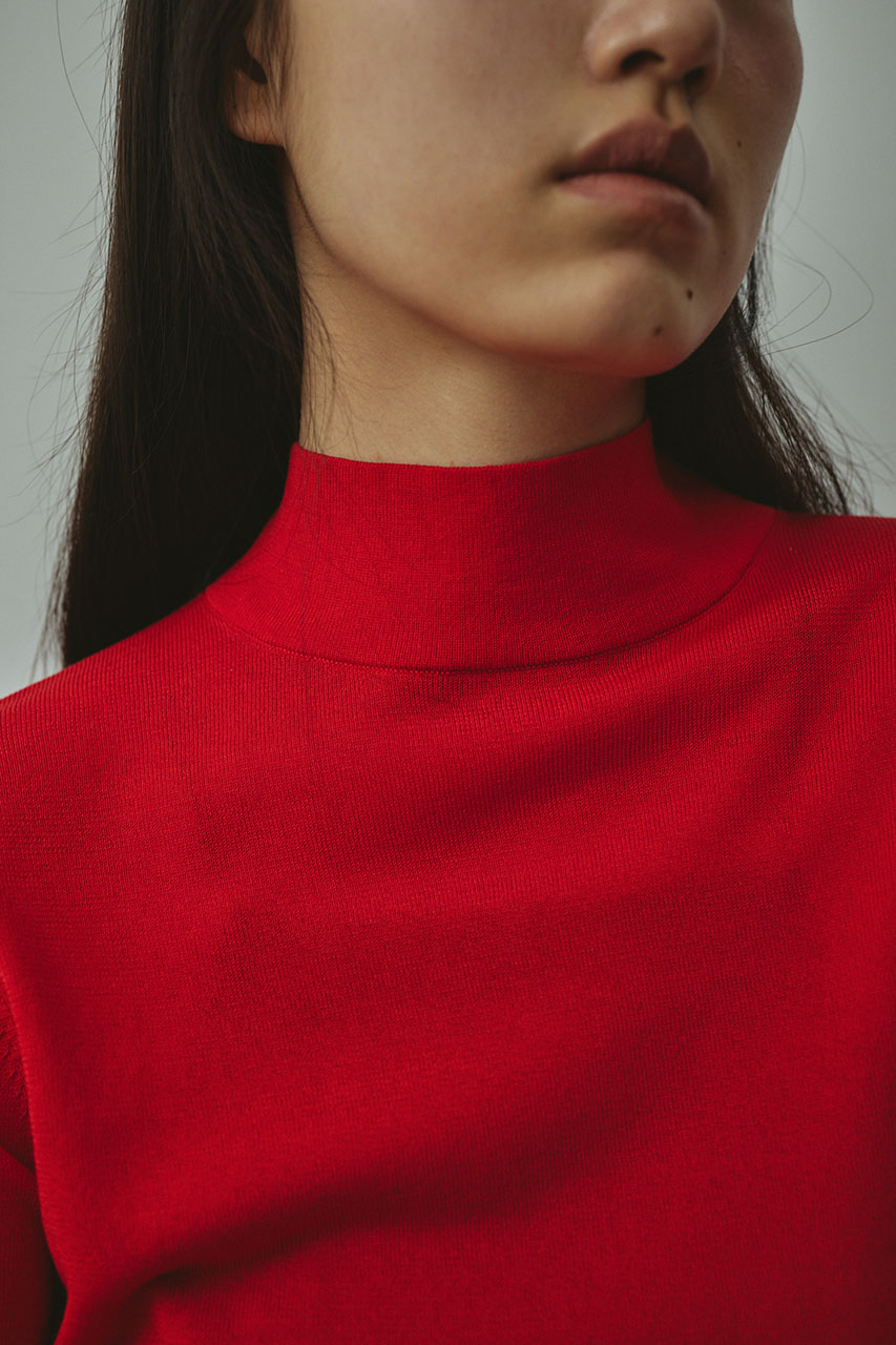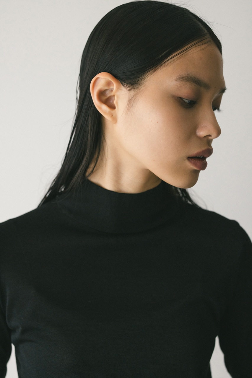 スタミキ定番人気のバックストリングデザインがポイントのニット。首に綺麗に沿うモックネックに施されたバックストリングデザインがモードで上品さを際立たせます。14Gのハイゲージで編みたてているので肌触りもよく、綺麗めにもカジュアルにも着用頂けます。透け感ややあり、ストレッチあり。