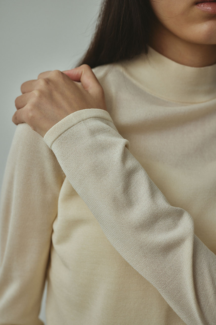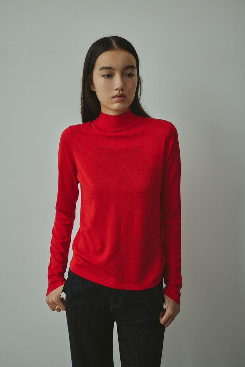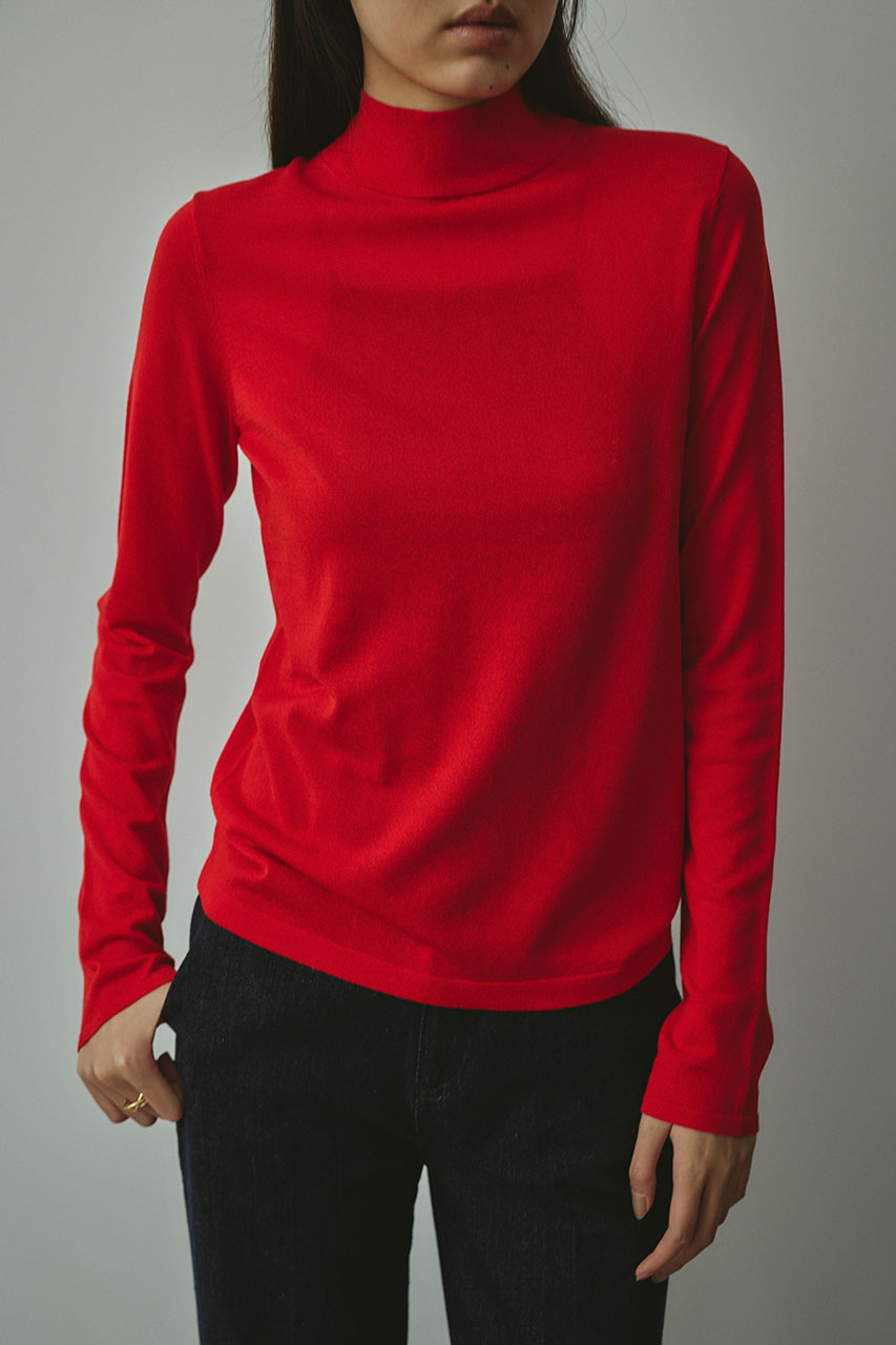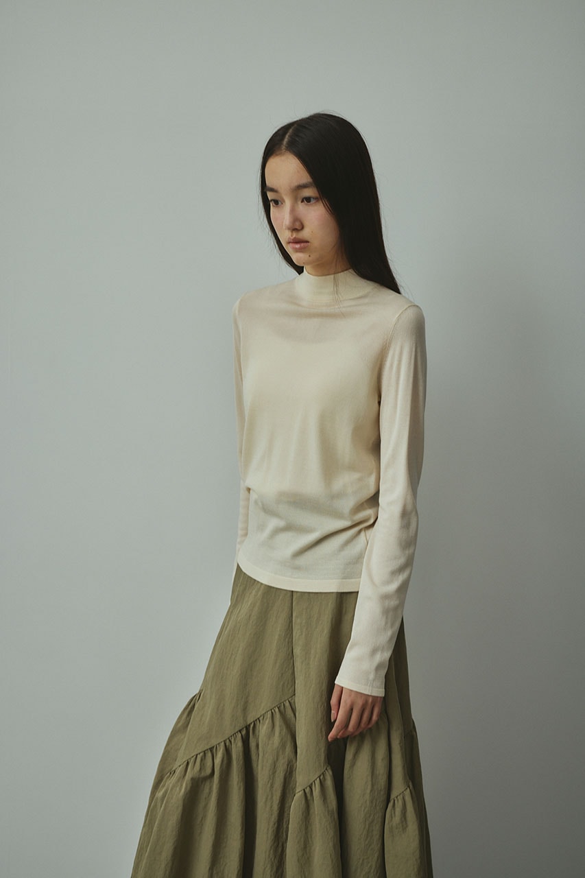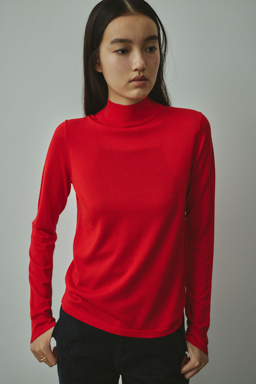 スタミキ定番人気のバックストリングデザインがポイントのニット。首に綺麗に沿うモックネックに施されたバックストリングデザインがモードで上品さを際立たせます。14Gのハイゲージで編みたてているので肌触りもよく、綺麗めにもカジュアルにも着用頂けます。透け感ややあり、ストレッチあり。